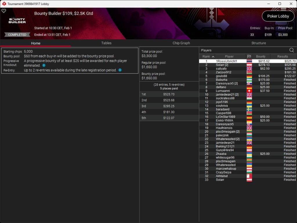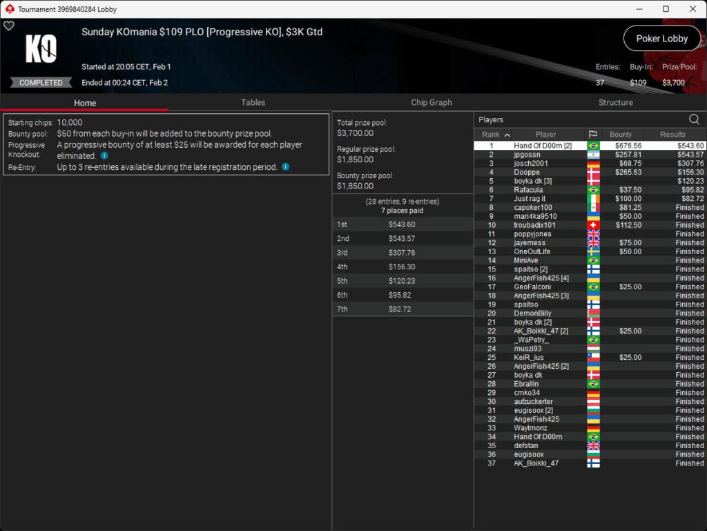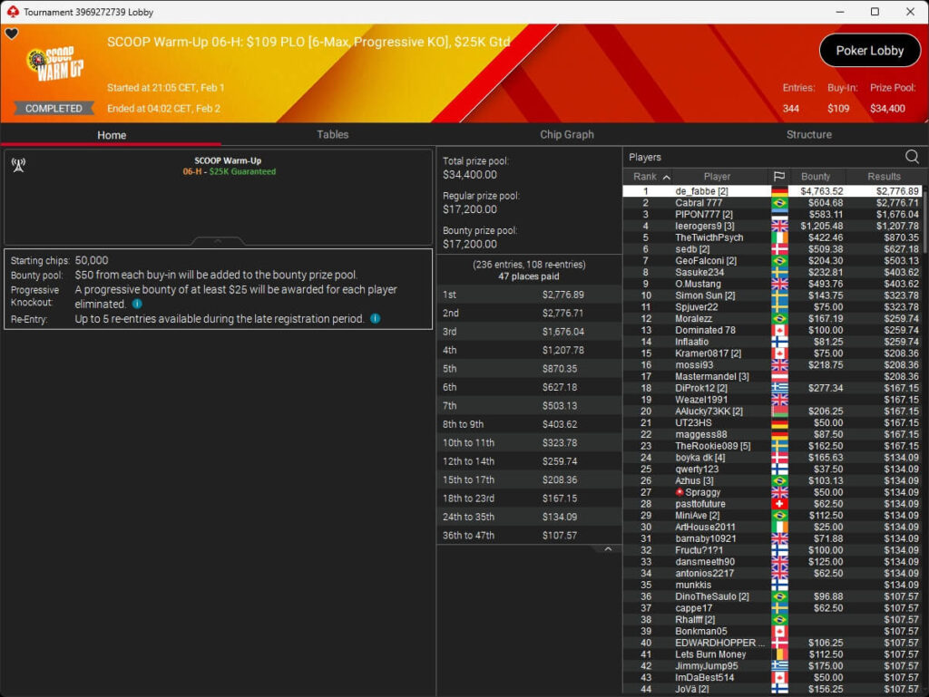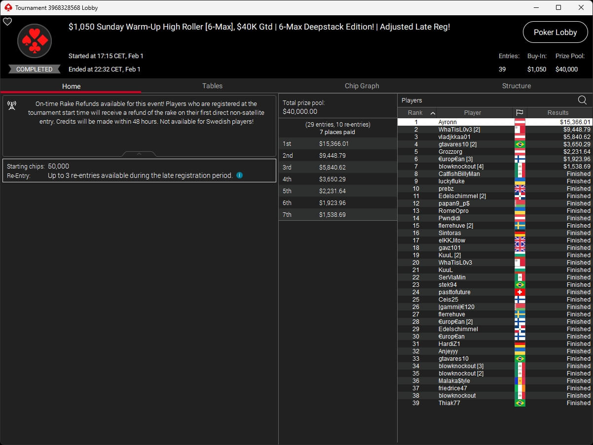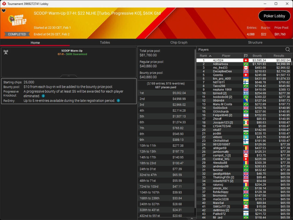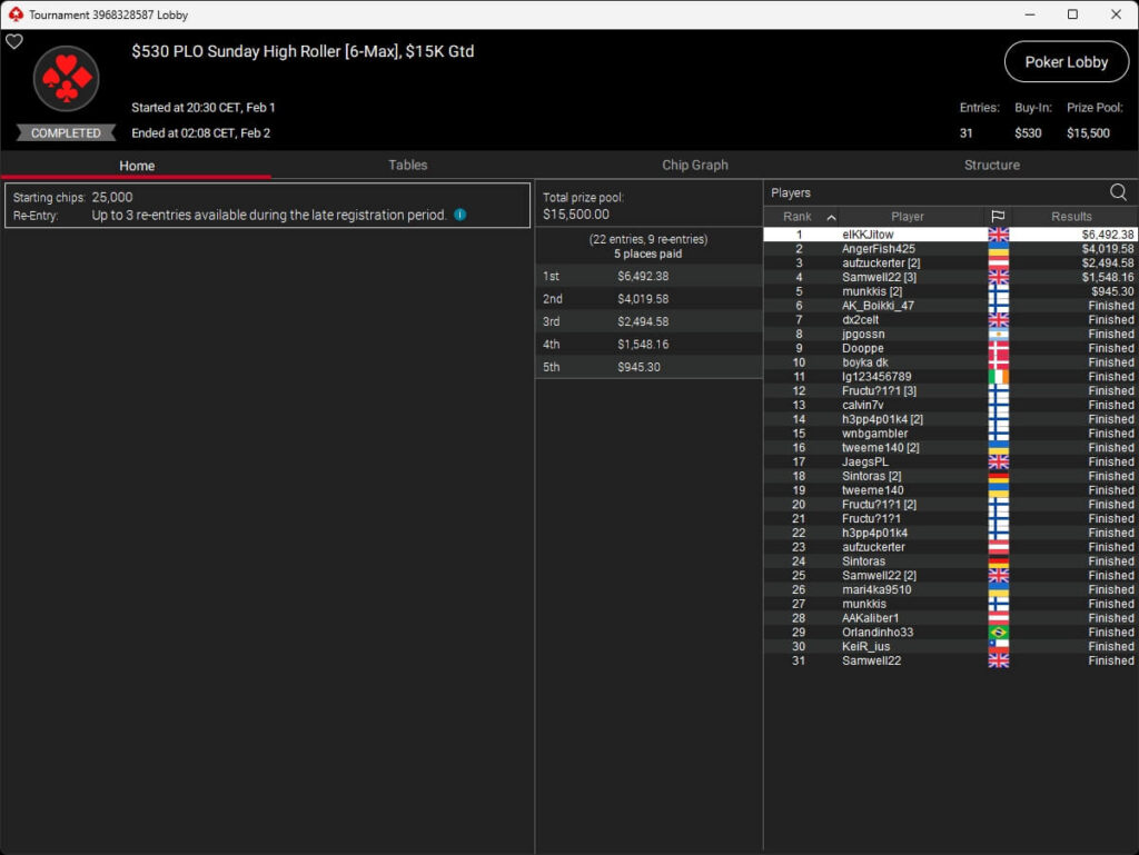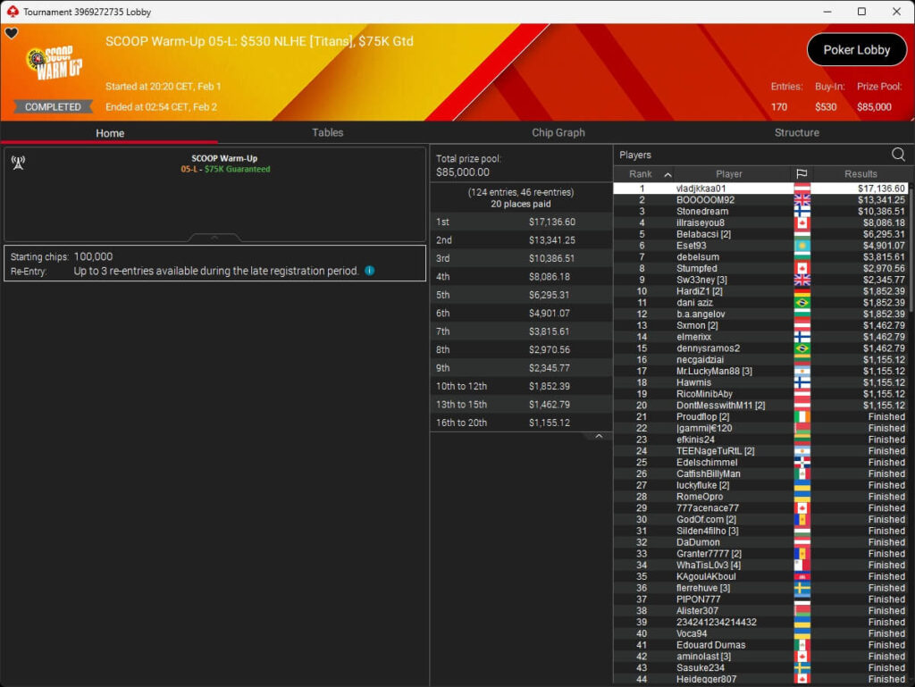Zu den weiteren Turniergewinnern gehörten vladjkkaa01 ($17.136,60; $530 Titans), superslide ($1.133,18 + $1.115,07; $11 PLO 6-Max PKO), de_fabbe ($2.776,89 + $4.763,52; $109 PLO 6-Max PKO) sowie ALVS24 ($5.002,04 + $3.595,34; $22 NLHE Turbo PKO).