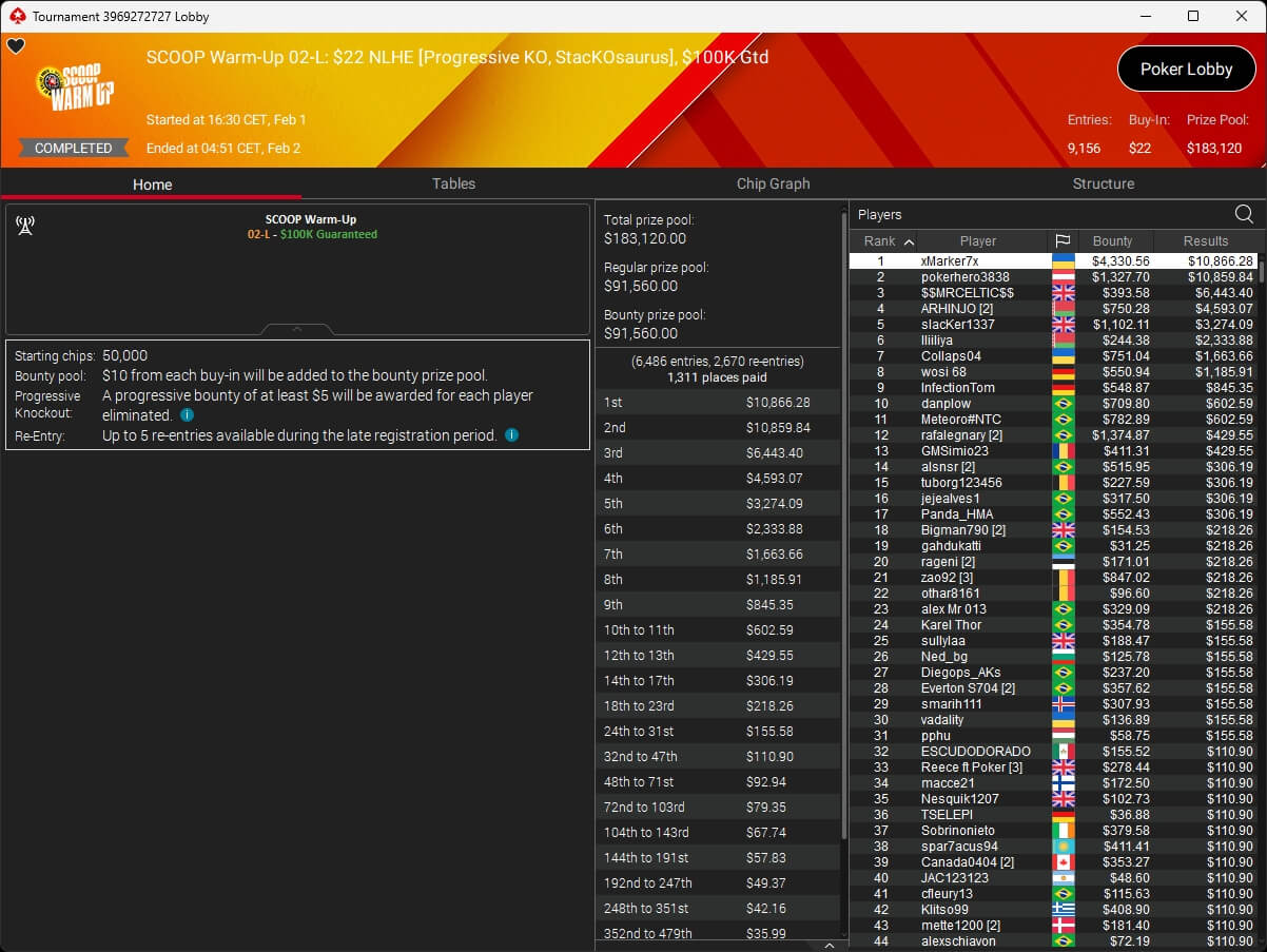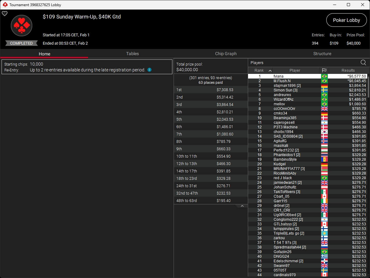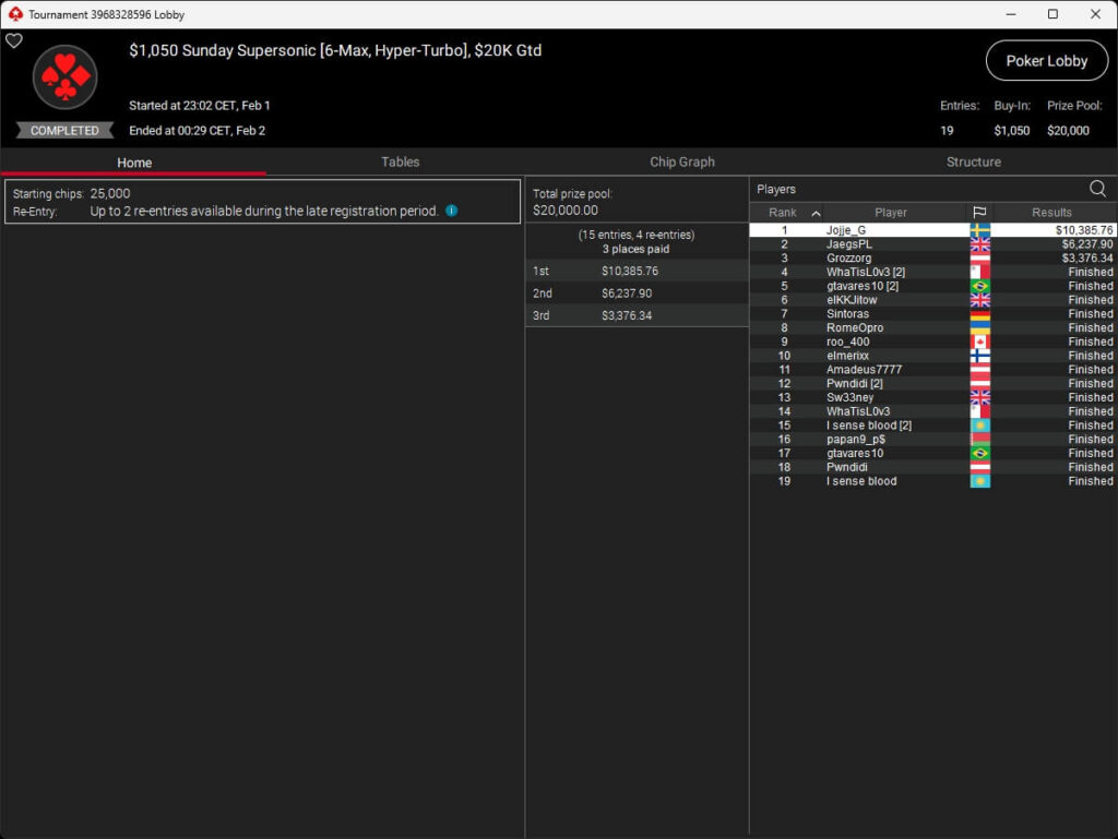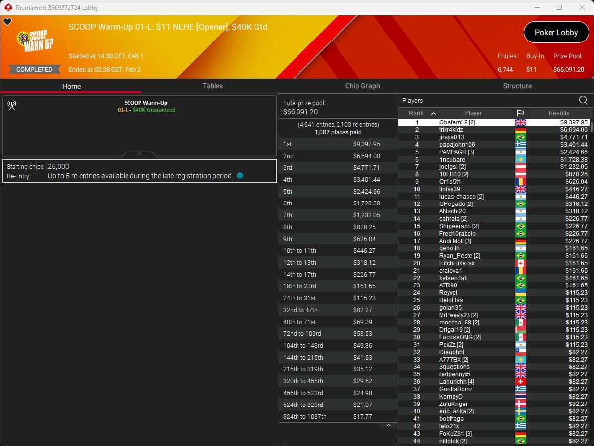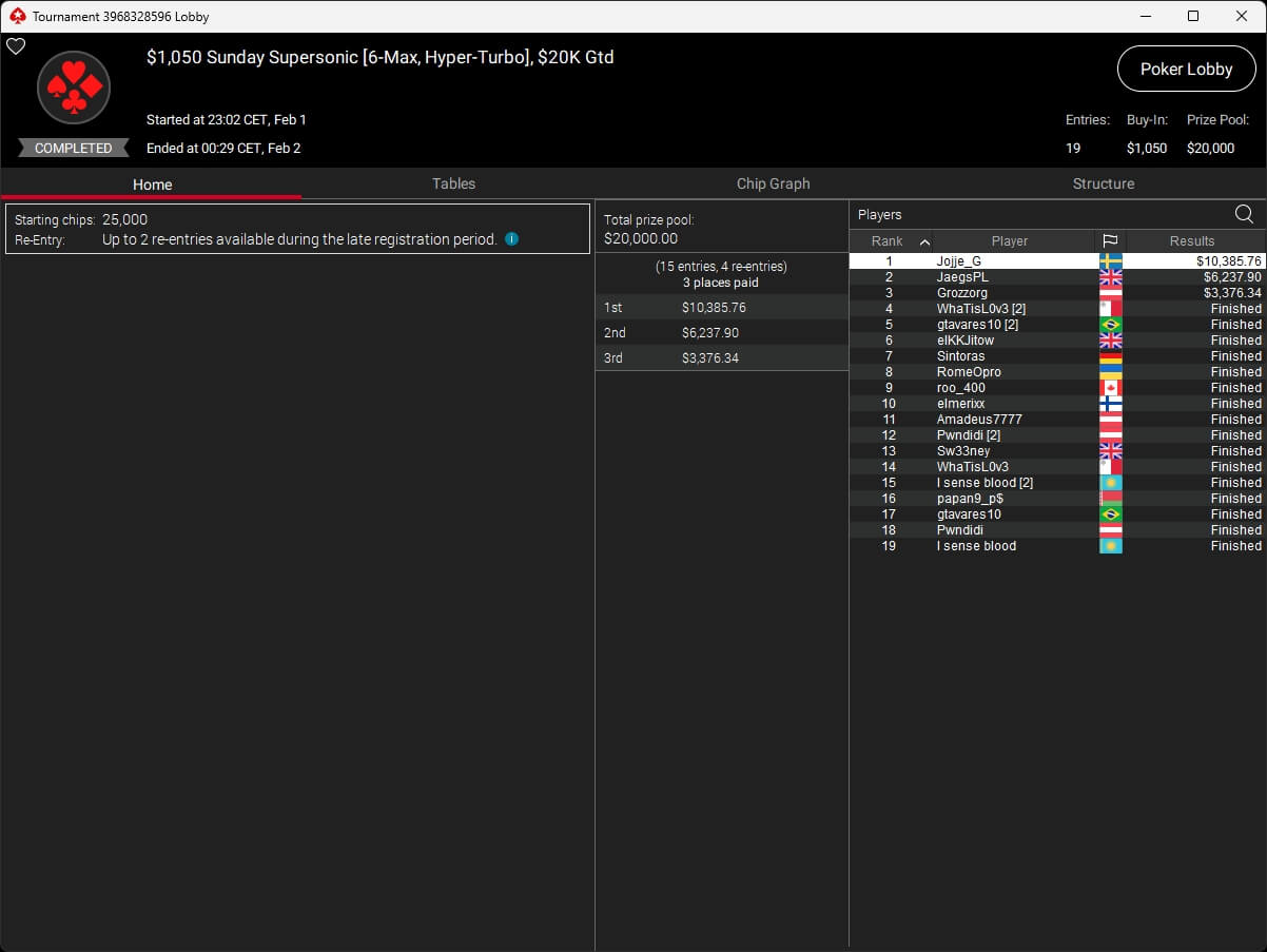 Zu den weiteren Turniergewinnern gehörten vladjkkaa01 ($17.136,60; $530 Titans), superslide ($1.133,18 + $1.115,07; $11 PLO 6-Max PKO), de_fabbe ($2.776,89 + $4.763,52; $109 PLO 6-Max PKO) sowie ALVS24 ($5.002,04 + $3.595,34; $22 NLHE Turbo PKO).