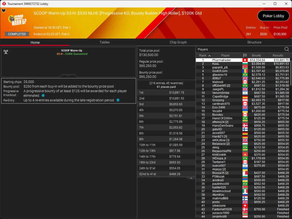 Gestern startete auf PokerStars die Warm-Up Series zur SCOOP 2026. Die DACH-Gemeinde hatte einen erfolgreichen Einstand und siegte mehrfach. Pharmatrader ($10.891,75 + $14.334,94) schnappte sich das $530 Bounty Builder HR.