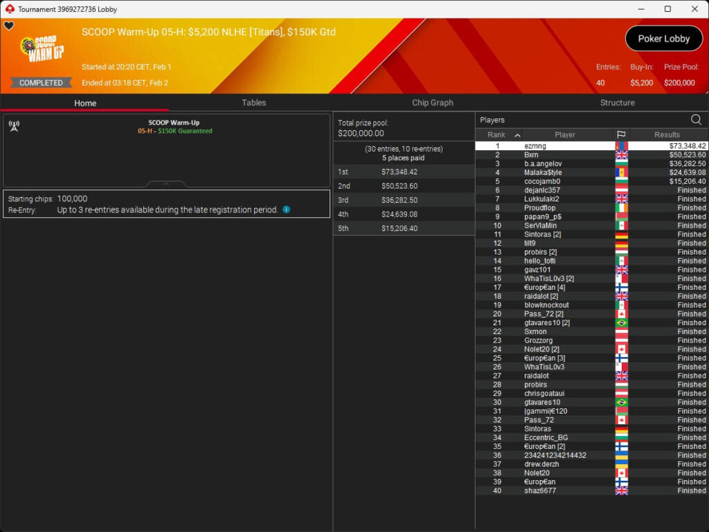Im $5.200 Titans Event spielten 30 Teilnehmer um $200.000 an Preisgeldern. ezmng aus der Mongolei sicherte sich den Sieg sowie $73.348,42. Bxrn (2./$50.523,60), b.a.angelov (3./$36.282,50), Juan „Malaka$tyle“ Pardo (4./$24.639,08) und Ognyan „cocojamb0“ Dimov (5./$15.206,40) holten ebenfalls einen Cash.