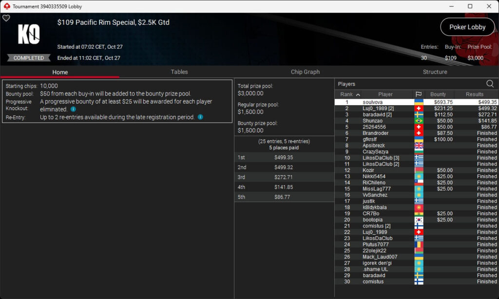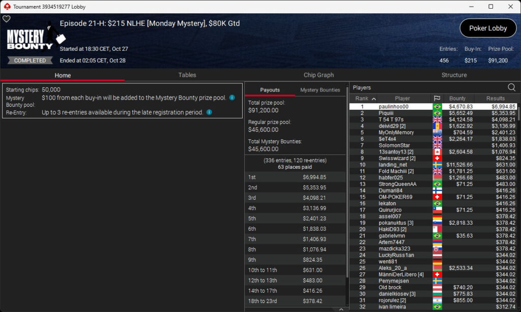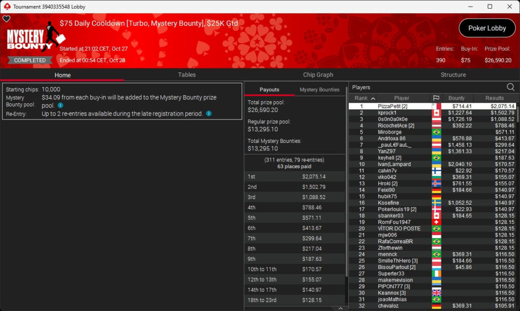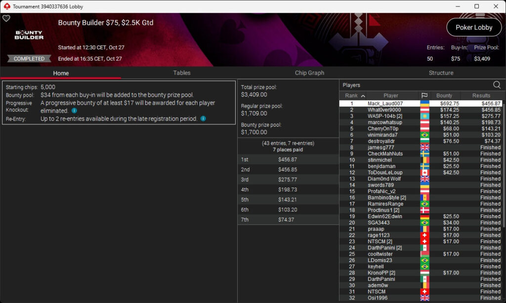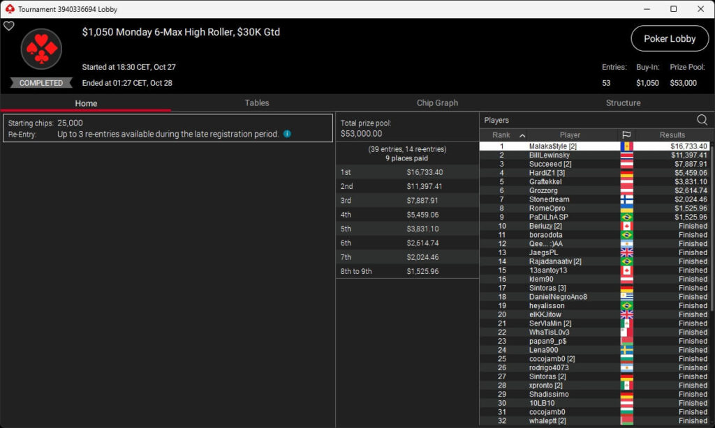 Bei den regulären MTTs auf PokerStars waren Nils „pudelpower“ Pudel ($4.180,16; $55 Daily Supersonic), Paul „pauL€FauL“ Höfer ($2.116,11; $109 Hot Hyper), Pharmatrader ($4.579,04; $109 Fenomeno), klem90 ($4.917,12; $320 Daily Supersonic) und moonlightJJ ($573,49 + $862,50; $109 Bounty Builder) erfolgreich.