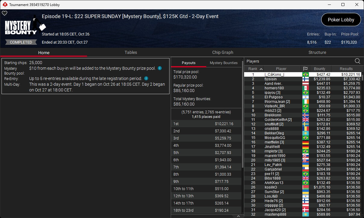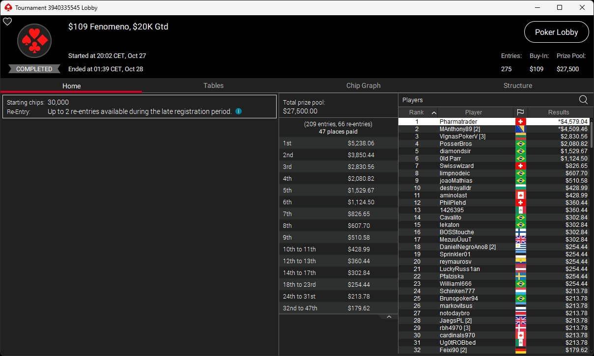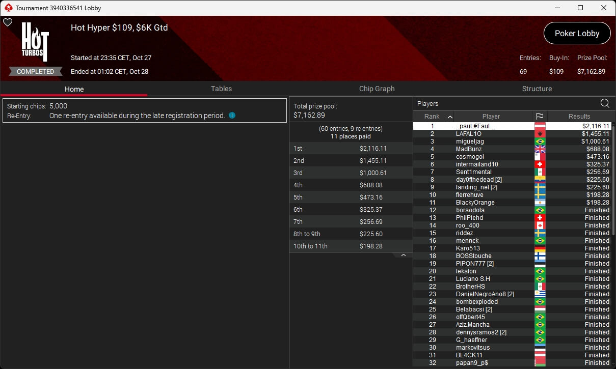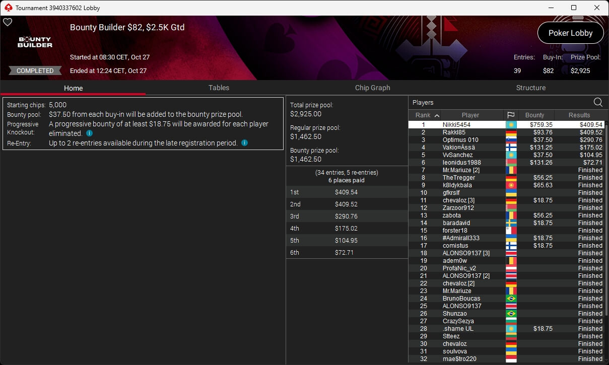 Bei den regulären MTTs auf PokerStars waren Nils „pudelpower“ Pudel ($4.180,16; $55 Daily Supersonic), Paul „pauL€FauL“ Höfer ($2.116,11; $109 Hot Hyper), Pharmatrader ($4.579,04; $109 Fenomeno), klem90 ($4.917,12; $320 Daily Supersonic) und moonlightJJ ($573,49 + $862,50; $109 Bounty Builder) erfolgreich.