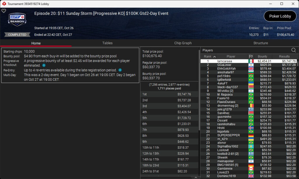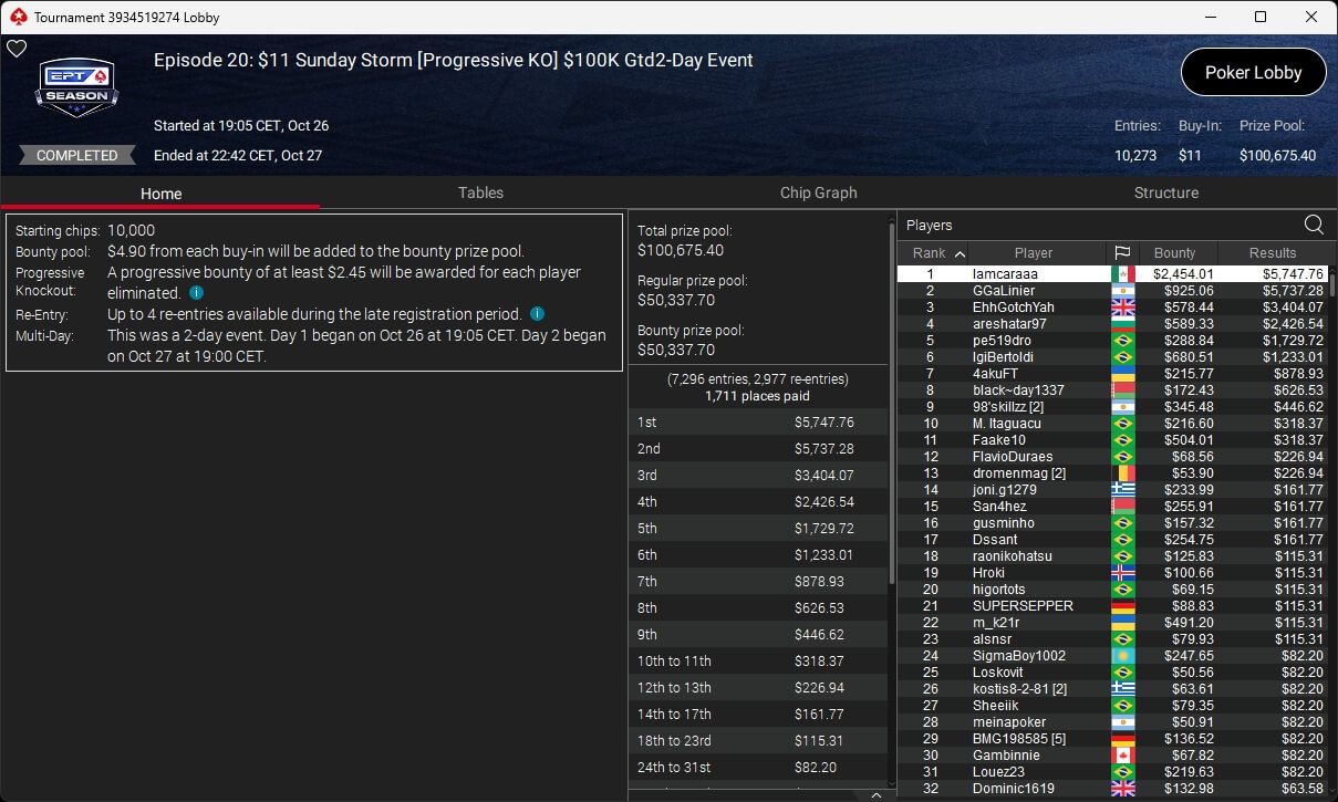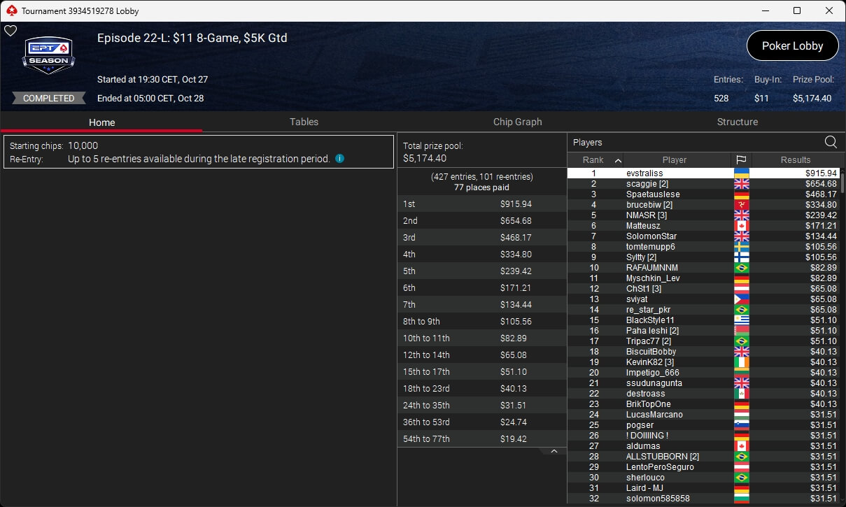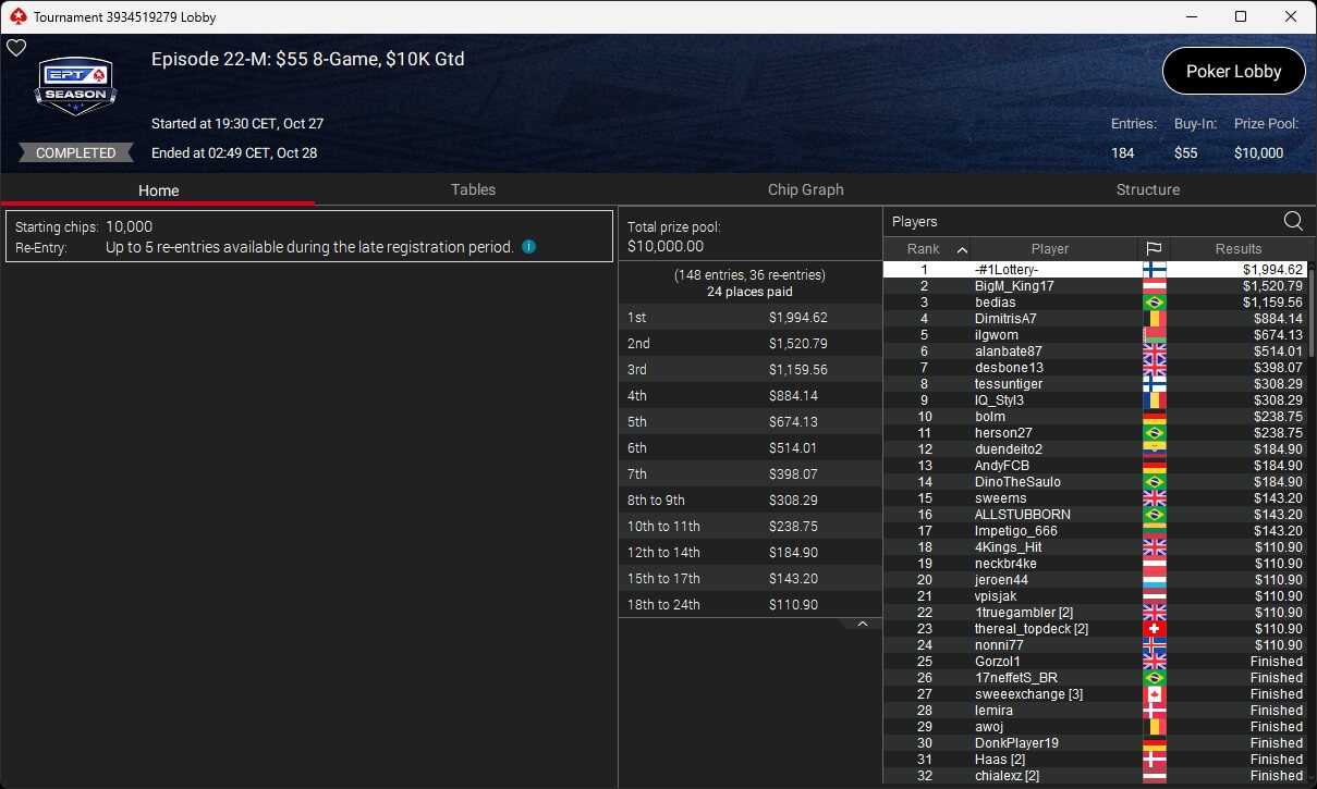 Die deutschsprachige Poker-Community stellte bei der EPT Season einmal mehr einen der Sieger. Im $11 Monday Mystery setzte sich floplady ($3.678,91 + $217,81) aus der Schweiz gegen 4.180 Konkurrenten durch und ging mit dem Titel davon. Insgesamt wurde bei diesem Turnier um mehr als $60.400 gespielt.