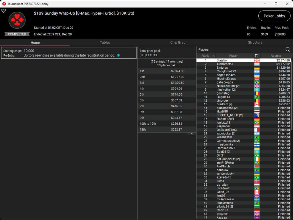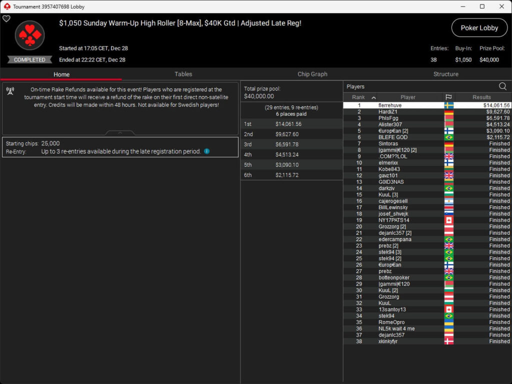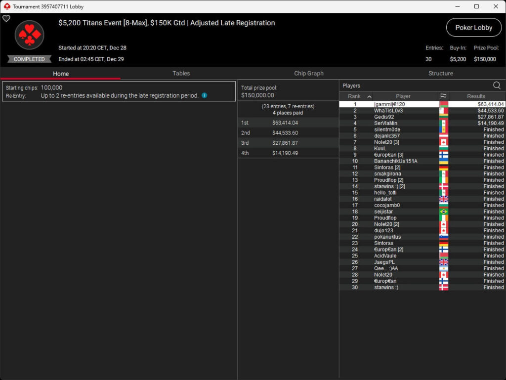 Das teuerste Turnier auf PokerStars war das $5.200 Titans Event. 23 Teilnehmer traten an, dazu kamen sieben Re-Entries, sodass um $150.000 gespielt wurde. Im Heads-Up setzte sich |gammi|€120 ($63.144,04) gegen Enrico „WhaTisL0v3“ Camoscios (2./$44.533,60) durch. Gediminas „Gedis92“ Uselis (3./$27.861,87) und Vladimir „SerVlaMin“ Minko (4./$14.190,49) sicherten sich ebenfalls einen Cash. Pavel „silentm0de“ Plesuv war der Bubble Boy des Turniers.