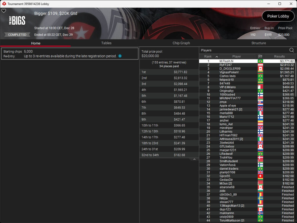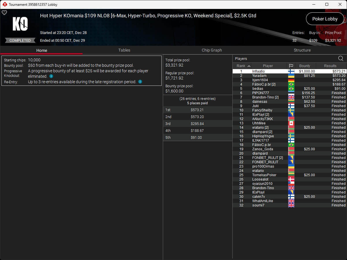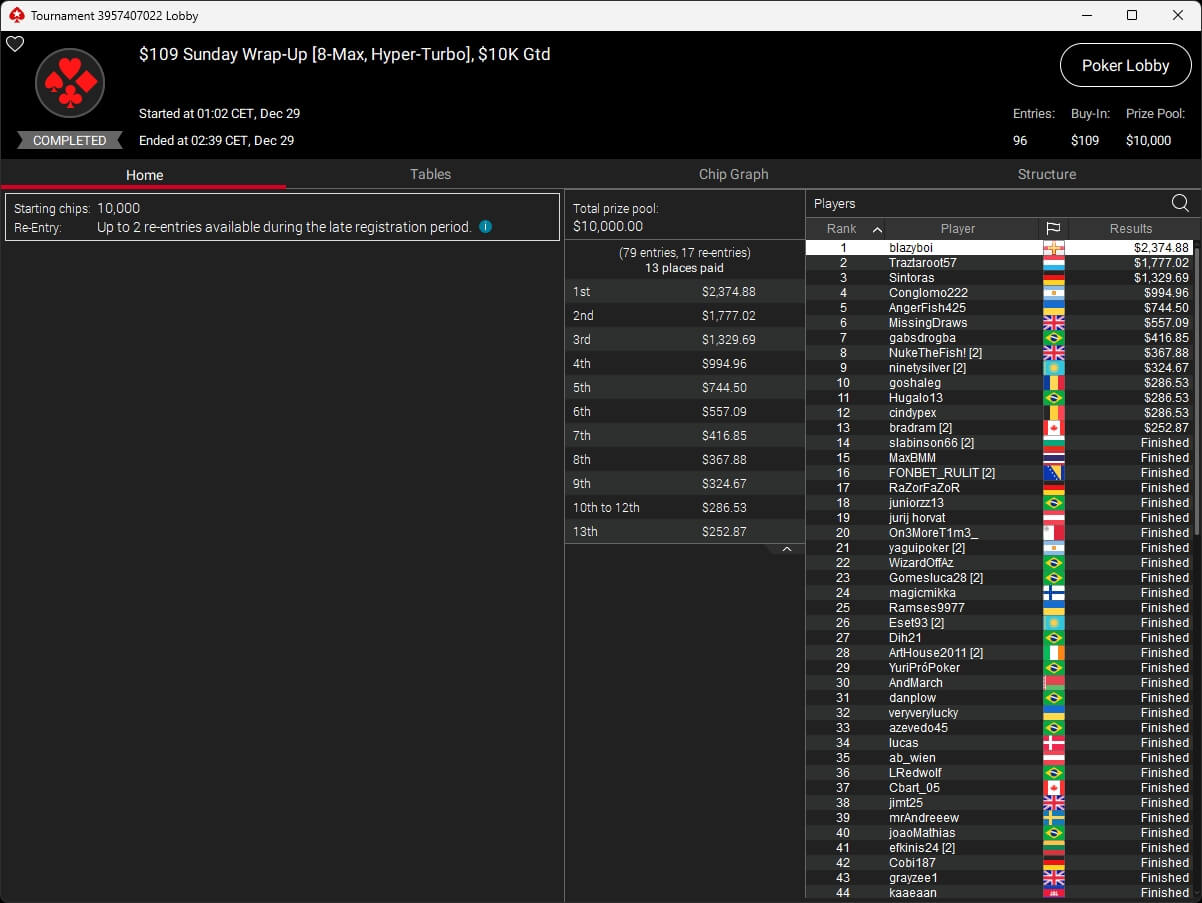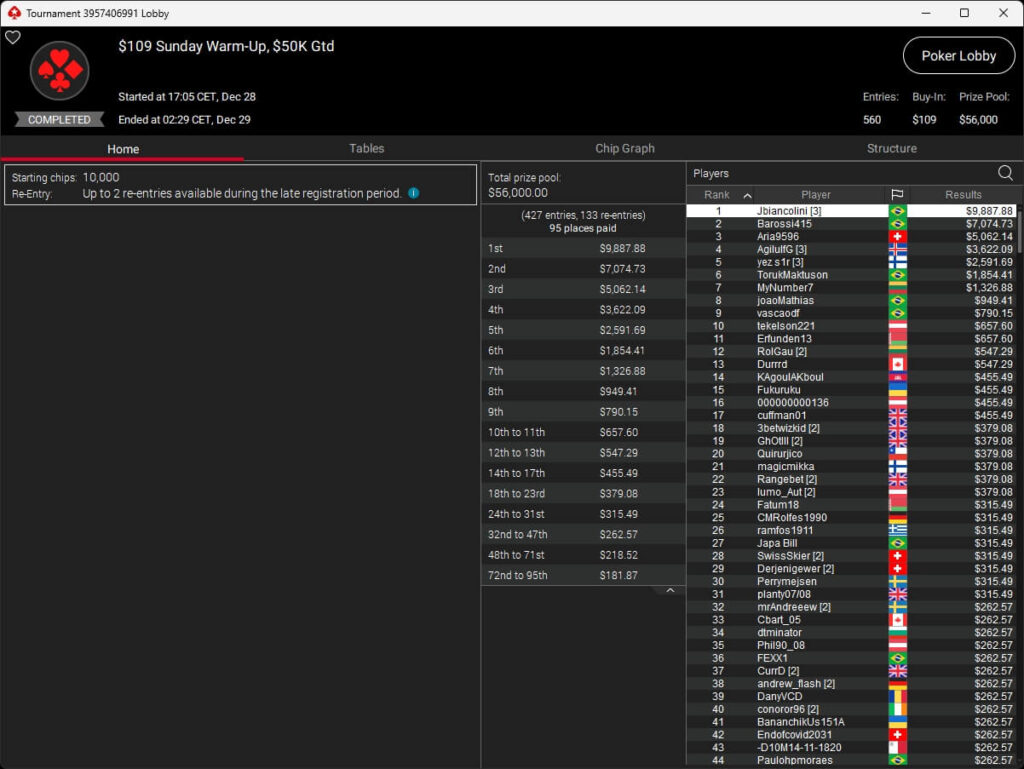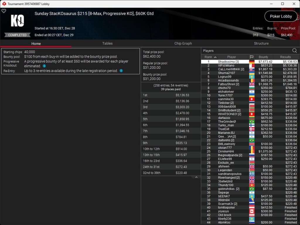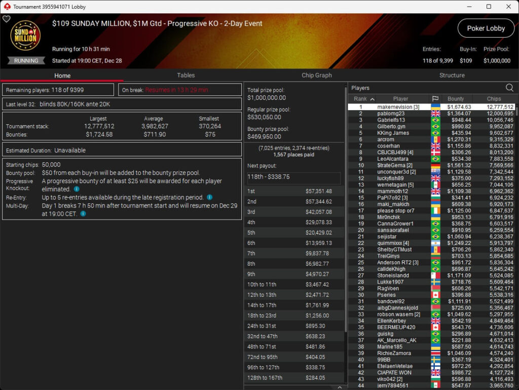 Zum $109 Sunday Million PKO traten 7.025 Spieler an. Weitere 2.374 Re-Entries reichten nicht aus, um die $1.000.000 GTD zu knacken. 118 Teilnehmer überstanden den Cut und werden heute um den Sieg spielen. Auf den Sieger warten mehr als $57.350.