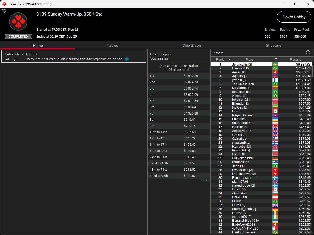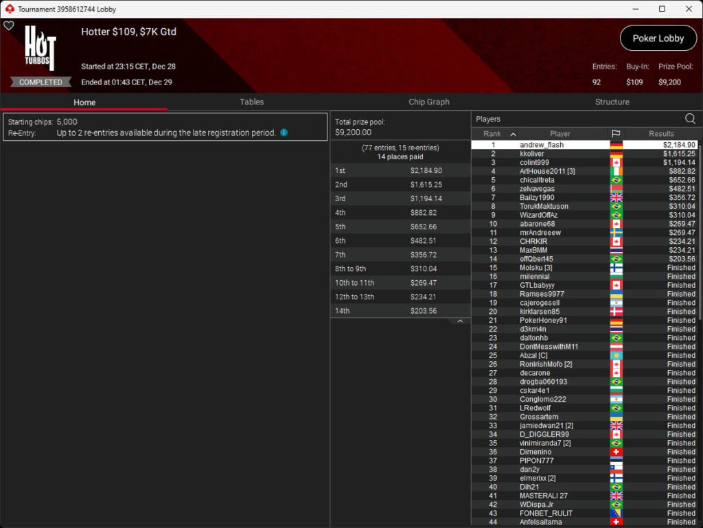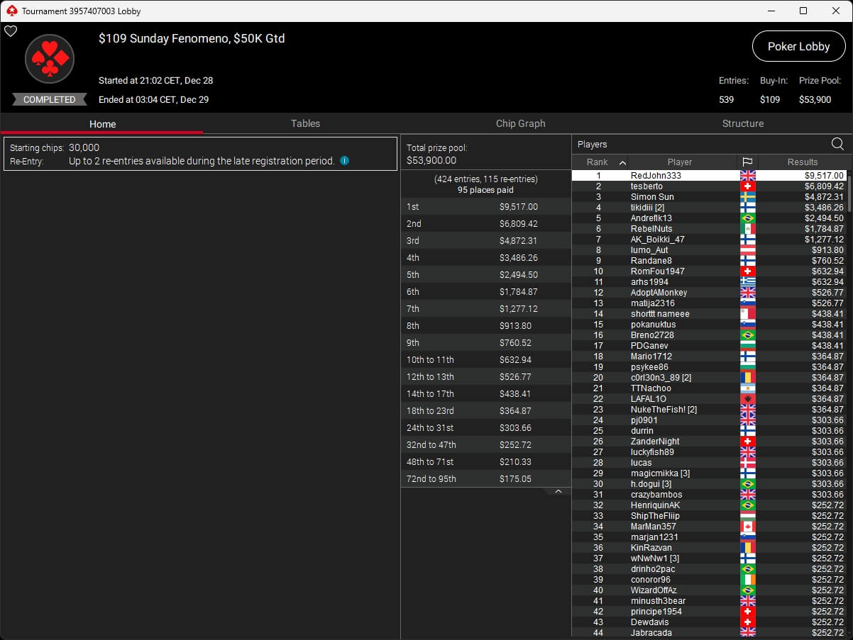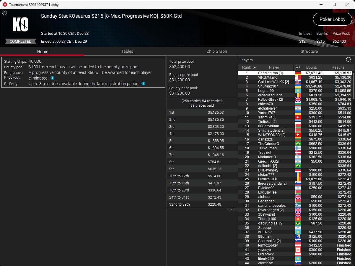 Die deutschsprachige Poker-Community war ebenfalls erfolgreich. Shadissimo ($5.136,53 + $7.673,42) setzte sich im $215 Sunday StacKOsaurus durch. andrew_flash ($2.184,90) sowie kkoliver (2./$1.615,25) verbuchten einen Doppelsieg im $109 Hotter, und tesberto (2./$6.809,42) schrammte im $109 Sunday Fenomeno knapp am Titel vorbei.