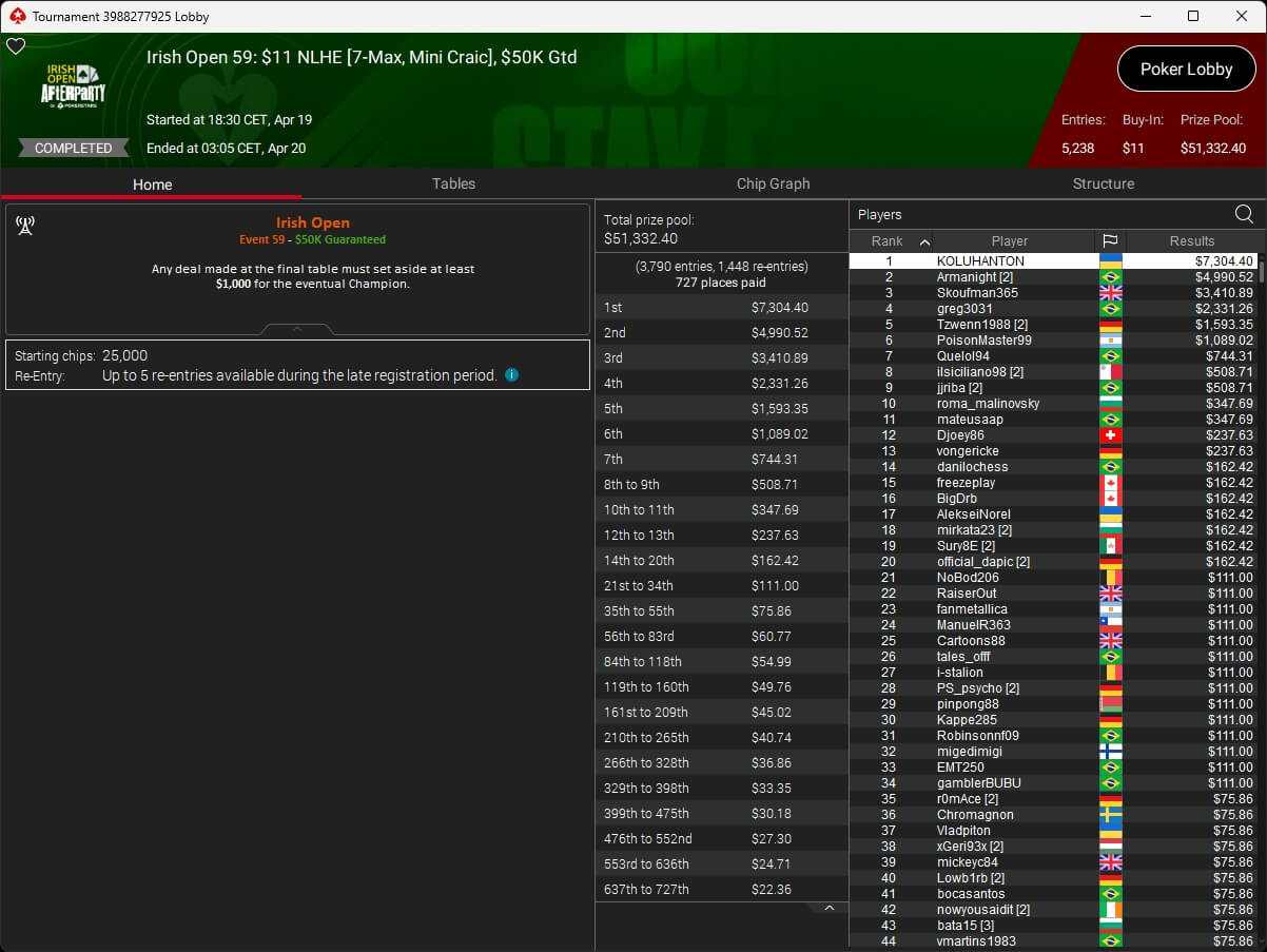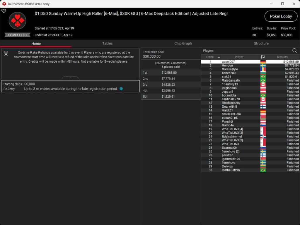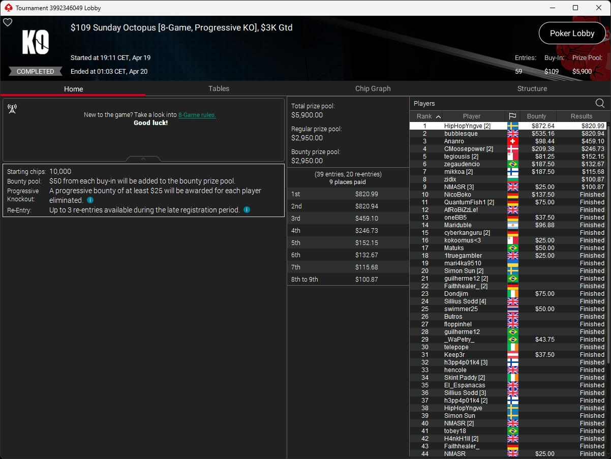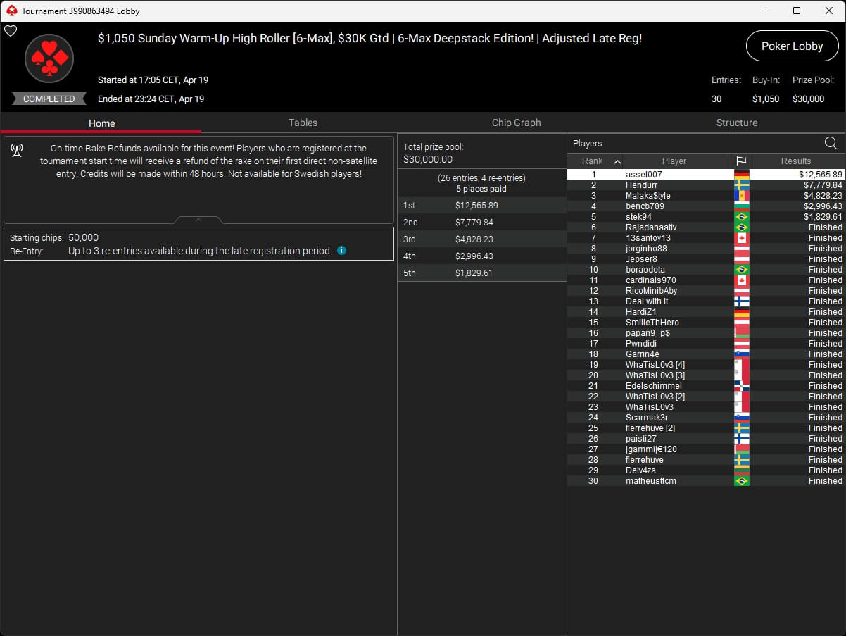 Den Sieg sowie $63.414,04 Preisgeld sicherte sich Igor „Garrin4e“ Yaroshevskyy. Runner-up wurde der Schwede Niklas „Lena900“ Åstedt ($44.533,60). SmilleThHero ($27.861,87) aus Österreich landete auf Rang 3, und 13santoy13 ($14.190,49) sicherte sich den Min Cash.
