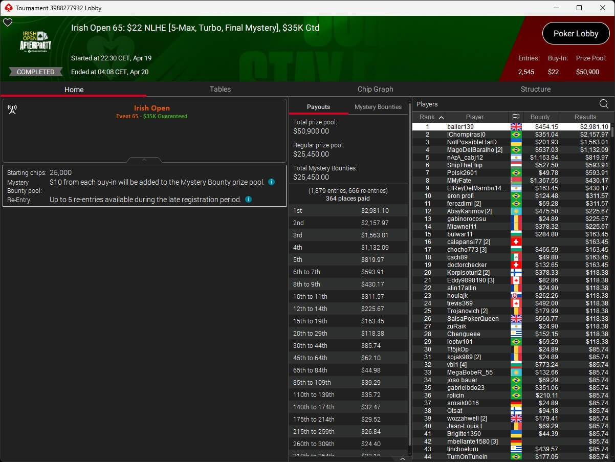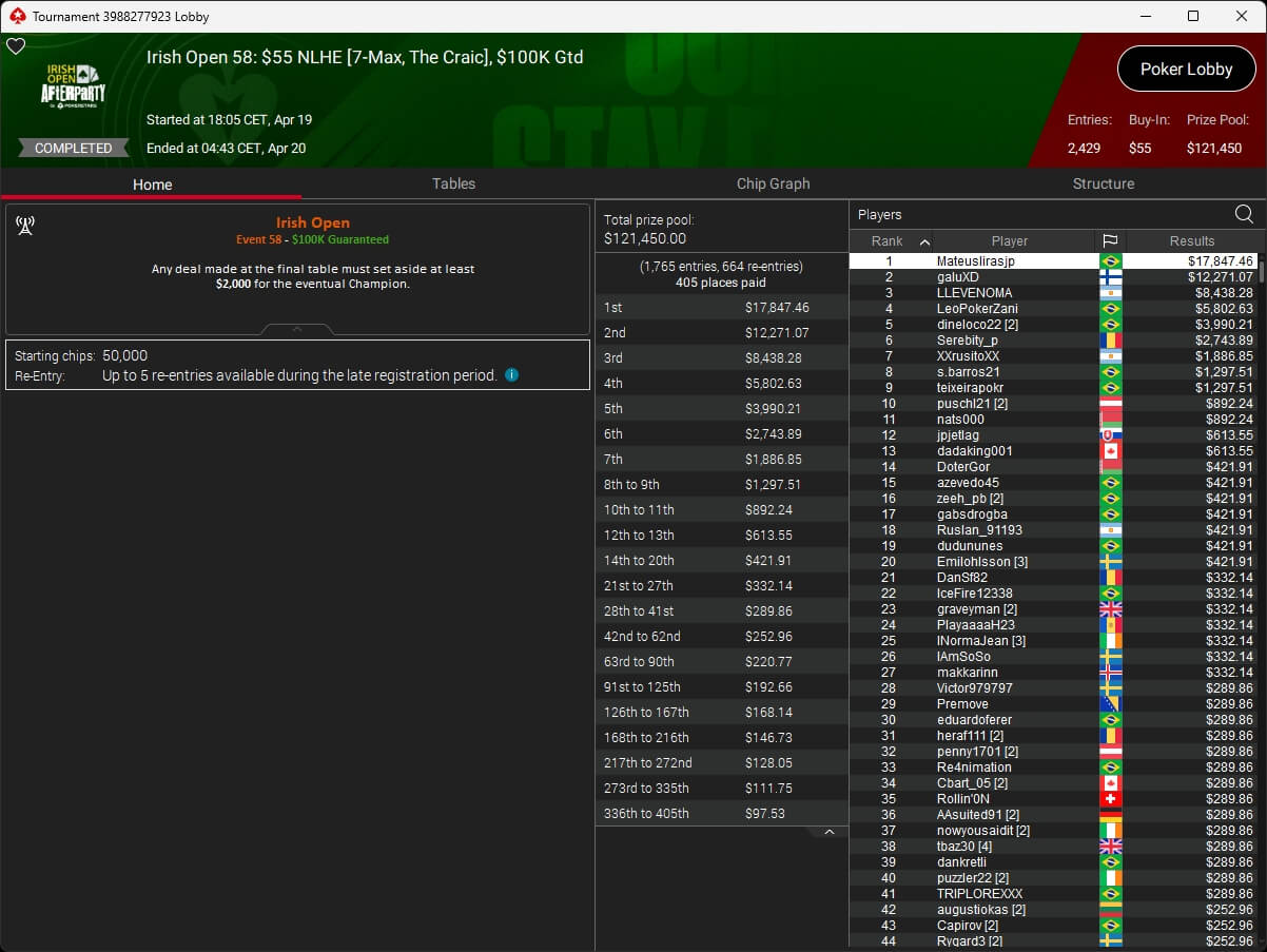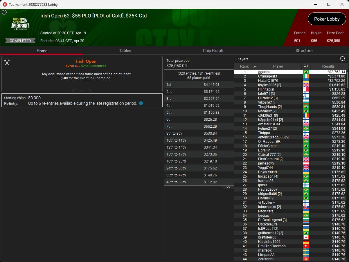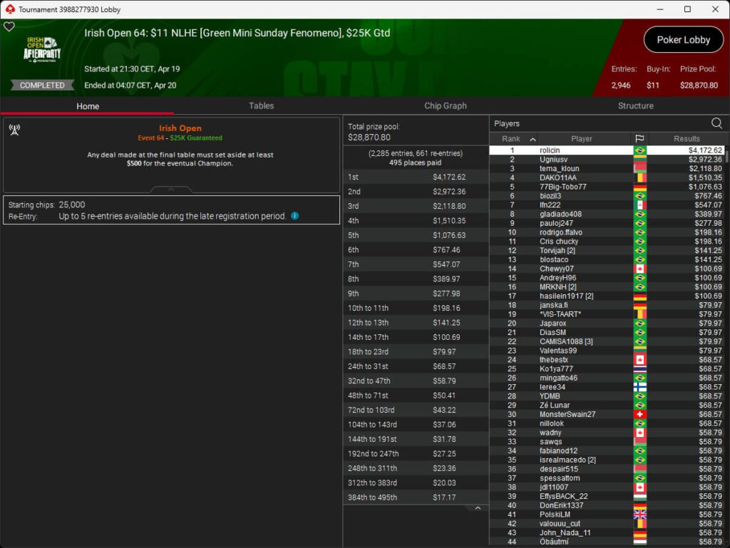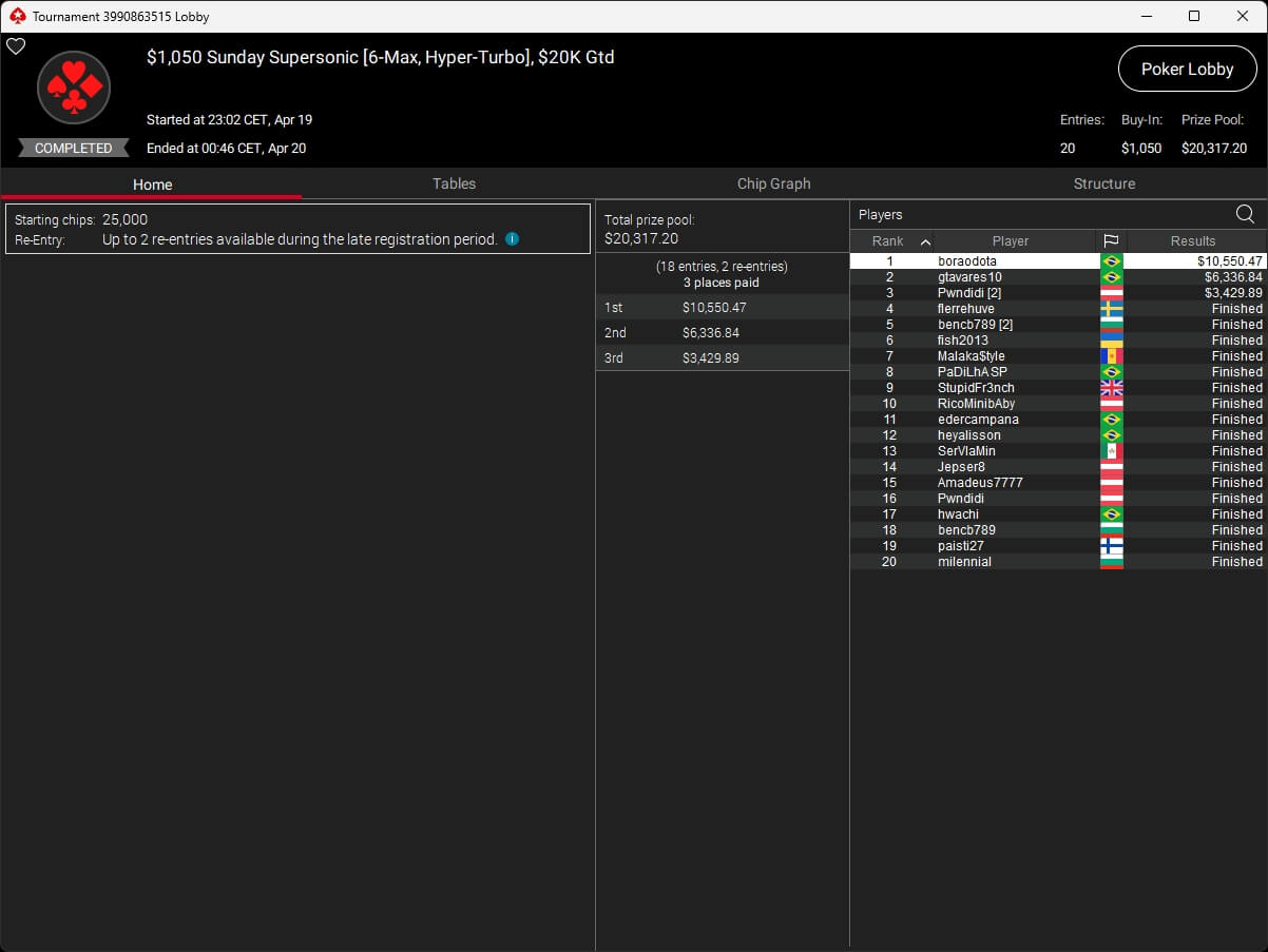 Den Sieg sowie $63.414,04 Preisgeld sicherte sich Igor „Garrin4e“ Yaroshevskyy. Runner-up wurde der Schwede Niklas „Lena900“ Åstedt ($44.533,60). SmilleThHero ($27.861,87) aus Österreich landete auf Rang 3, und 13santoy13 ($14.190,49) sicherte sich den Min Cash.