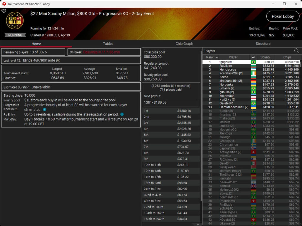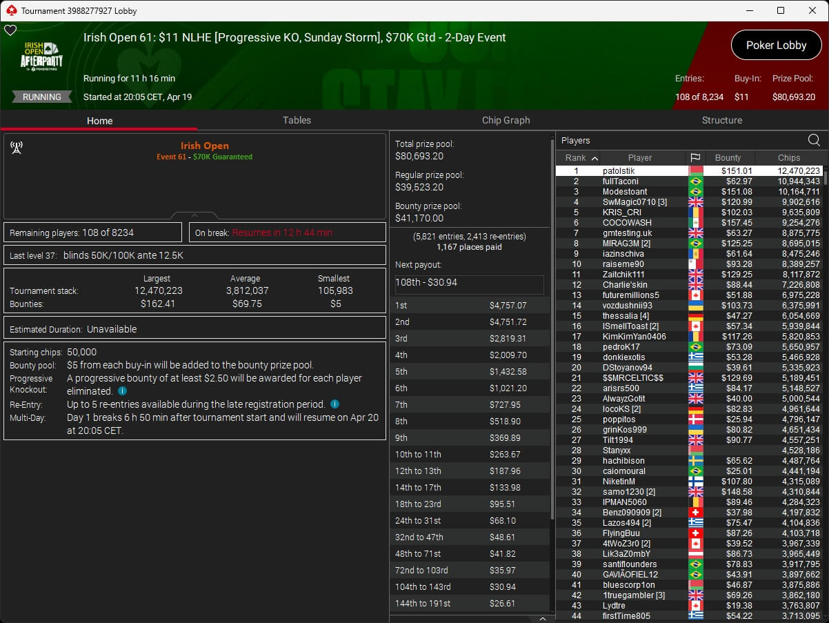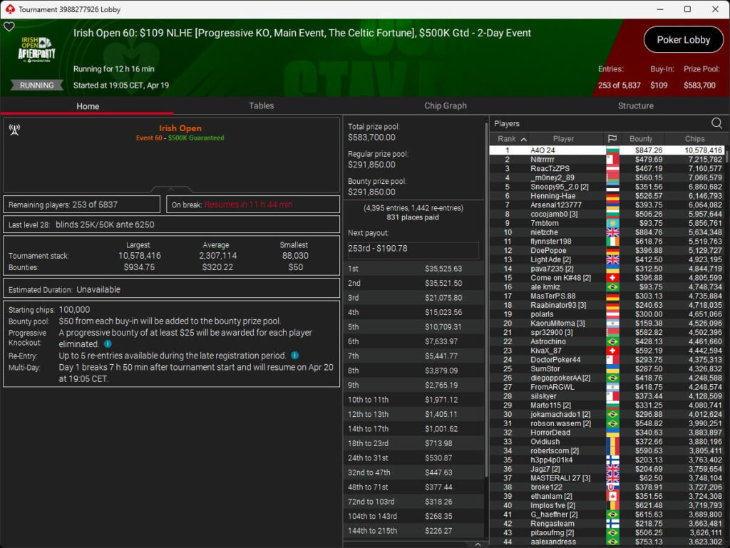 Im $109 PKO Main Event haben 253 Spieler den Cut überstanden und werden heute um den Sieg sowie die Löwenanteile der insgesamt $583.700 spielen. Im $11 PKO Sunday Storm gehen 108 Spieler in Tag 2.