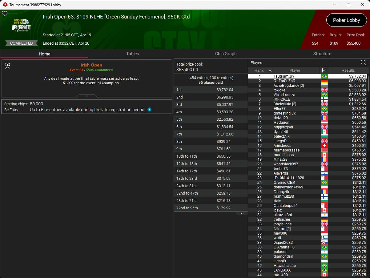 Zum Abschluss der Irish Open Afterparty gab es keinen Sieg für die DACH-Gemeinde. Denkbar knapp war es für RaZorFaZoR (2./$6.998,93) im $109 Green Sunday Fenomeno. Zwei Entscheidungen stehen allerdings noch aus.