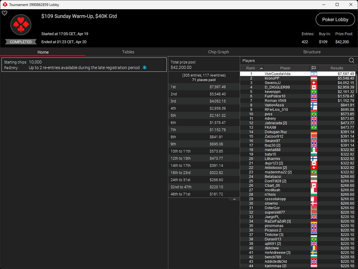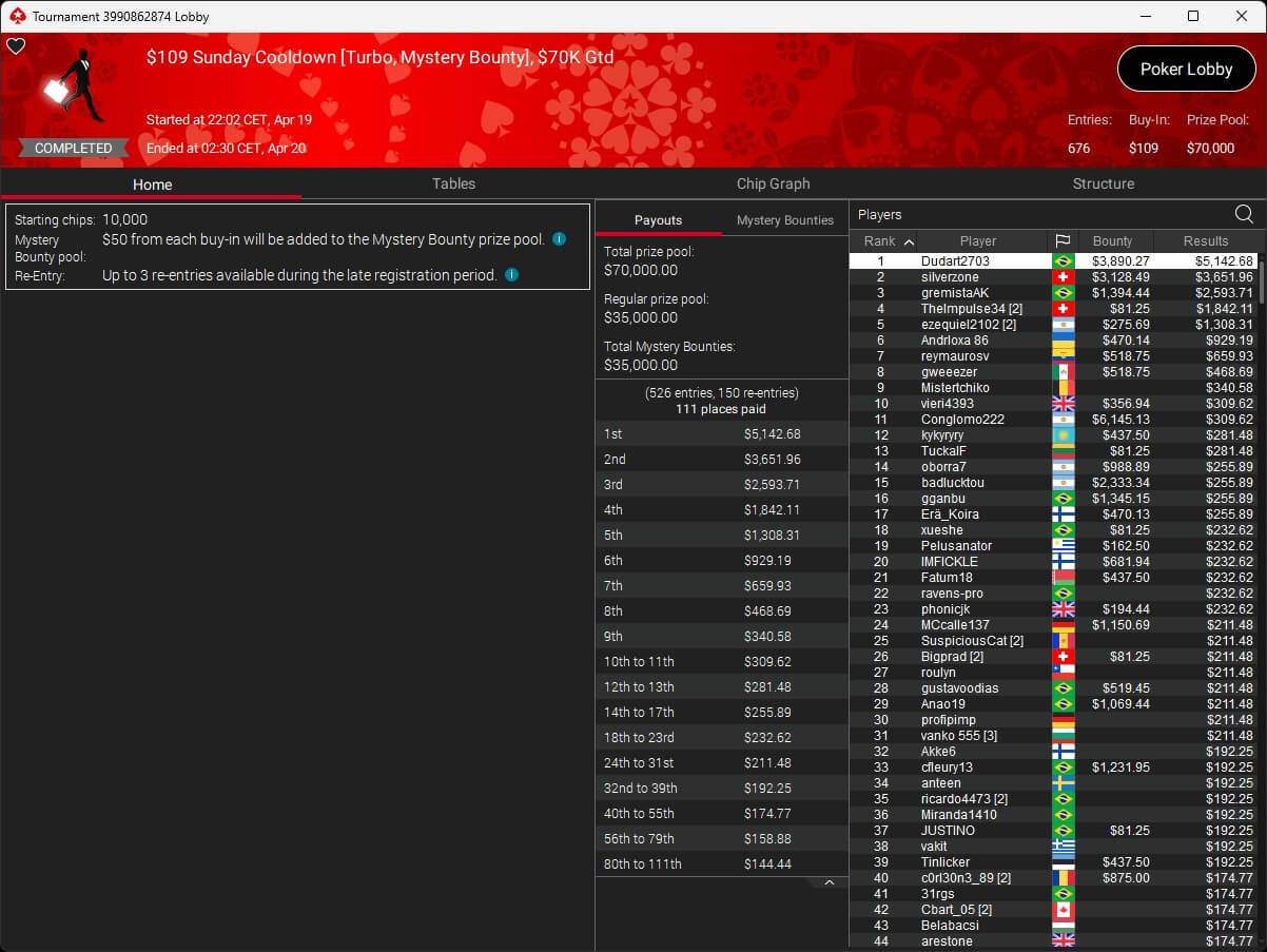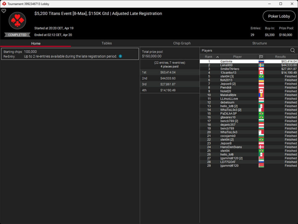 Das teuerste Turnier des Tages war das PokerStars $5.200 Titans Event. 22 Spieler traten an, dazu kamen sieben Re-Entries. Damit ging es um die garantierten $150.000. Vier Spieler teilten sich diese Summe, Bubble Boy wurde der Brasilianer Iago „stek94“ Botelho.