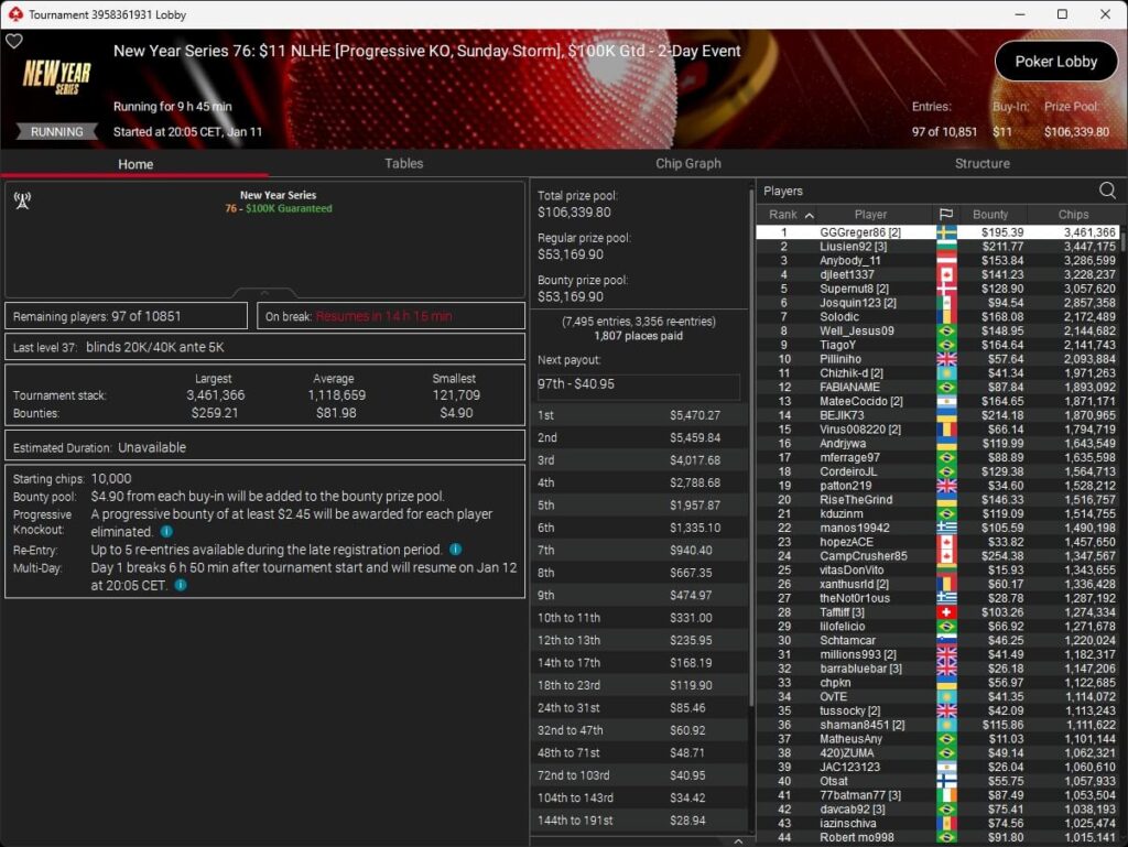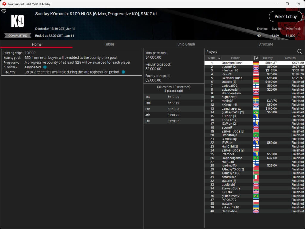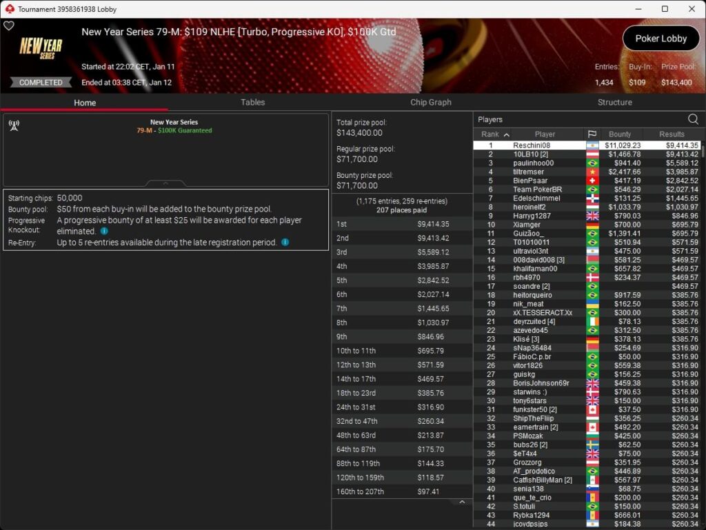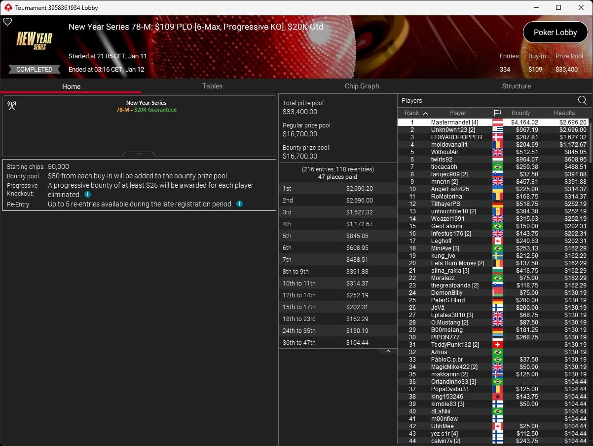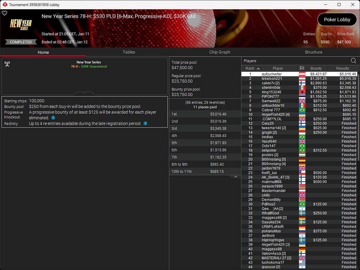 Mastermandel ($2.696,20 + $4.164,02; $109 PLO 6-Max PKO) sowie aufzuckerter ($5.016,46 + $9.421,87; $530 PLO 6-Max PKO) verbuchten bei der New Year Series ebenfalls Titel. Gjilan15 (2./$8.654,25; $22 Warm-Up PKO) sowie 10LB10 (2./$9.413,42 + $1.466,78; $109 Turbo PKO) sicherten sich Silber. Bei den regulären MTTs auf PokerStars siegten dolmren ($1.125,96; $82 Sunday HORSE), QuantumFish1 ($677,20 + $984,37; $109 NLO8) und 8jamon8 ($8.162,22; $215 Sunday Supersonic).