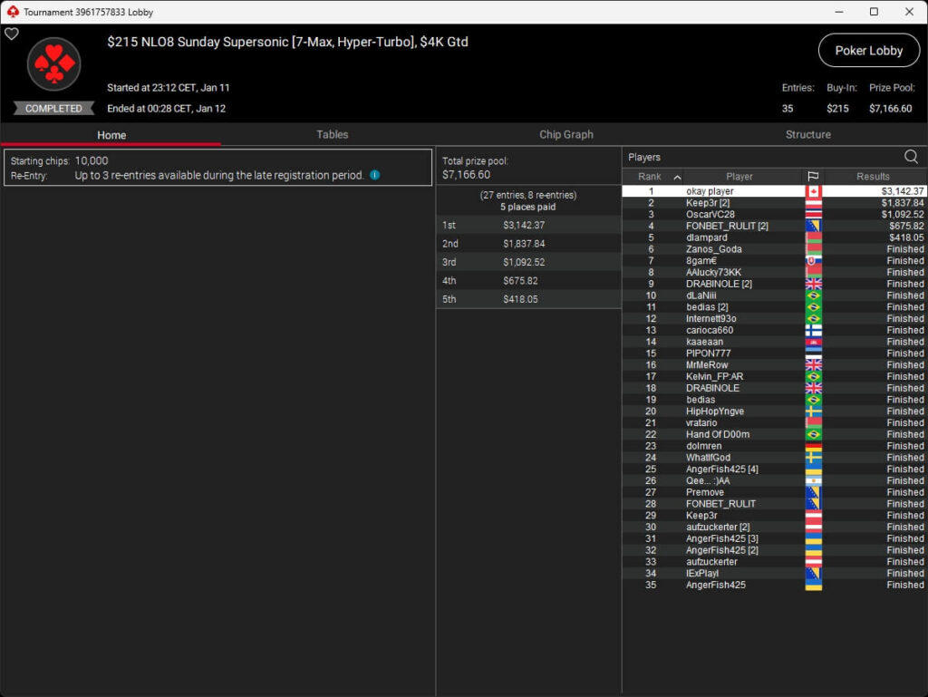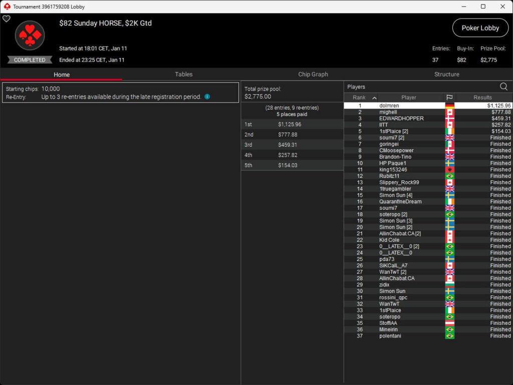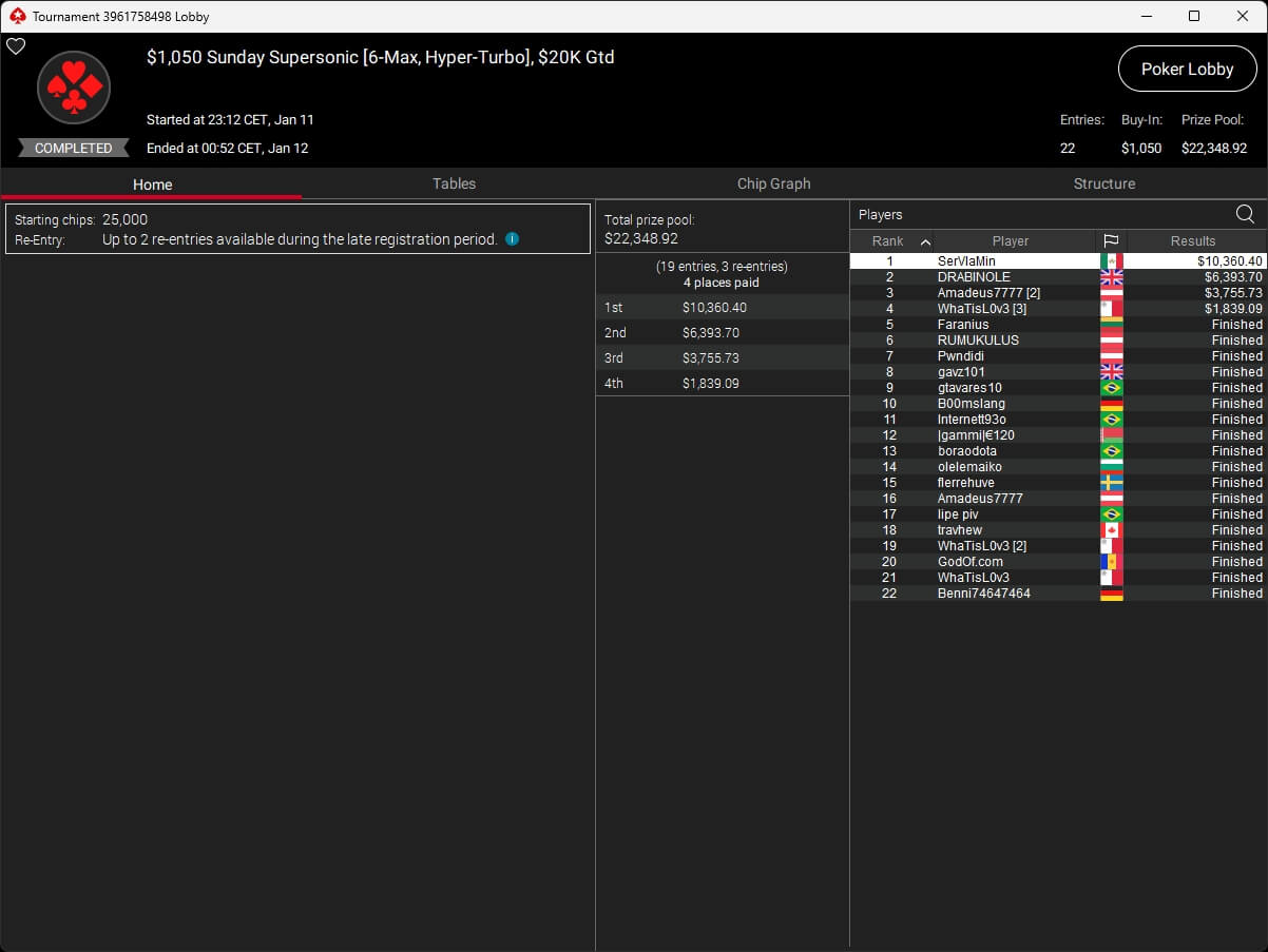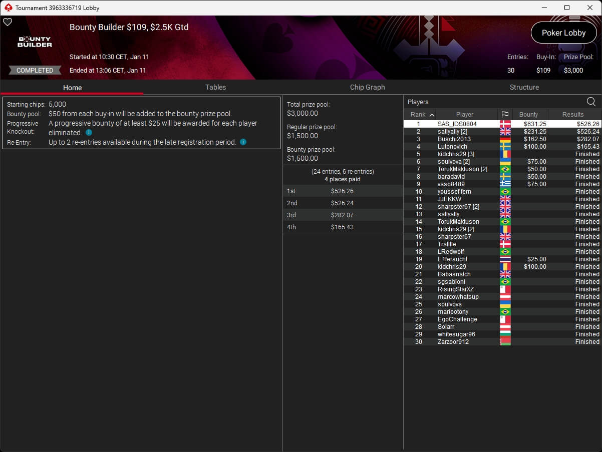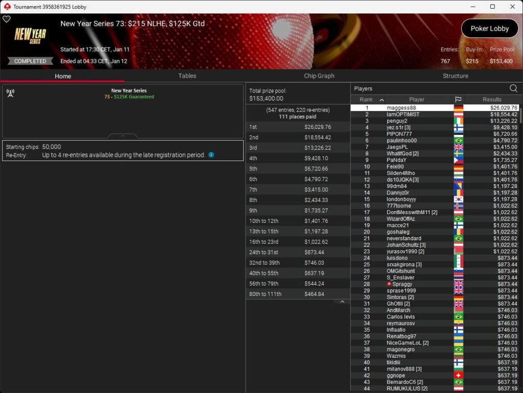 Mastermandel ($2.696,20 + $4.164,02; $109 PLO 6-Max PKO) sowie aufzuckerter ($5.016,46 + $9.421,87; $530 PLO 6-Max PKO) verbuchten bei der New Year Series ebenfalls Titel. Gjilan15 (2./$8.654,25; $22 Warm-Up PKO) sowie 10LB10 (2./$9.413,42 + $1.466,78; $109 Turbo PKO) sicherten sich Silber. Bei den regulären MTTs auf PokerStars siegten dolmren ($1.125,96; $82 Sunday HORSE), QuantumFish1 ($677,20 + $984,37; $109 NLO8) und 8jamon8 ($8.162,22; $215 Sunday Supersonic).