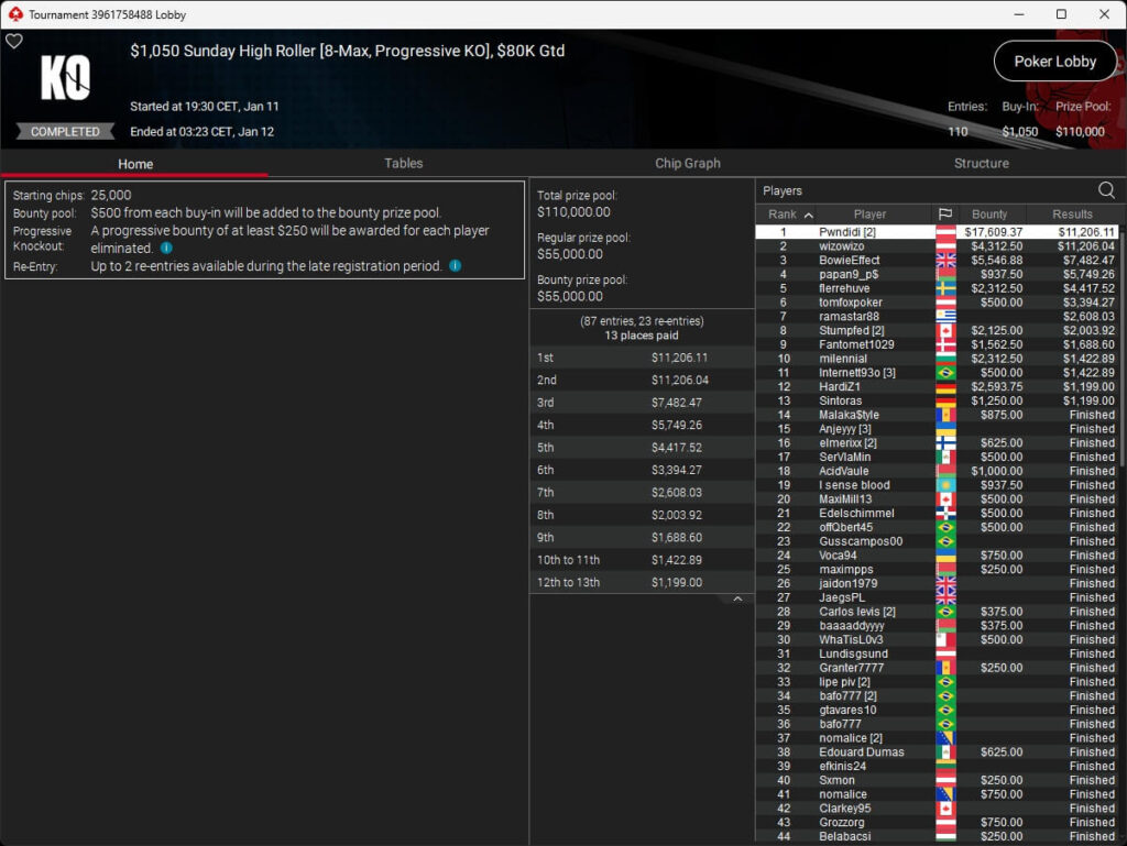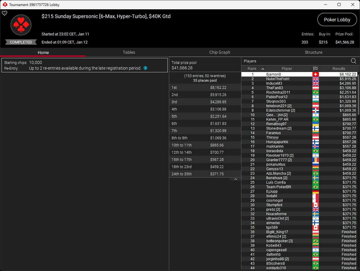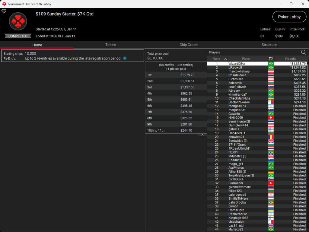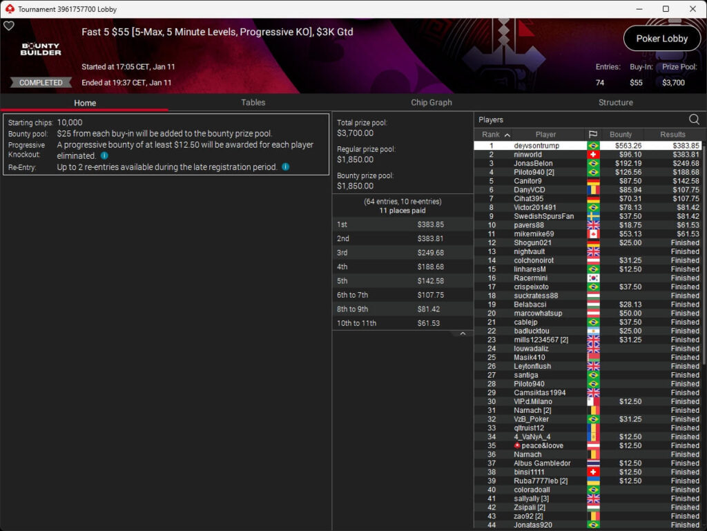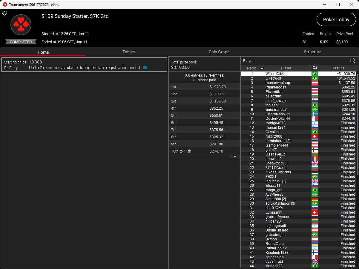 Mastermandel ($2.696,20 + $4.164,02; $109 PLO 6-Max PKO) sowie aufzuckerter ($5.016,46 + $9.421,87; $530 PLO 6-Max PKO) verbuchten bei der New Year Series ebenfalls Titel. Gjilan15 (2./$8.654,25; $22 Warm-Up PKO) sowie 10LB10 (2./$9.413,42 + $1.466,78; $109 Turbo PKO) sicherten sich Silber. Bei den regulären MTTs auf PokerStars siegten dolmren ($1.125,96; $82 Sunday HORSE), QuantumFish1 ($677,20 + $984,37; $109 NLO8) und 8jamon8 ($8.162,22; $215 Sunday Supersonic).