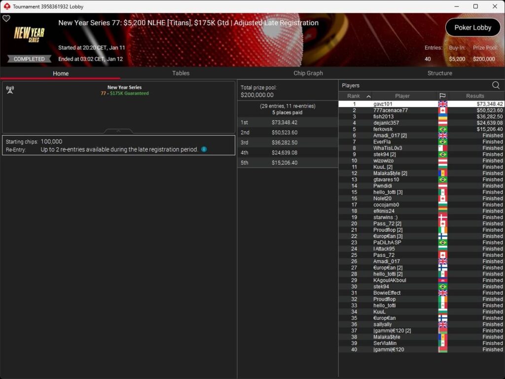 Gavin „gavz101“ Cochrane hat das $5.200 Titans Event auf PokerStars gewonnen. Die deutschsprachige Poker-Community verbuchte bei der New Year Series vier Turniersiege.