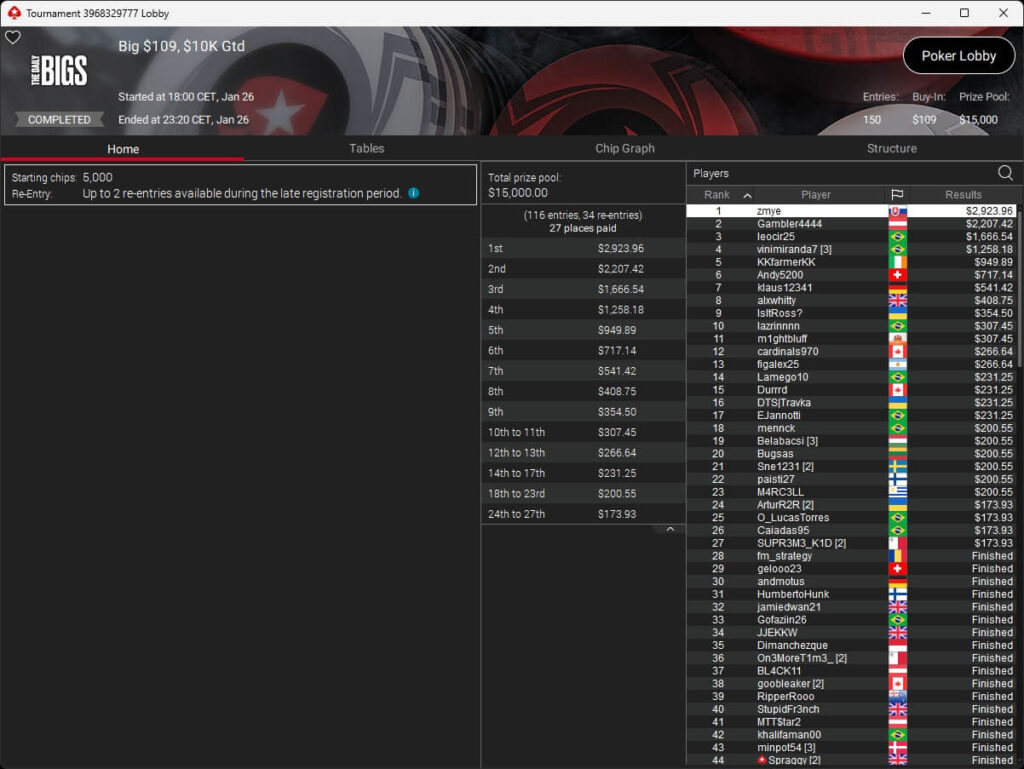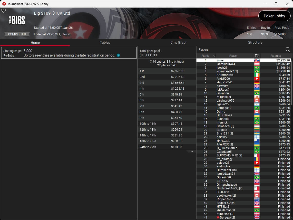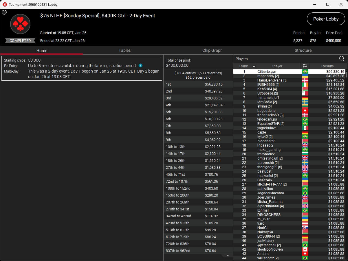 Brasilianischer Sieg im PokerStars Sunday Special. Dort ging der Titel an Gilberto.gyn, minameisjef1 aus Deutschland belegte Rang 7.