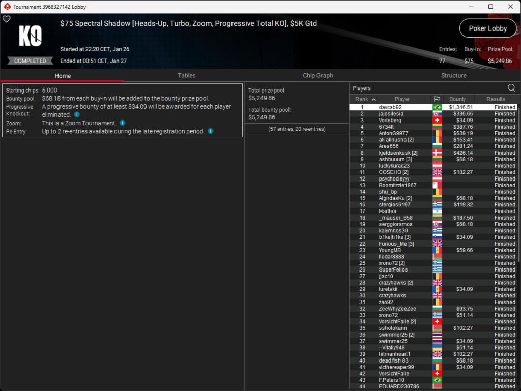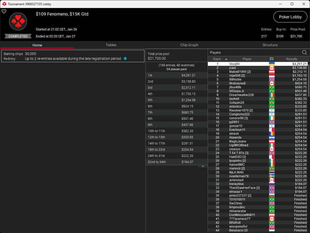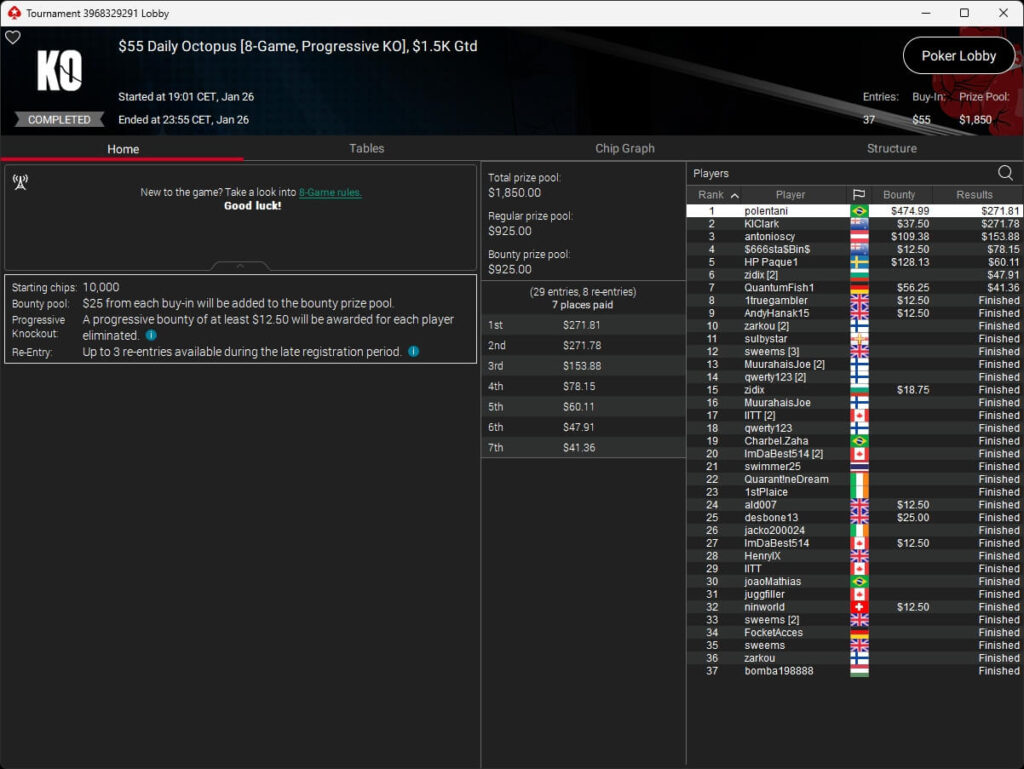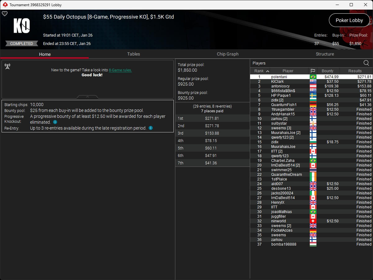 Brasilianischer Sieg im PokerStars Sunday Special. Dort ging der Titel an Gilberto.gyn, minameisjef1 aus Deutschland belegte Rang 7.