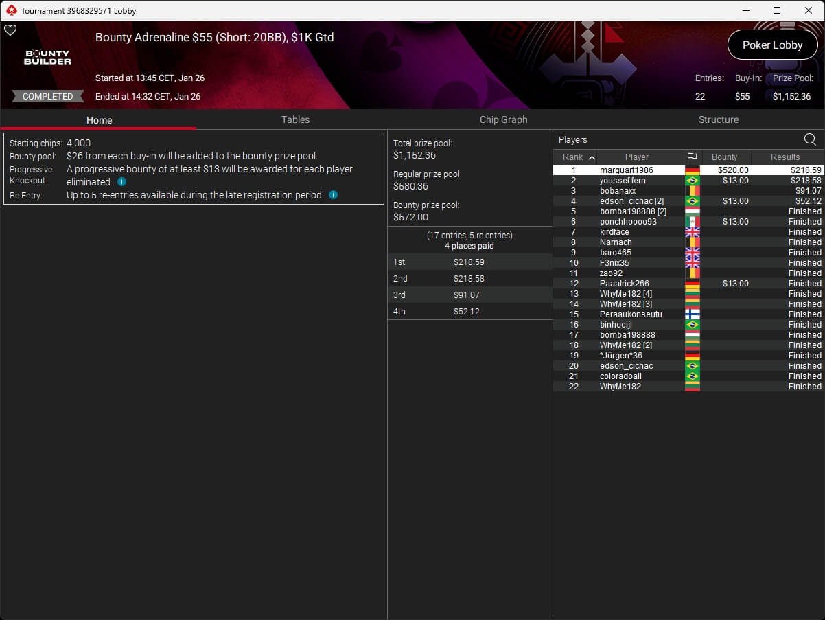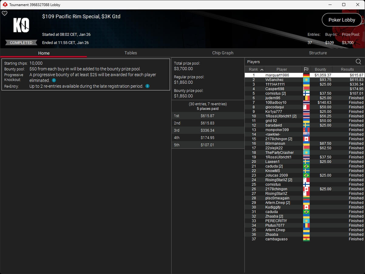 Die deutschsprachige Poker-Community verbuchte bei den Side Events Turniersiege. marquart1986 schlug im $109 Pacific Rim Special ($615,87 + $1.059,37) sowie im $55 Bounty Adrenalin ($218,59 + $520) zu.