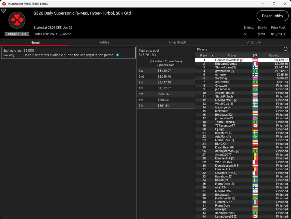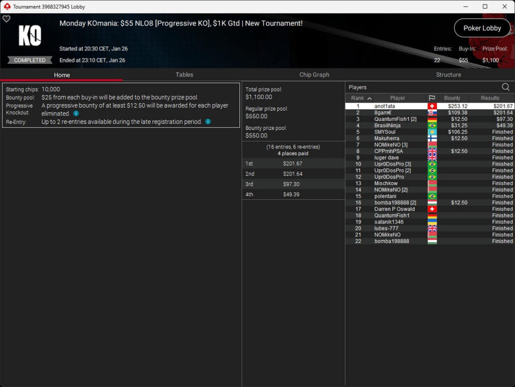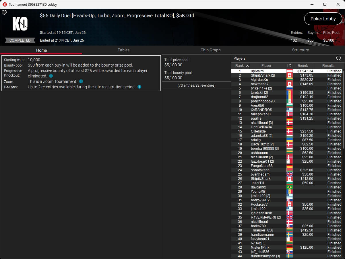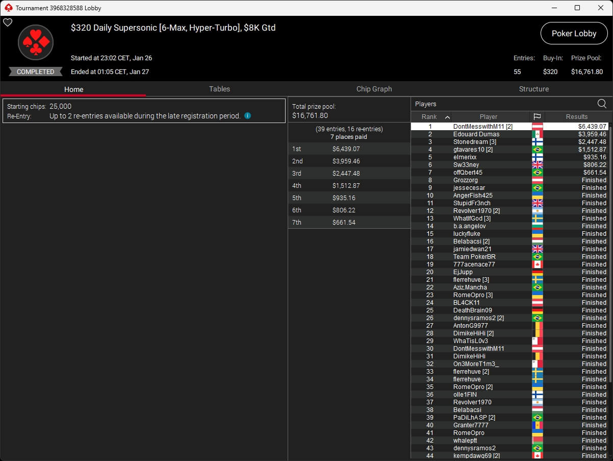 up$tairs ($1.243,34; $55 Daily Duel), anot1ata ($201,67 + $253,12; $55 NLO8) und DontMesswithM11 ($6.439,07; $320 Daily Supersonic) reihten sich ebenfalls bei den Gewinnern ein.