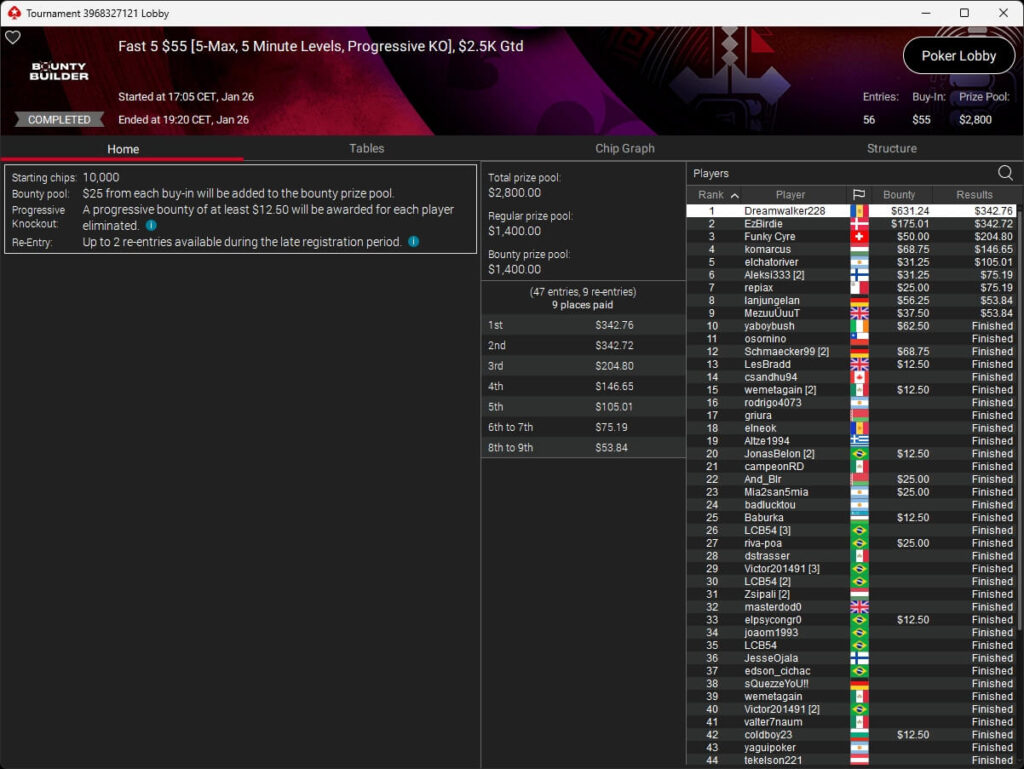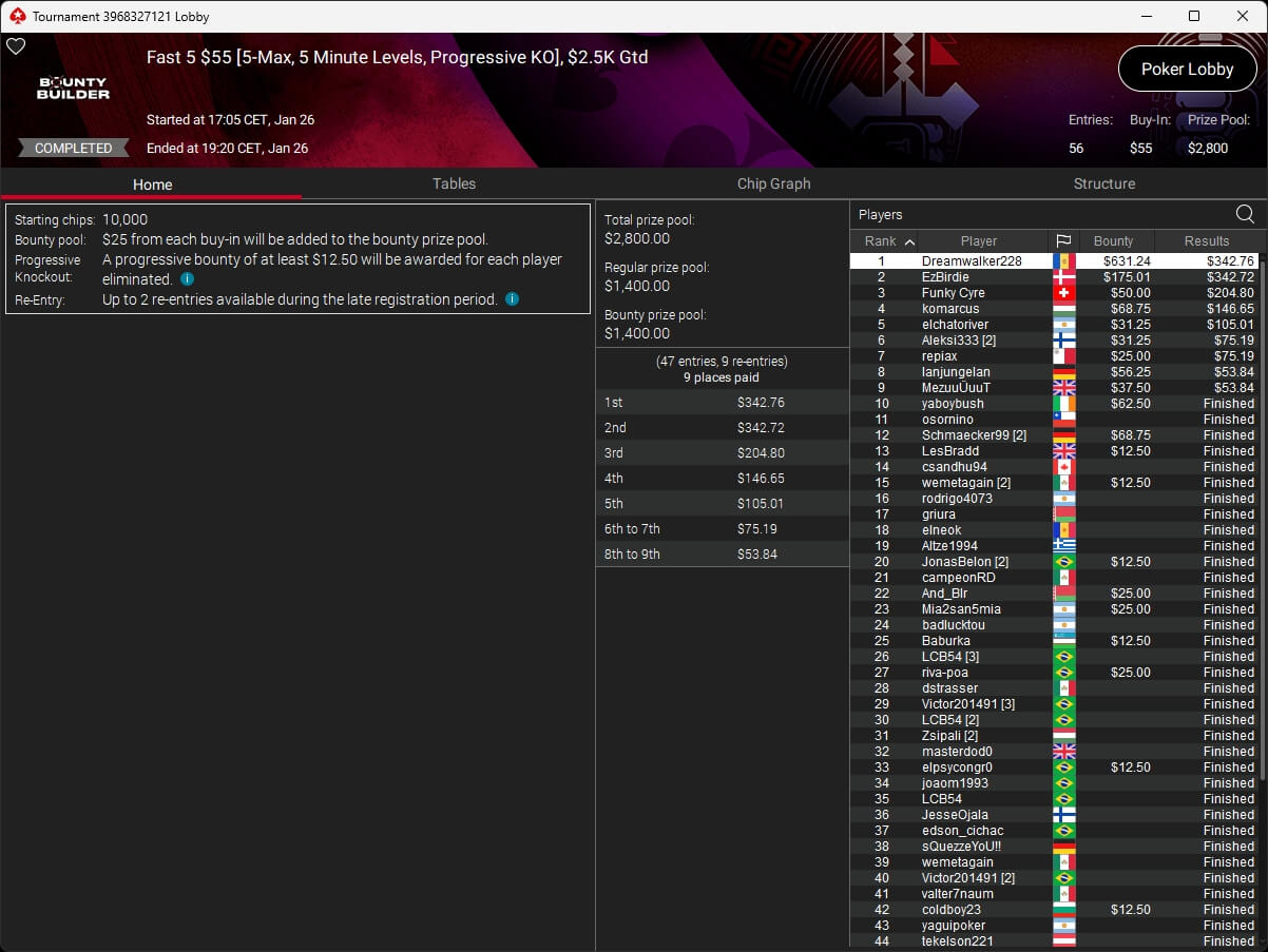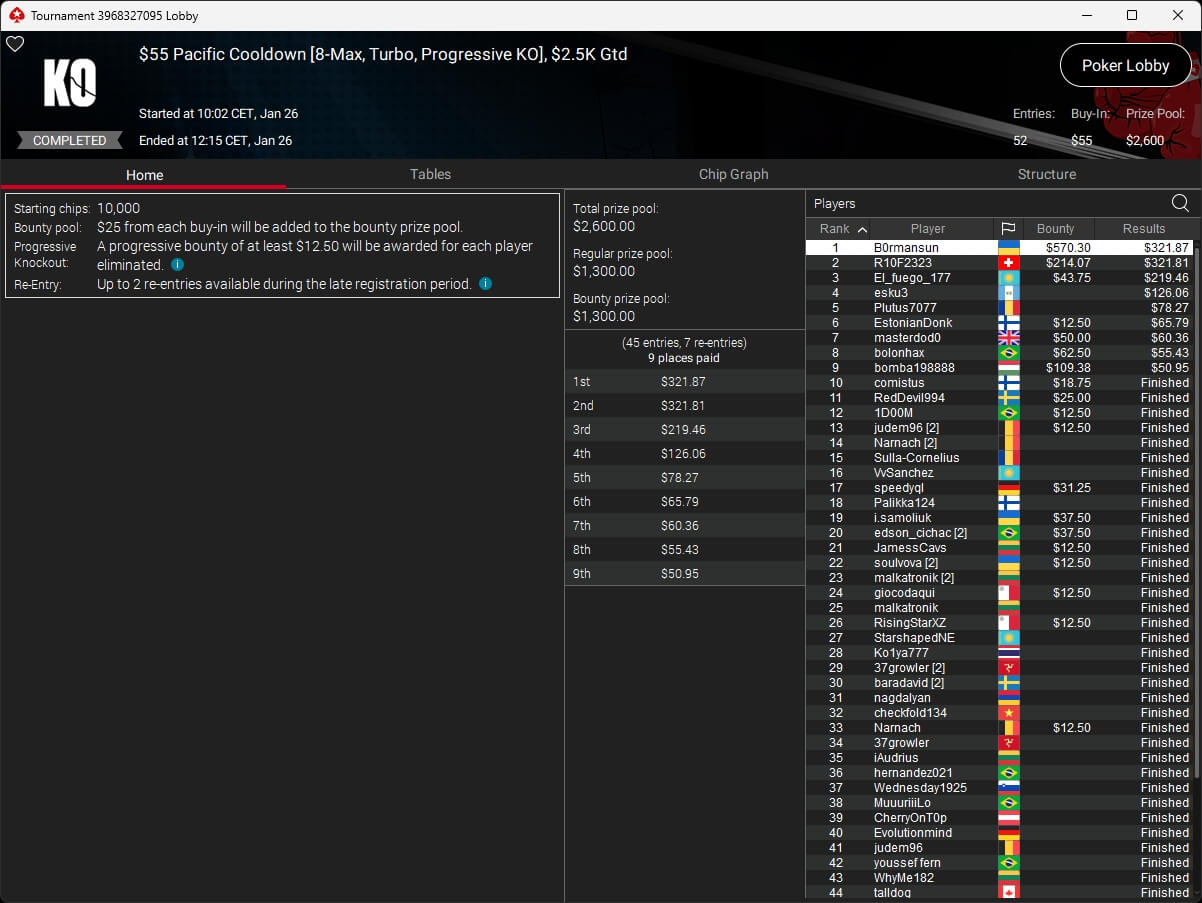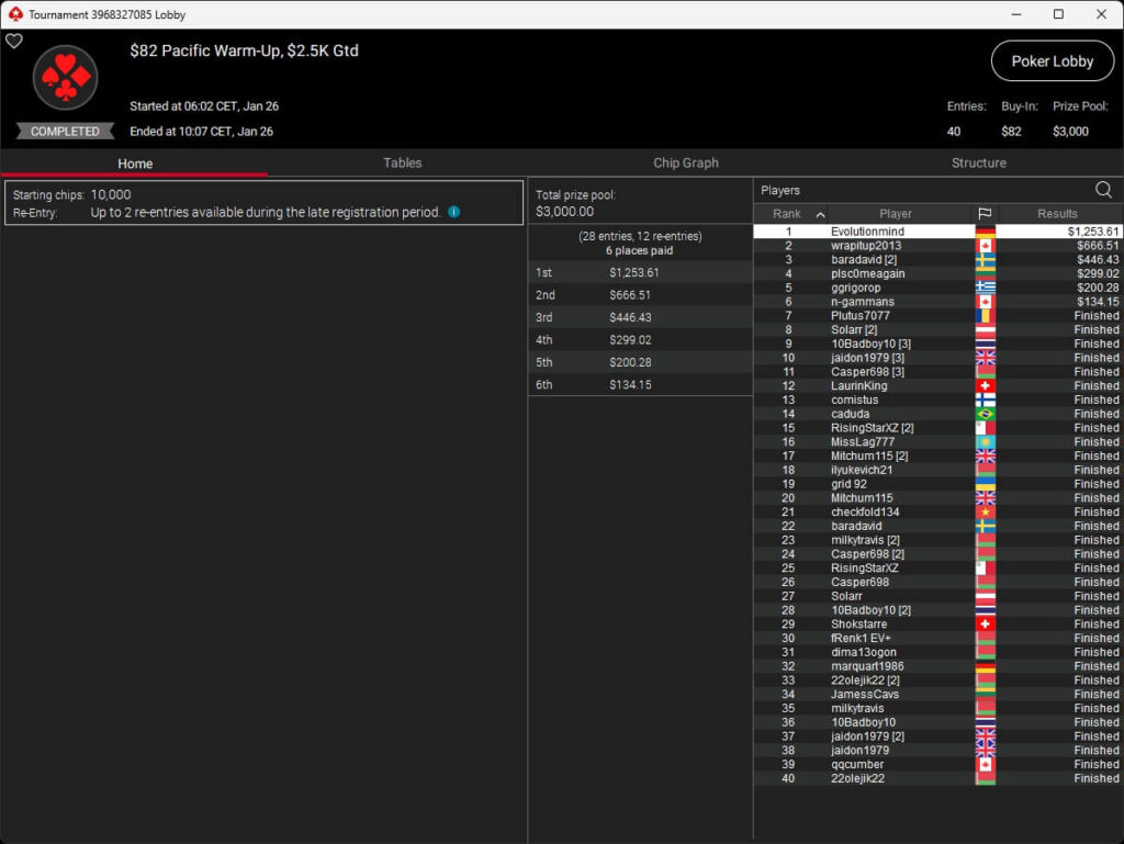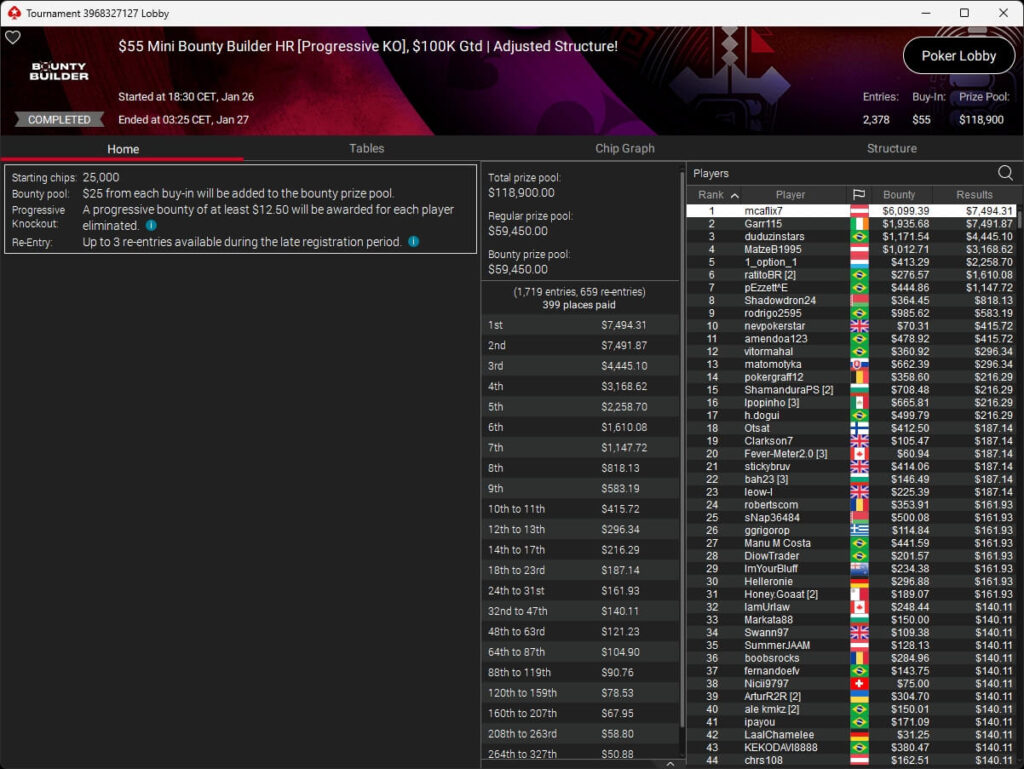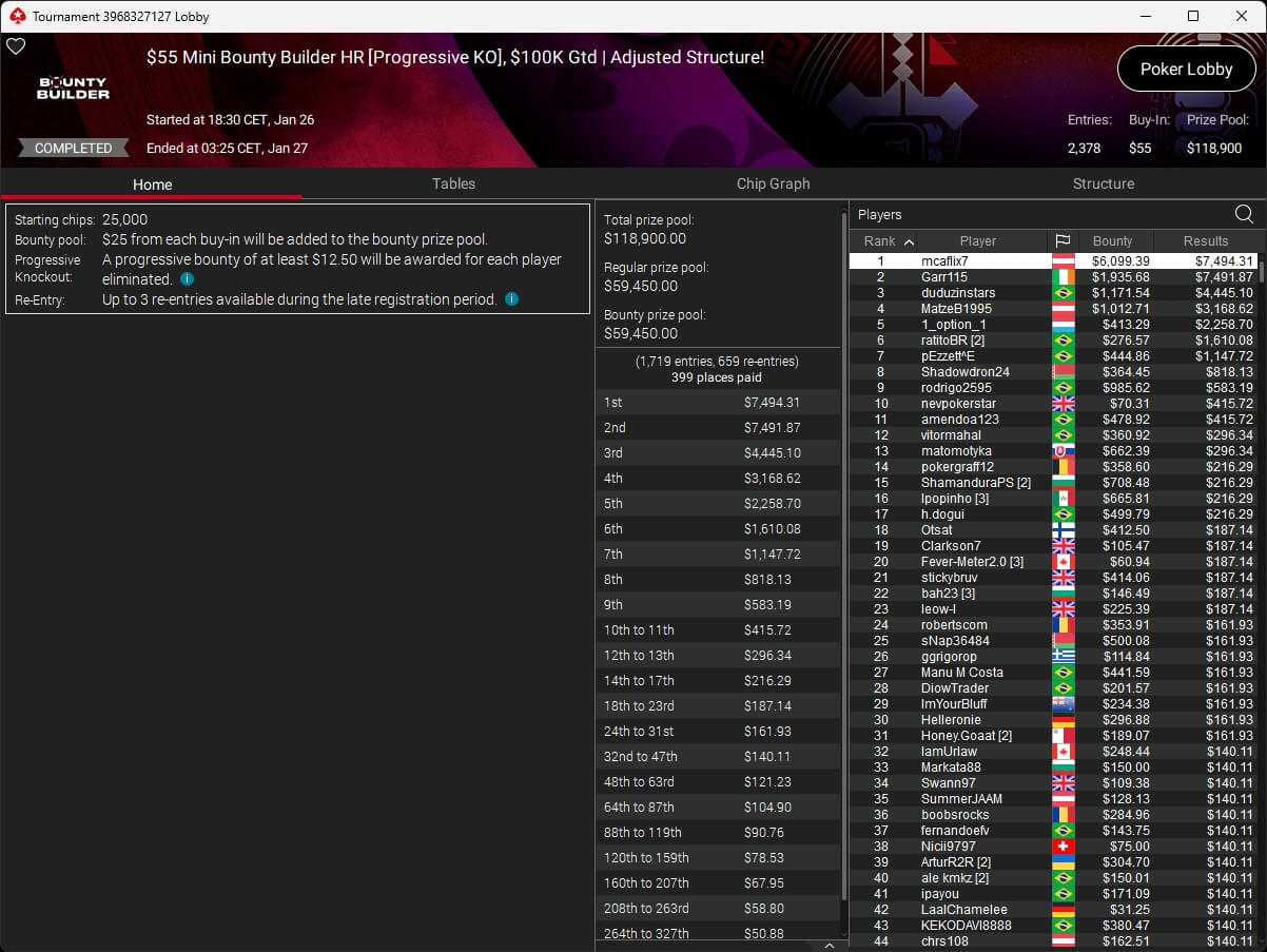 Evolutionmind ($1.253,61; $82 Pacific Warm-Up), mcaflix7 ($7.494,31 + $6.009,39; $55 Mini Bounty HR),