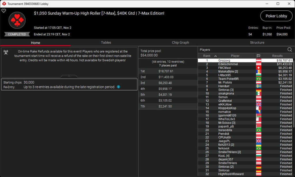 Leonard „Grozzorg“ Maue hat das Sunday Warm-Up High Roller auf PokerStars gewonnen. Sebastian „peace&loove“ Huber, Tomodoro69 und Sintoras spielten ebenfalls Titel ein.