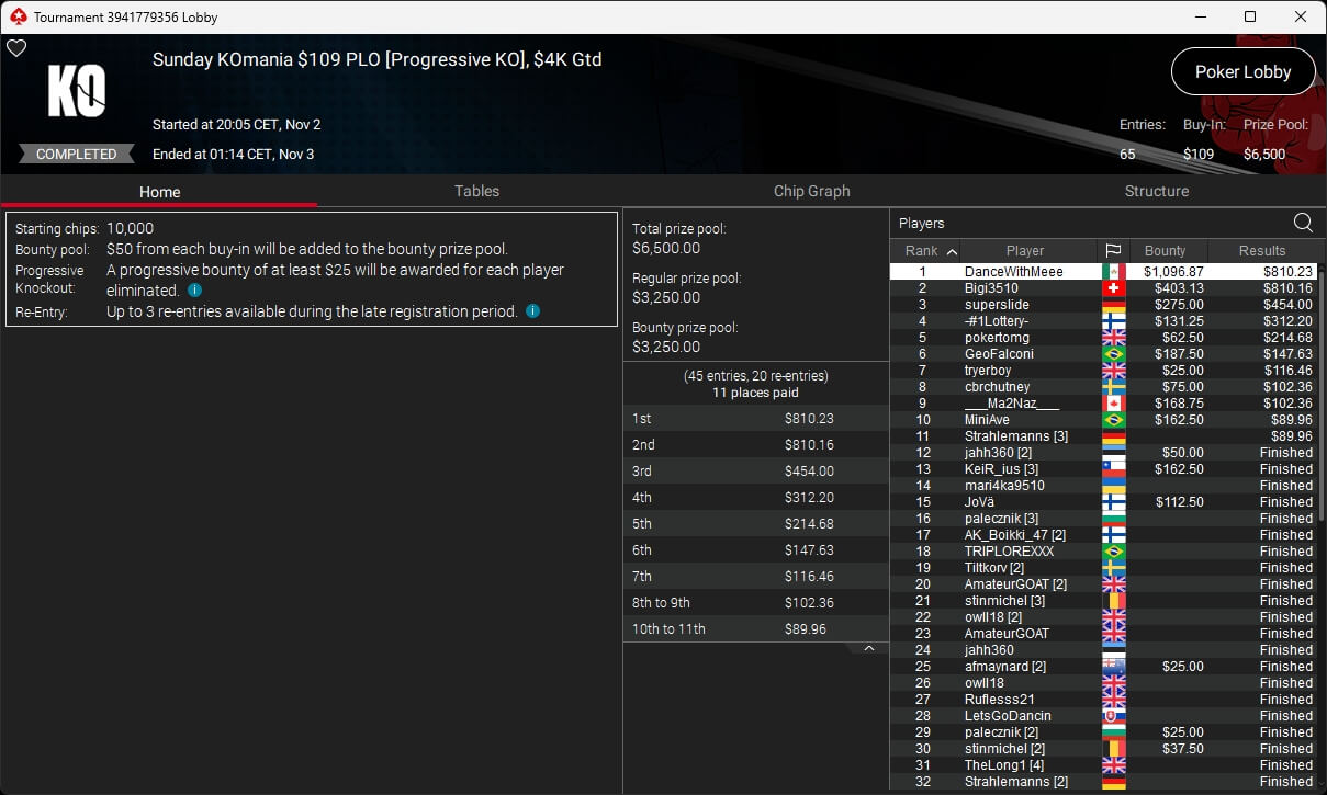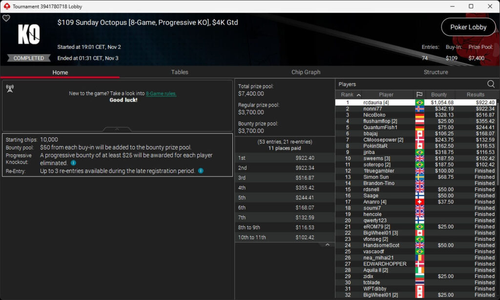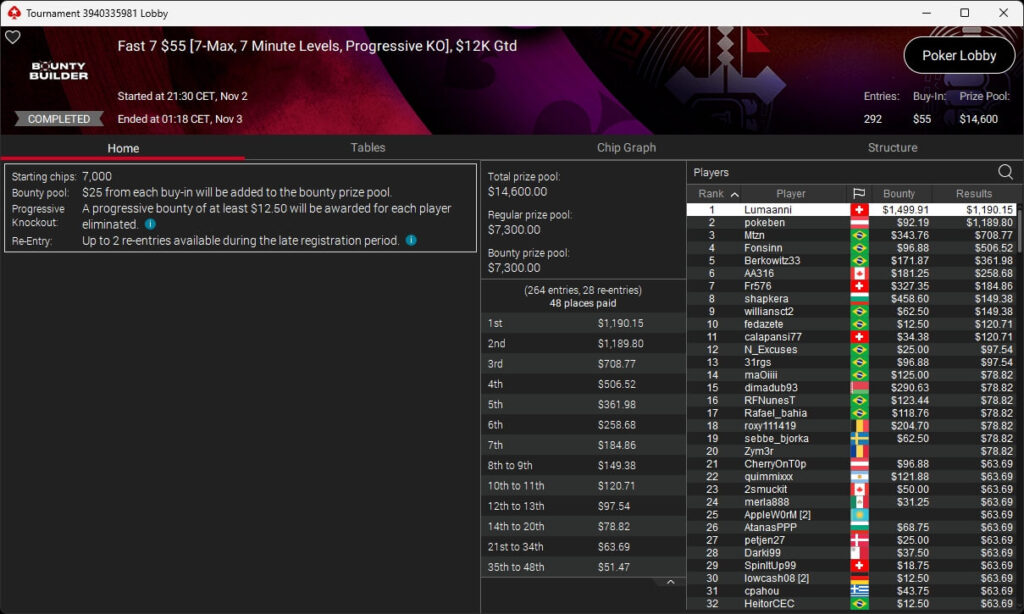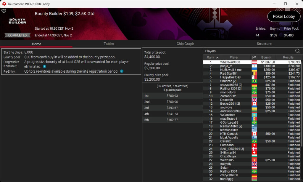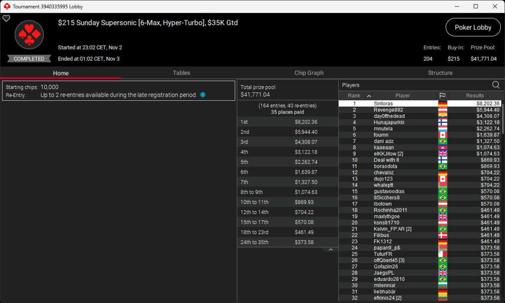 Zu den weiteren Gewinnern gehörten Sintoras ($8.202,36; $215 Sunday Supersonic), What0ver9000 ($700,93 + $1.087,50; $109 Bounty Builder), marcowhatsup ($1.359,03; $55 Sunday Clutch), Lumaanni ($1.190,15 + $1.499,91; $55 Fast 7), mhiip ($317,82 + $620,75; $55 Bounty Adrenaline), SamLuigi ($629,92 + $936,69; $55 Hotter PKO) sowie bastet2004 ($391,76 + $777,33; $55 PLO8).