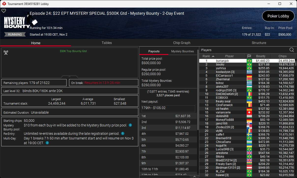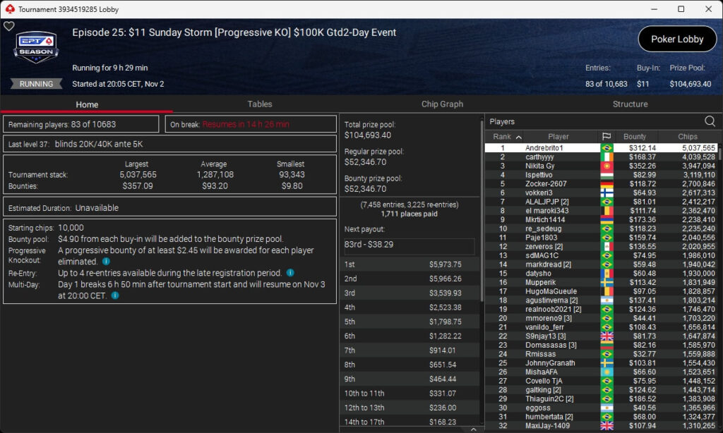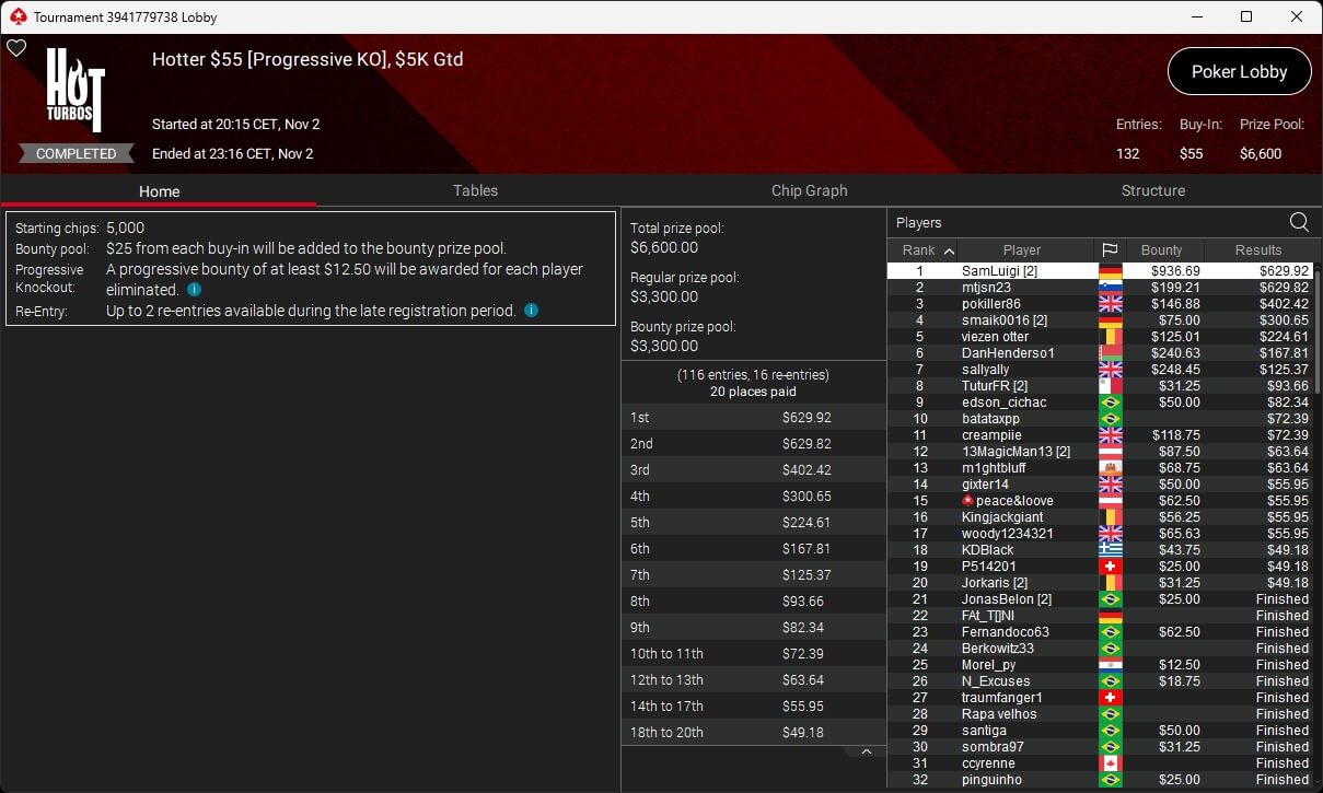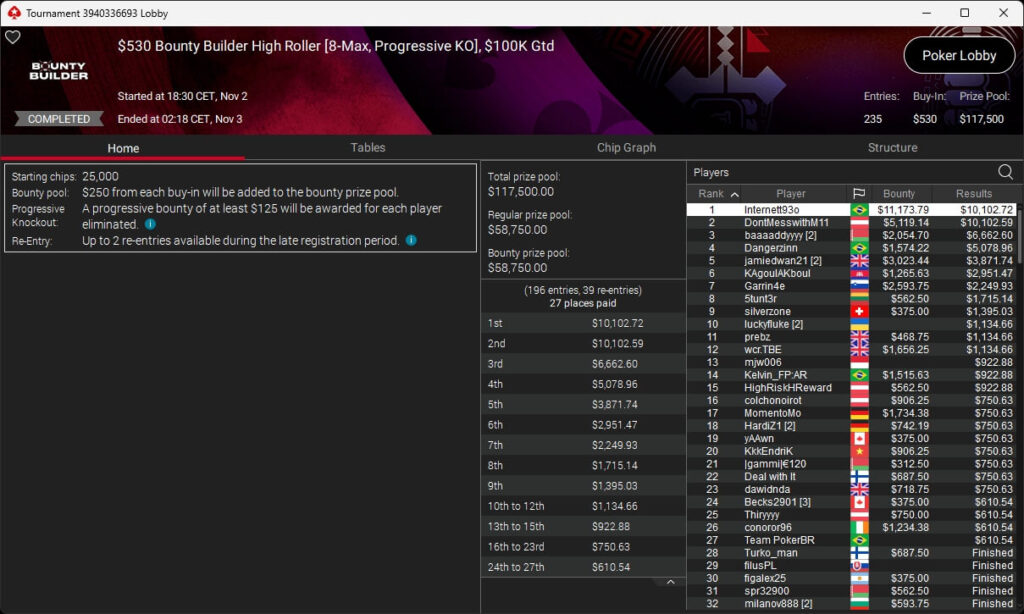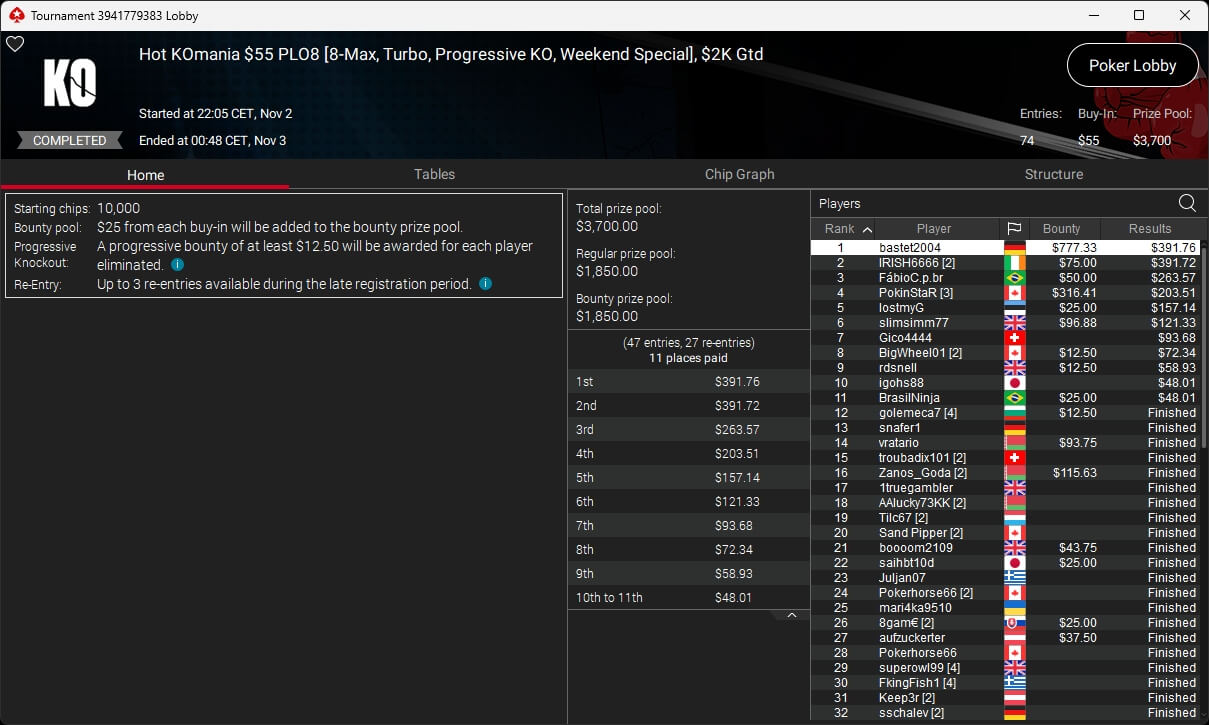 Zu den weiteren Gewinnern gehörten Sintoras ($8.202,36; $215 Sunday Supersonic), What0ver9000 ($700,93 + $1.087,50; $109 Bounty Builder), marcowhatsup ($1.359,03; $55 Sunday Clutch), Lumaanni ($1.190,15 + $1.499,91; $55 Fast 7), mhiip ($317,82 + $620,75; $55 Bounty Adrenaline), SamLuigi ($629,92 + $936,69; $55 Hotter PKO) sowie bastet2004 ($391,76 + $777,33; $55 PLO8).