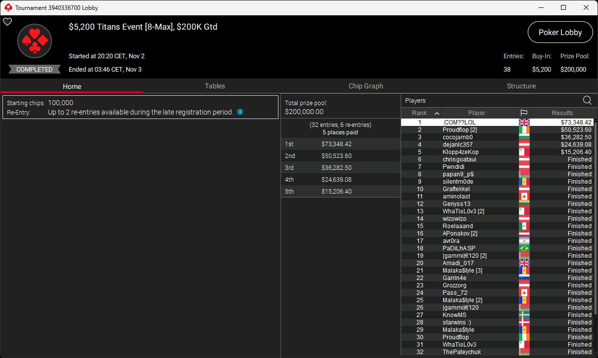 Zum $5.200 Titans traten 32 Spieler an, dazu kamen sechs Re-Entries, sodass die $200.000 GTD nicht geknackt wurden. chrisgoataui aus Österreich wurde Bubble Boy, .COM??LOL ($73.348,42) aus dem Vereinigten Königreich sicherte sich den Sieg.