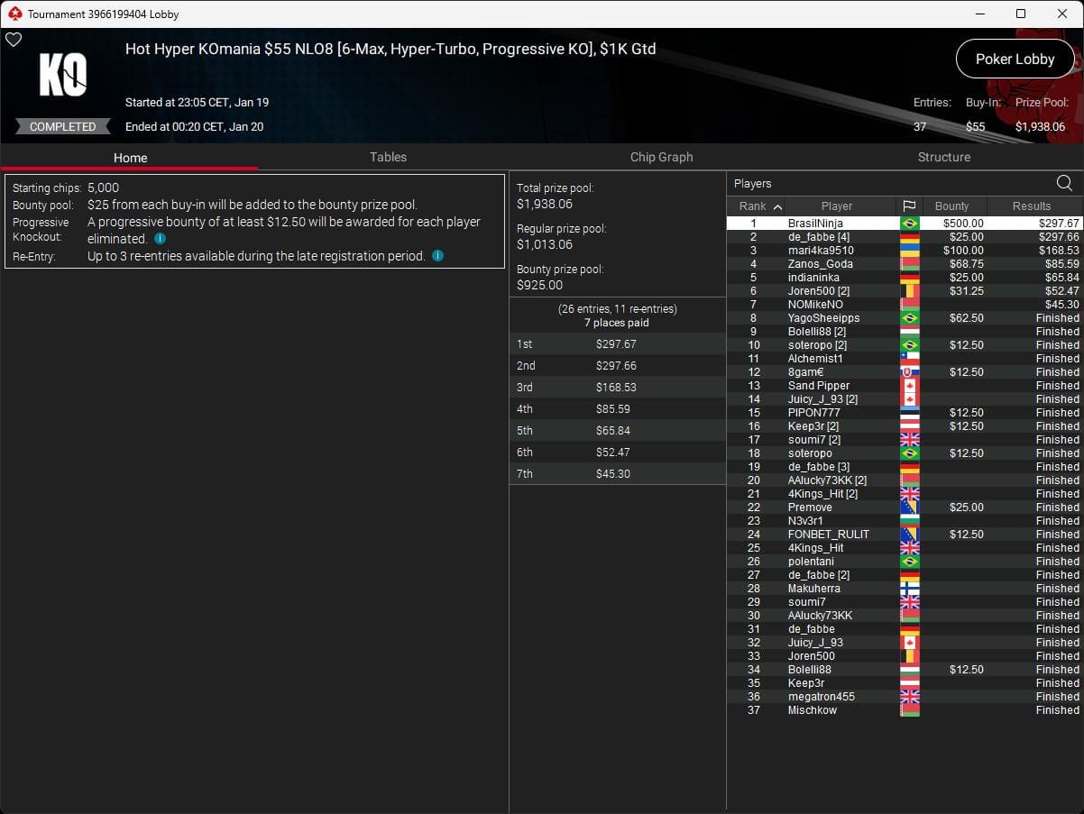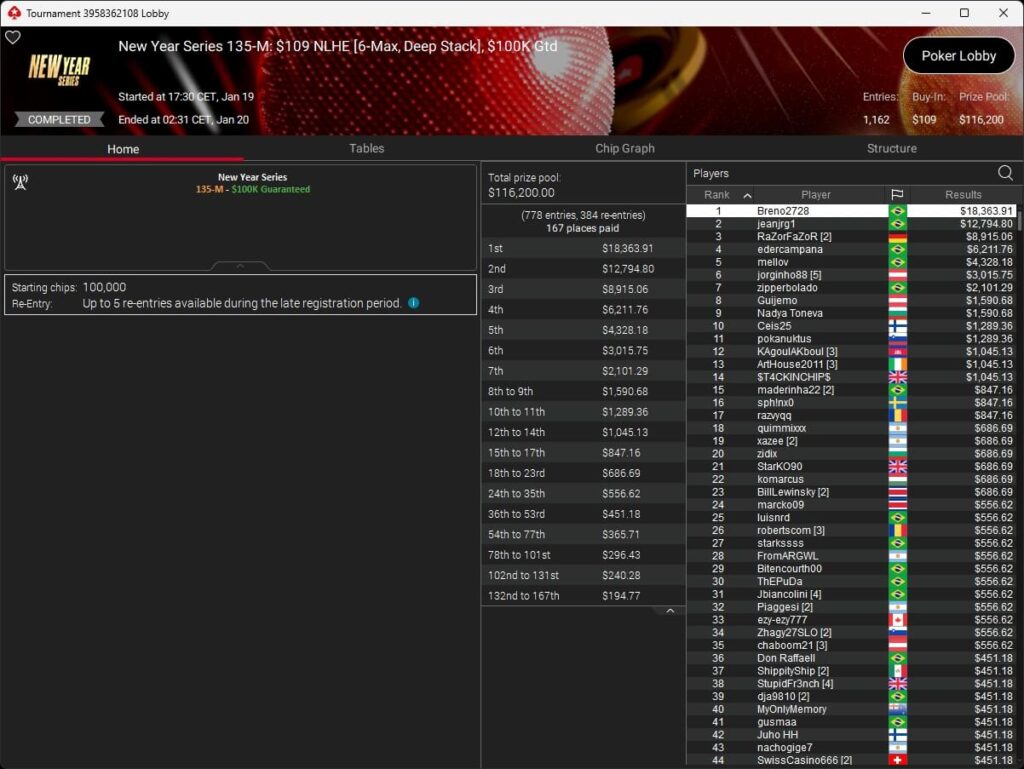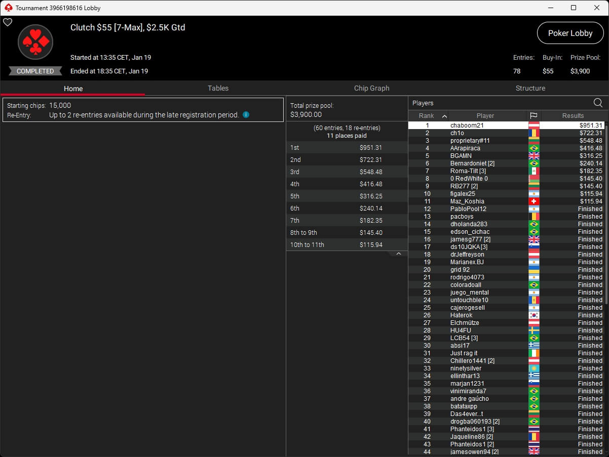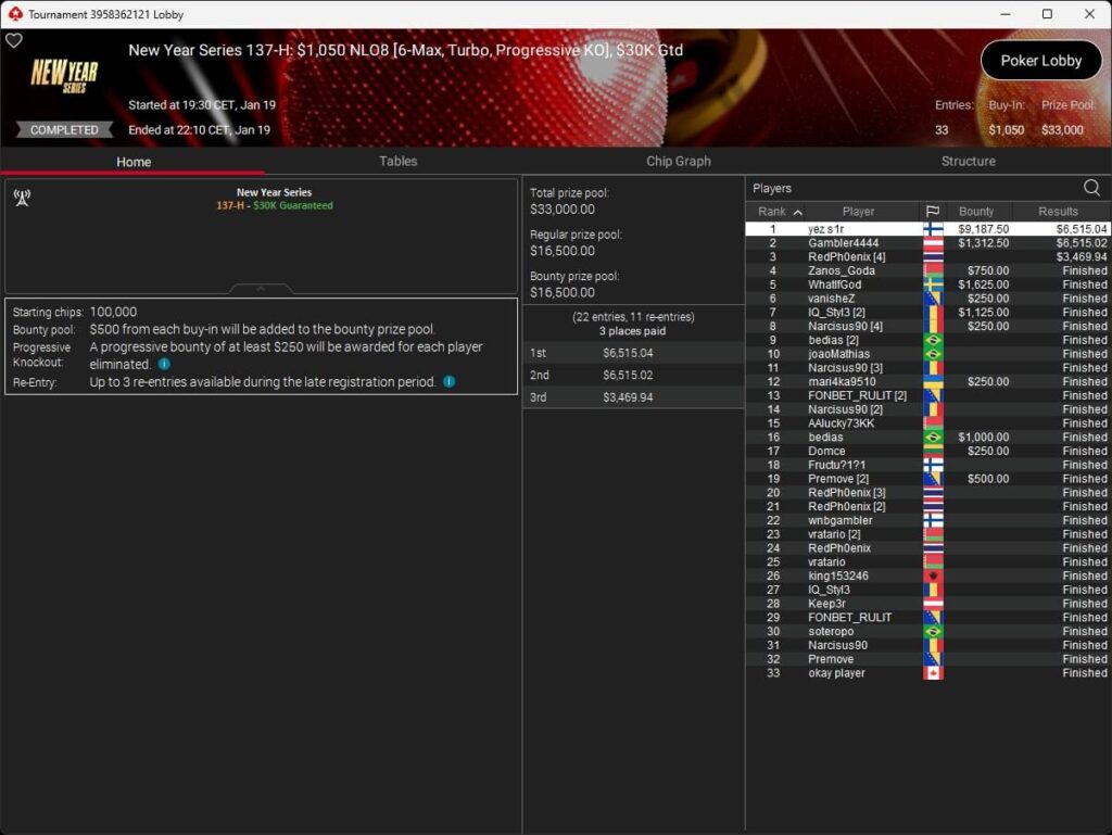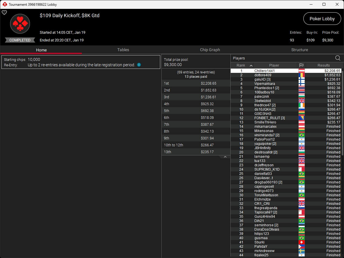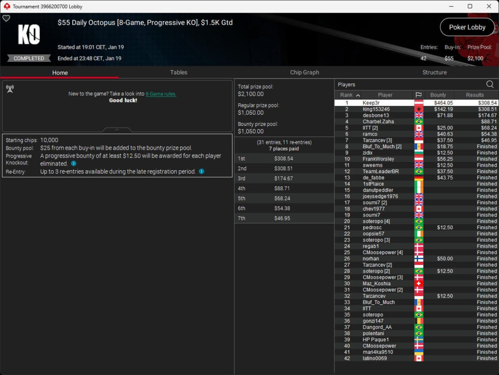 Mrnalyd ($1.714,39 + $1.376,49; $22 Adrenaline) aus der Schweiz spielte bei der New Year Series auf PokerStars ebenfalls einen Titel ein. Mit Chillero1441 ($2.208,65; $109 Kickoff), chaboom21 ($951,31; $55 Clutch) und Keep3r ($308,54 + $464,05; $55 Daily Octopus) verbuchte die DACH-Gemeinde auch Siege bei den regulären MTTs.