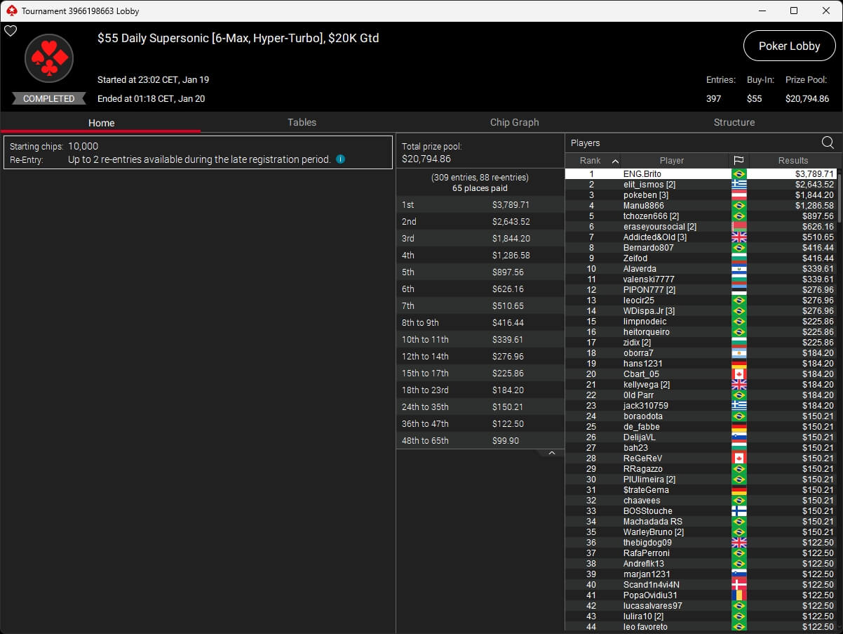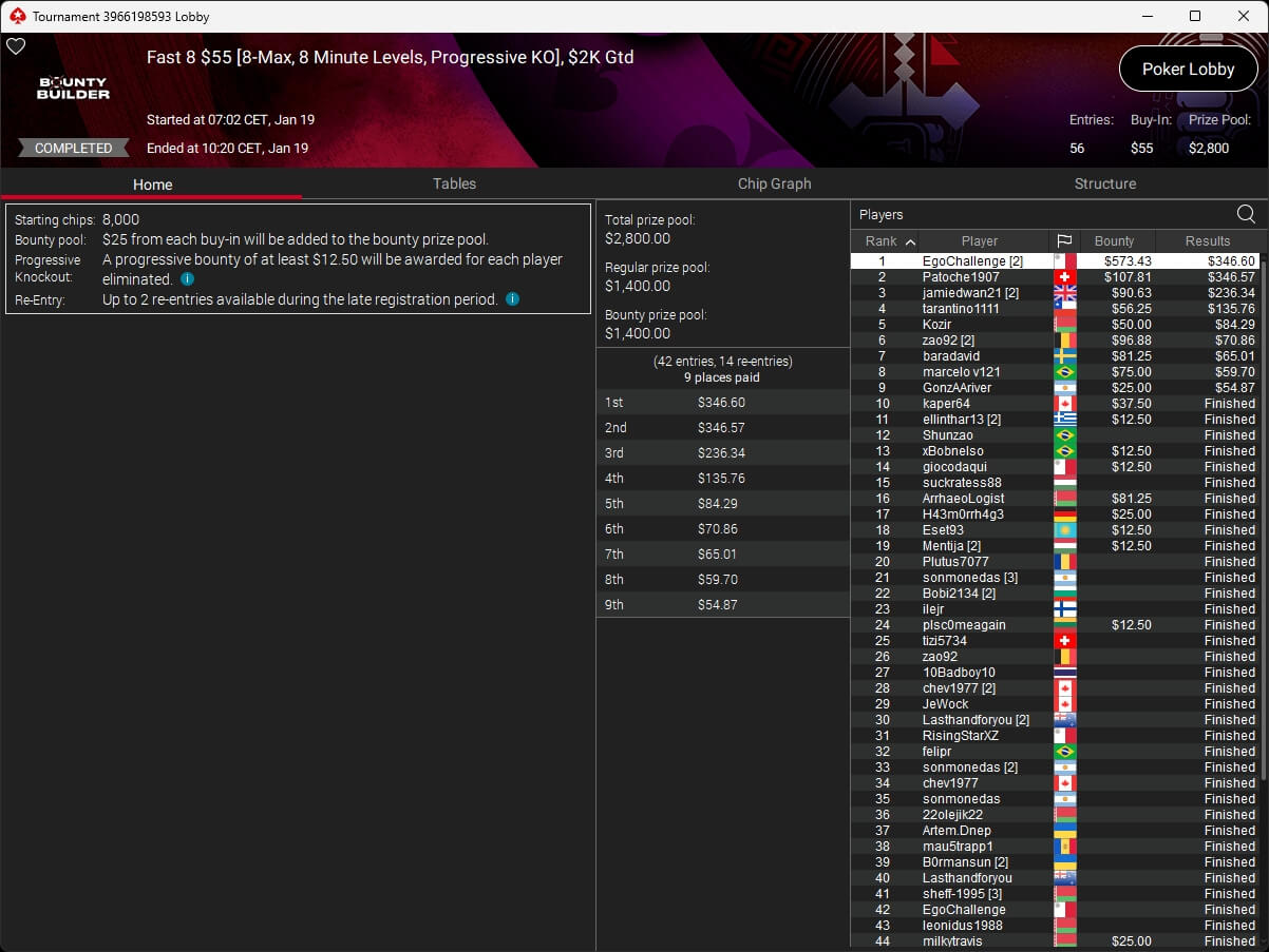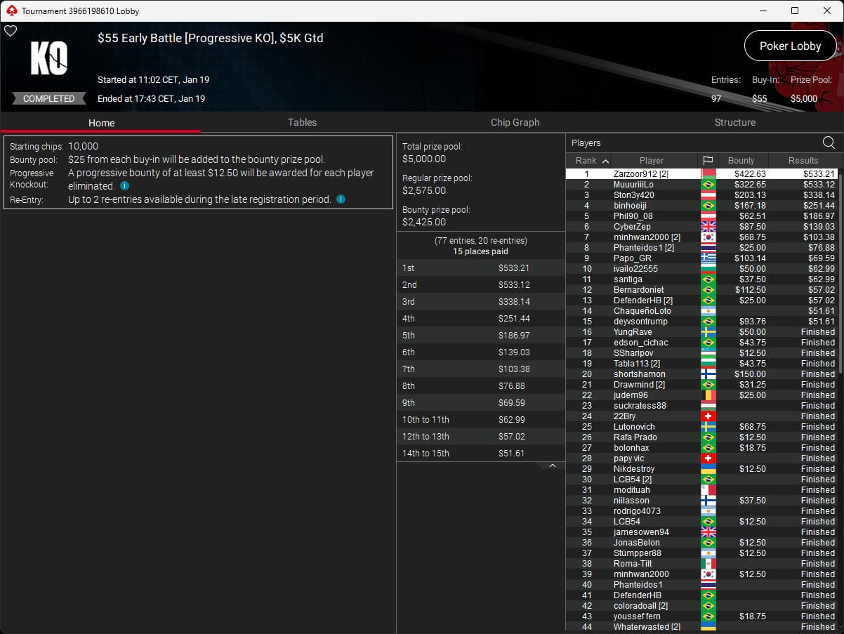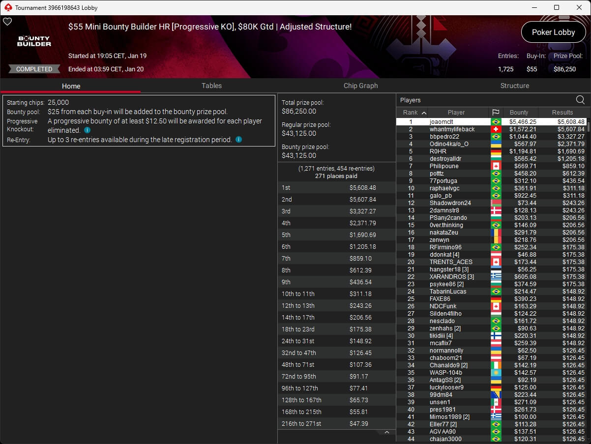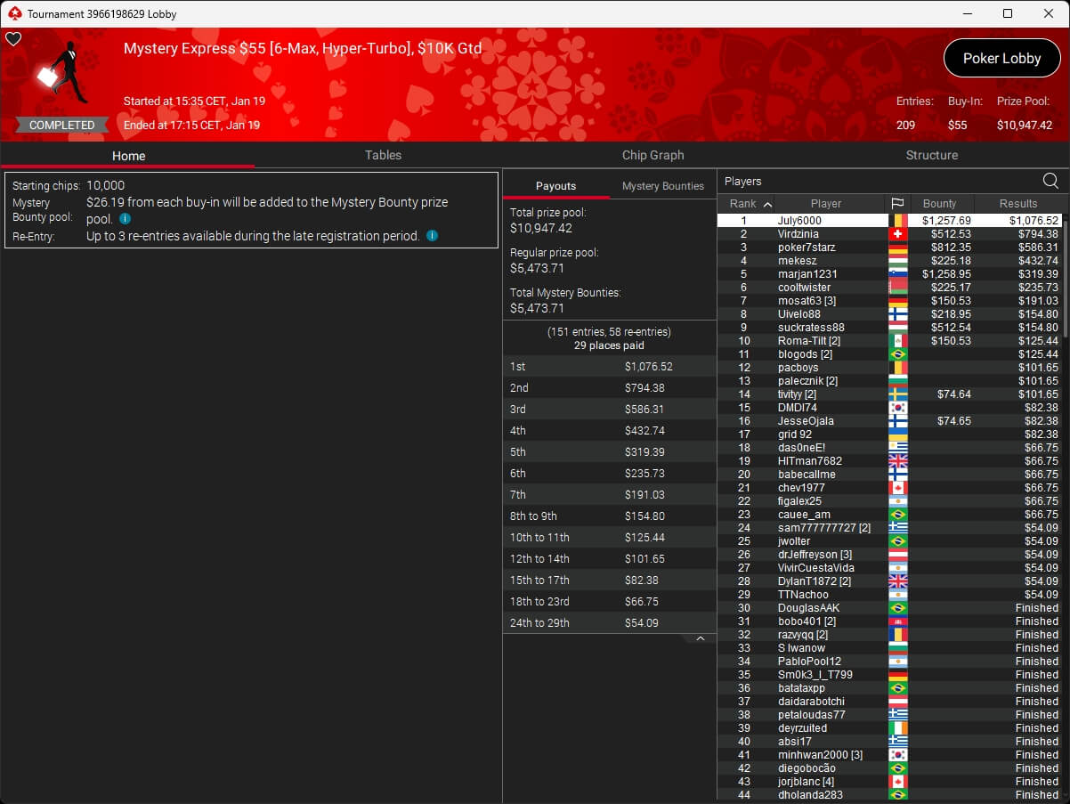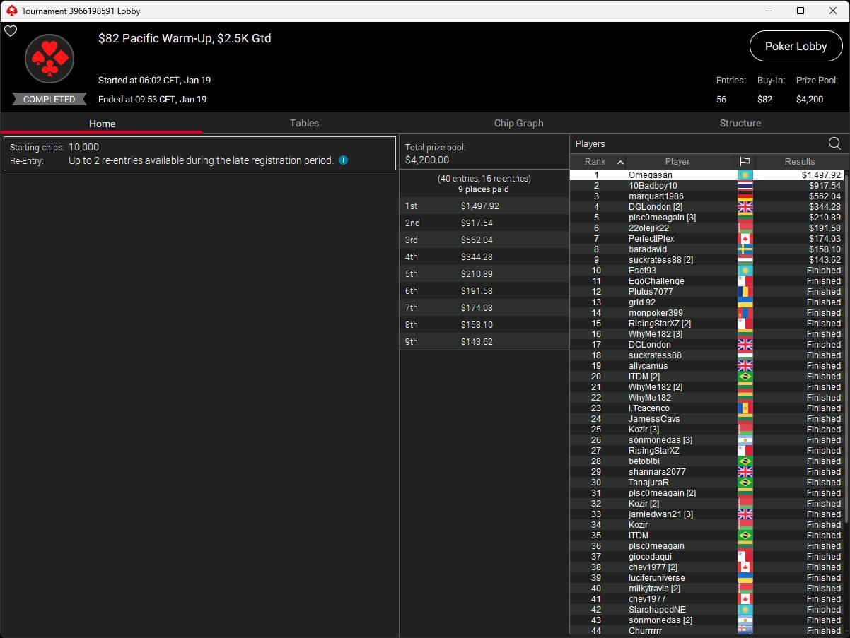Mrnalyd ($1.714,39 + $1.376,49; $22 Adrenaline) aus der Schweiz spielte bei der New Year Series auf PokerStars ebenfalls einen Titel ein. Mit Chillero1441 ($2.208,65; $109 Kickoff), chaboom21 ($951,31; $55 Clutch) und Keep3r ($308,54 + $464,05; $55 Daily Octopus) verbuchte die DACH-Gemeinde auch Siege bei den regulären MTTs.