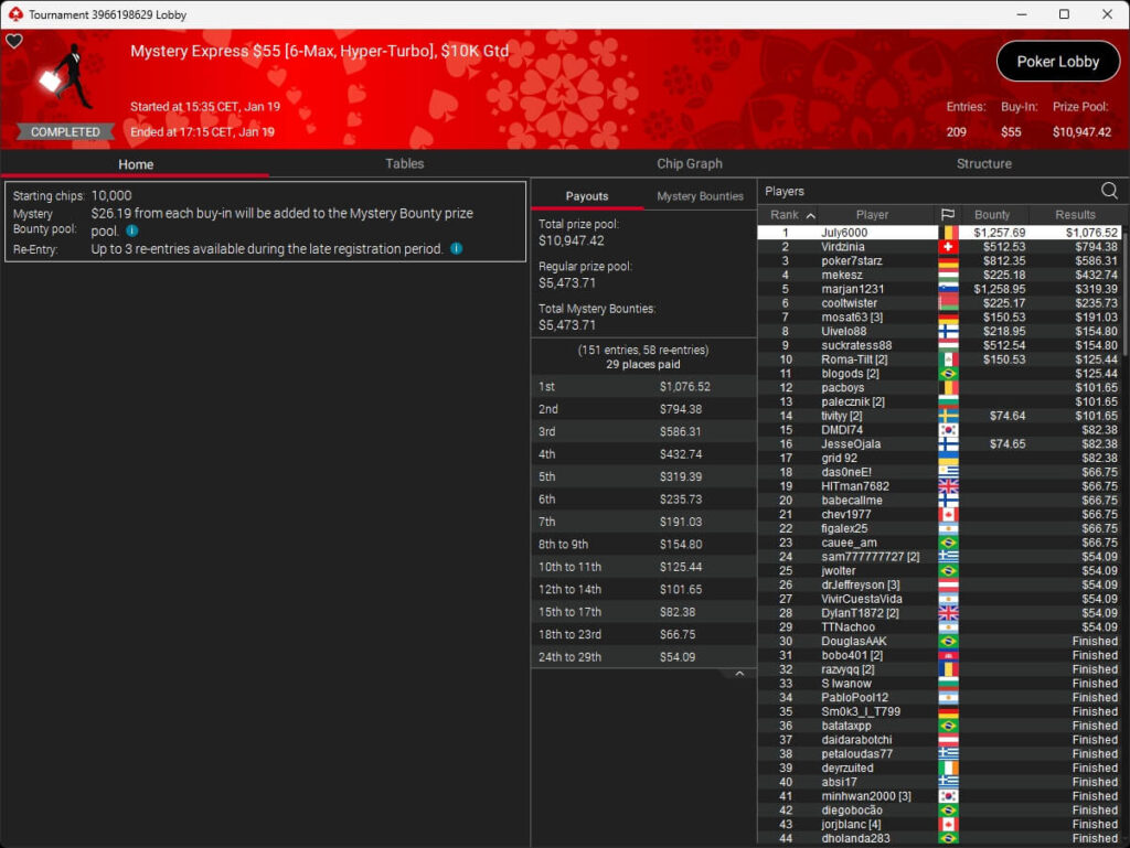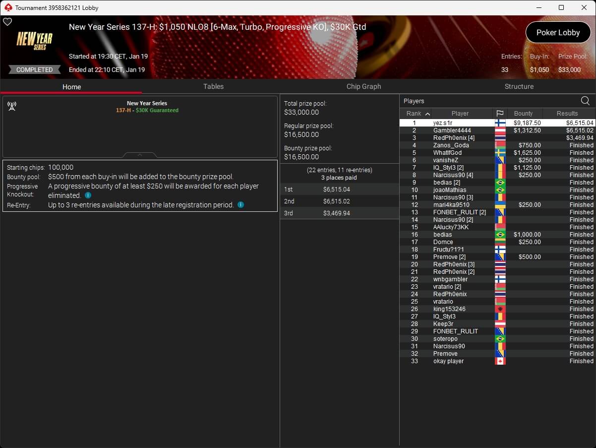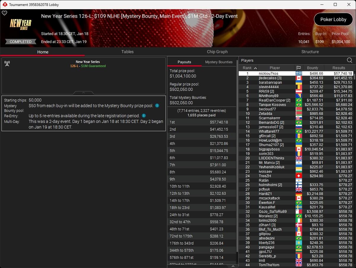 Bei der New Year Series 2026 standen die Entscheidungen im Main Event an. Im $109 Mystery Bounty Main Event setzte sich am Ende der Grieche nickiou7kos ($57.740,18 + $496,66) gegen jtedecaliss (2./$41.452,15 + $364,69) aus Kanada durch. RRi59 (5./$15.344,75 + $209,47) aus Österreich gehörte zu den Finalisten. Erfolgreichster Kopfgeldjäger war der Brasilianer wdias (840./$159,14 + $100.000).