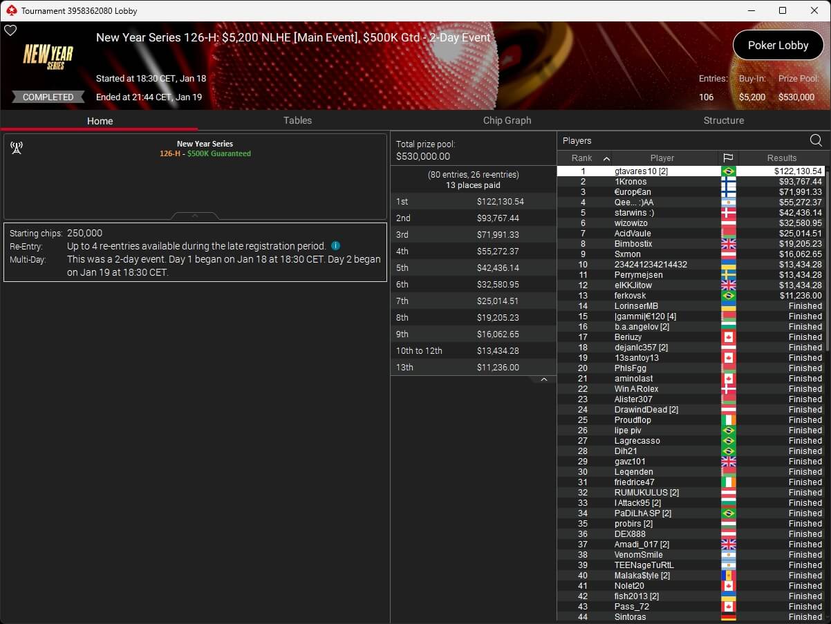 Poker-Pro Gabriel „gtavares10“ Tavares hat das $5k Main Event der New Year Series auf PokerStars gewonnen. JaegsPL und nickiou7kos setzten sich bei den Medium- und Low-Turnieren durch.