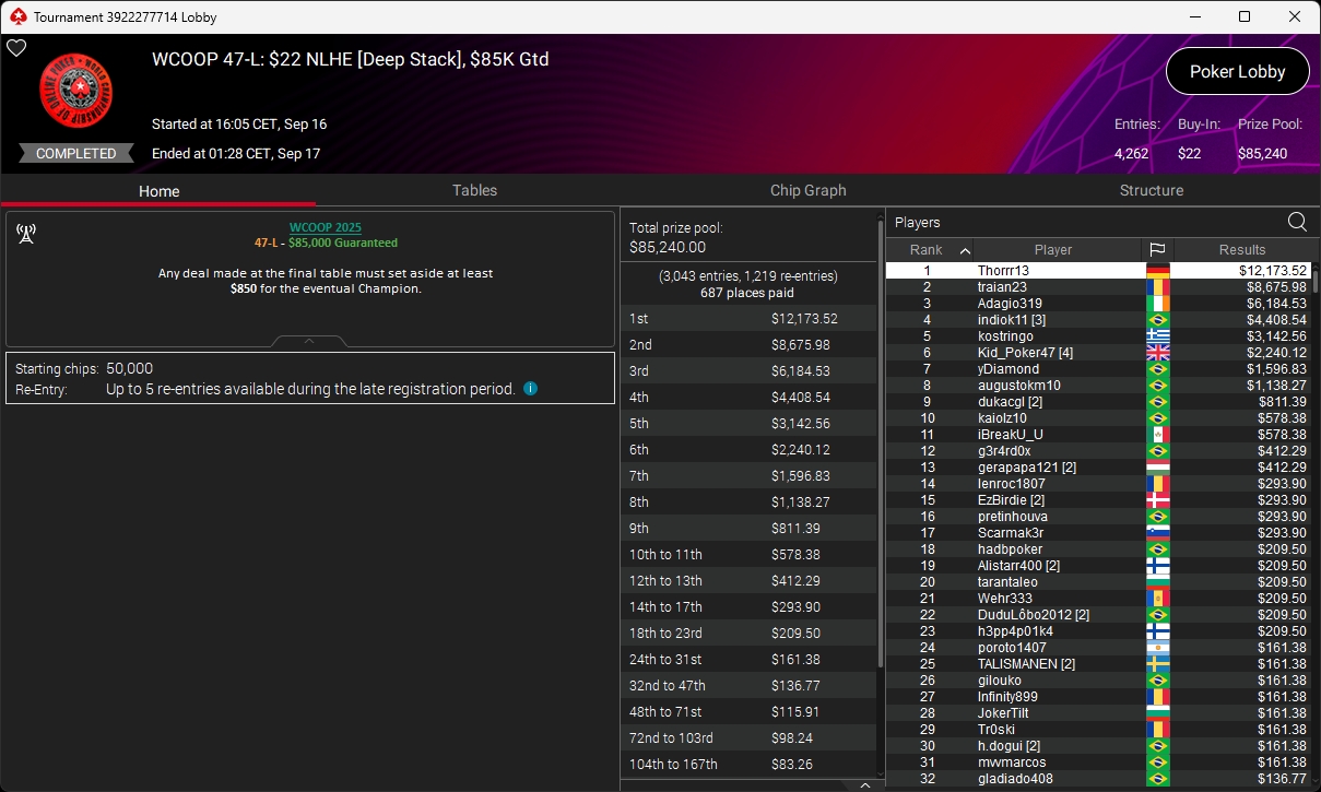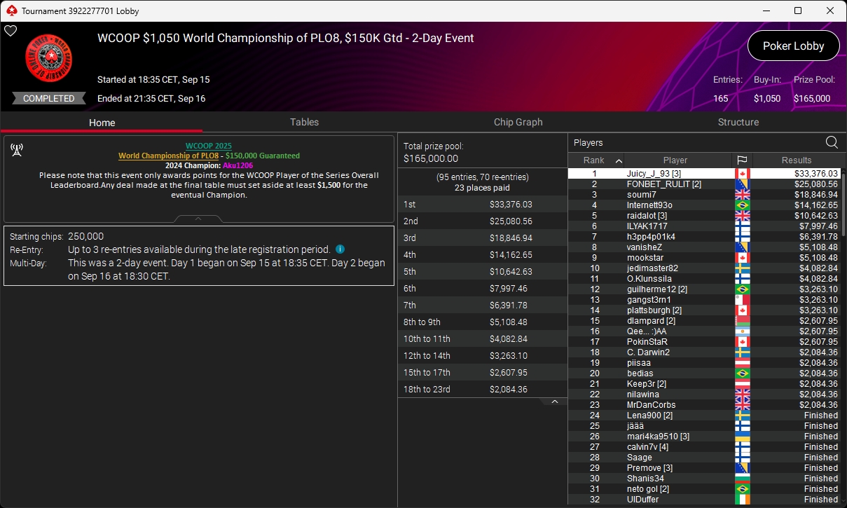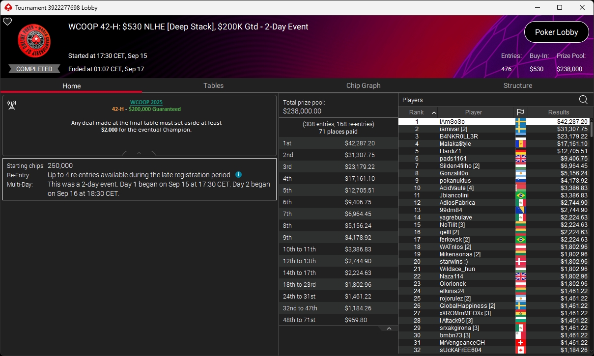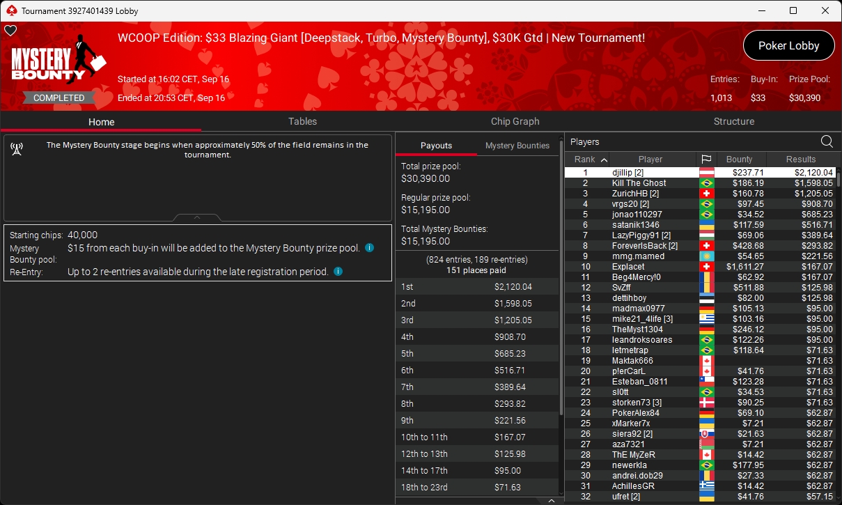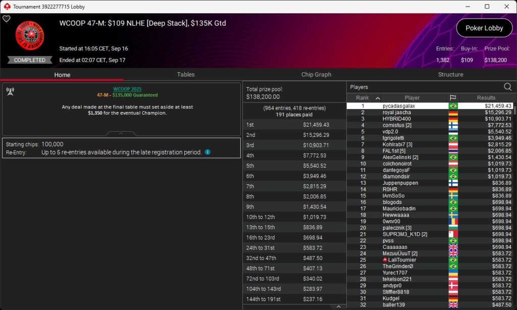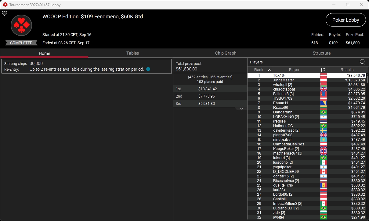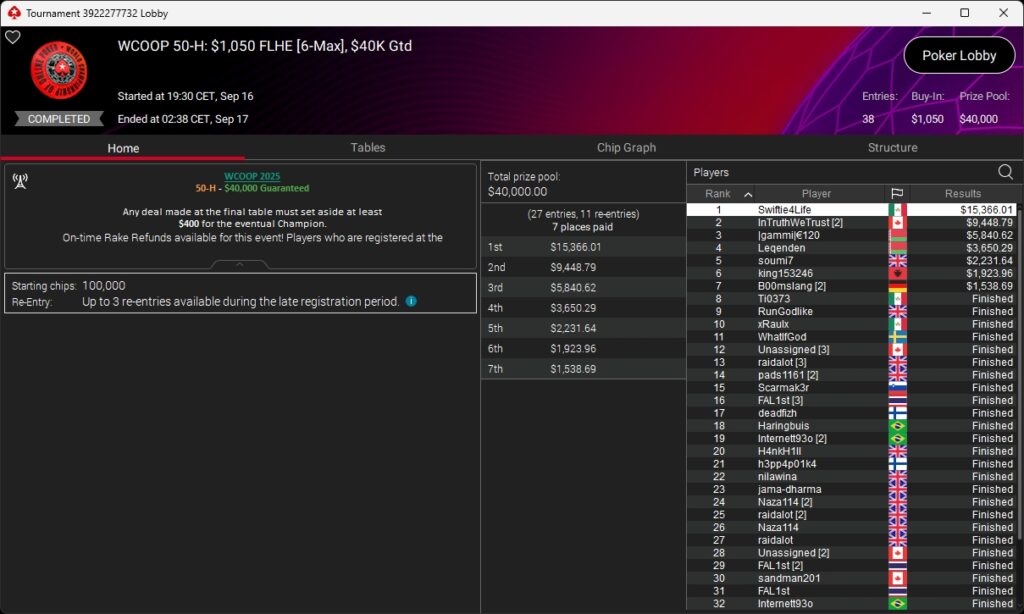 Bei den WCOOP Side Events sicherten sich nach Heads-Up-Deal T0X16- ($8.546,79) und XingsMaster (2./$10.073,58) einen Doppelsieg. djillip ($2.120,04 + $237,71) setzte sich im $33 Blazing Giant durch. Deep Runs mit dicken Cashes sicherten sich HardiZ1 (5./$12.705,51; $530 NLHE Deep Stack) sowie royal jascha (2./$15.296,29) und HYBRID400 (3./$10.903,71; beide $109 Deep Stack).