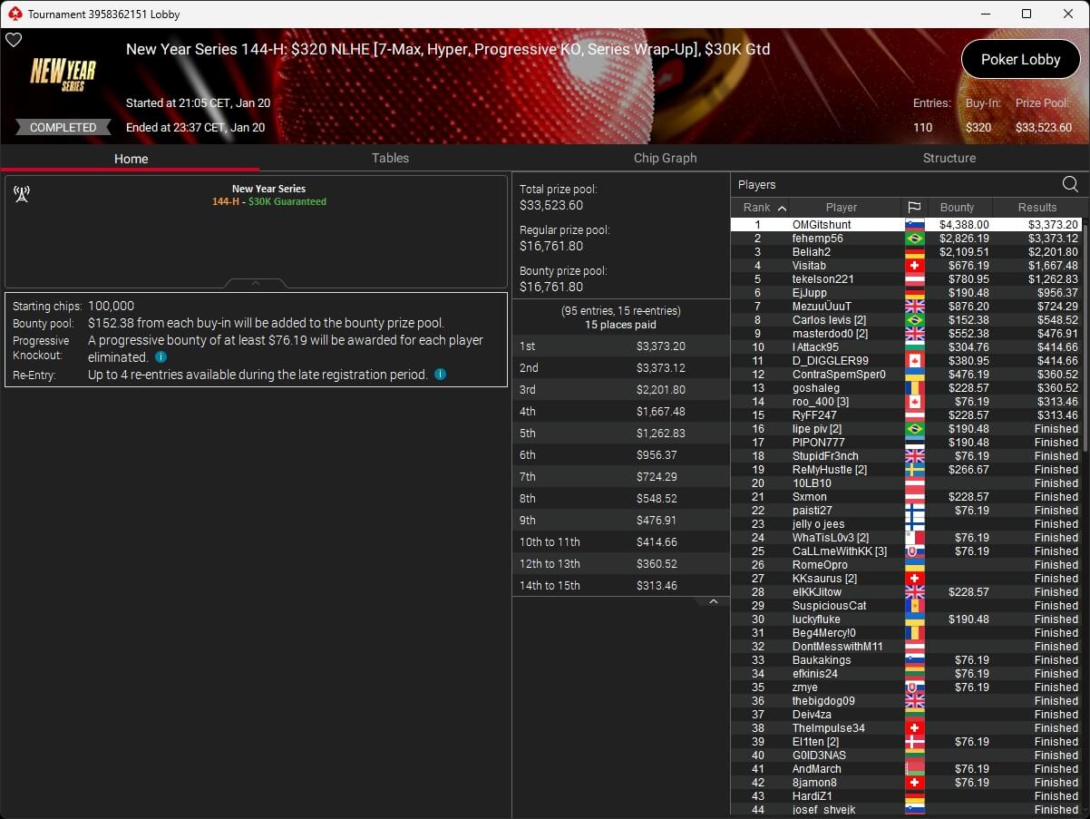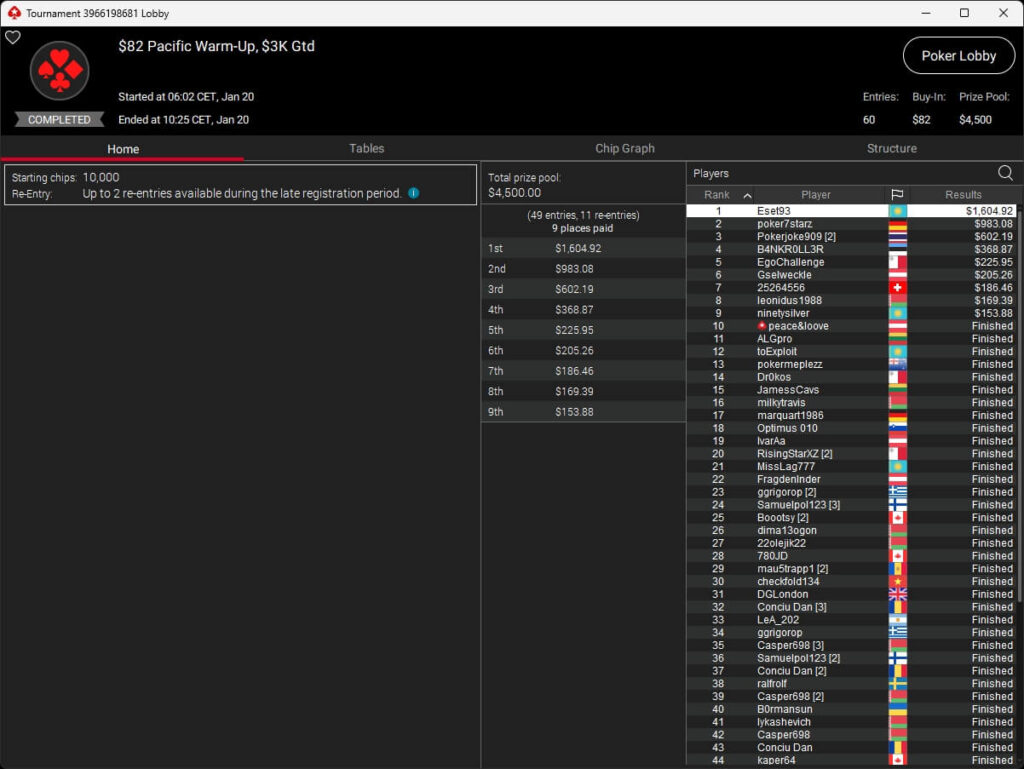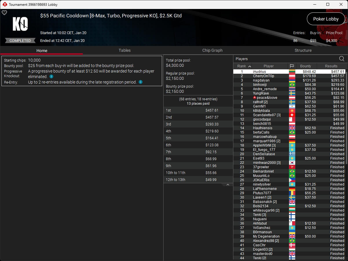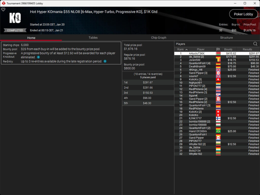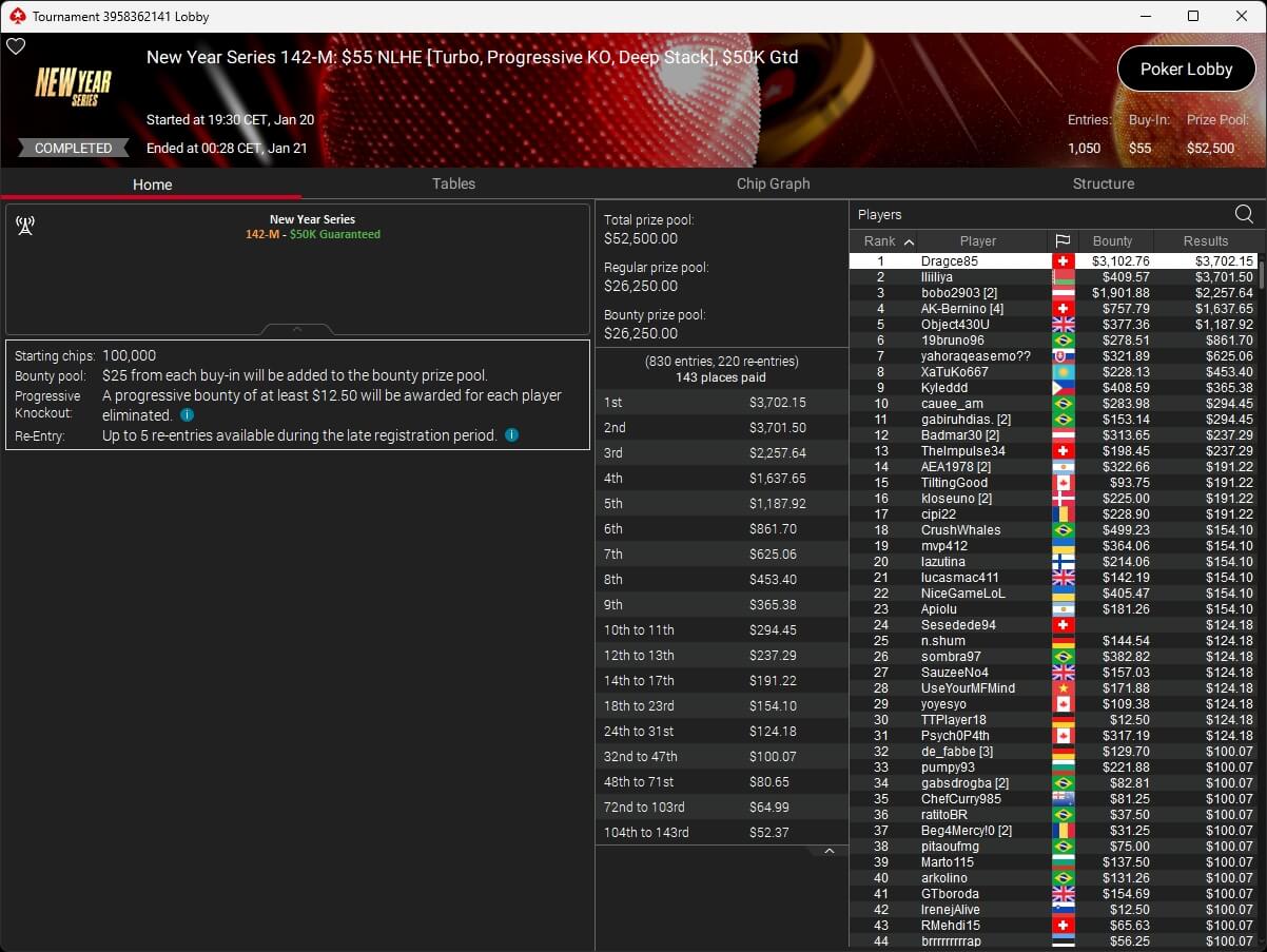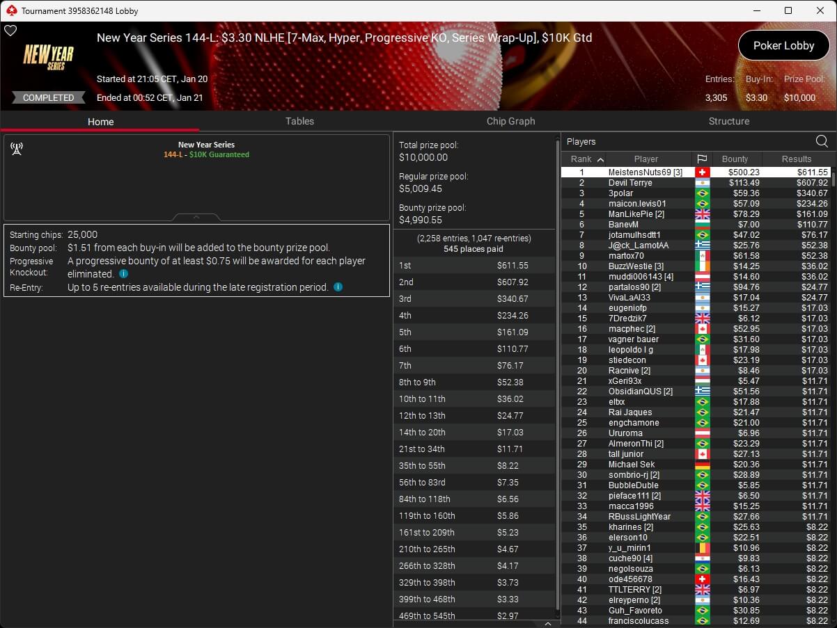 Zum Abschluss der Series trugen sich Dragce85 ($3.702,15 + $3.102,76; $55 NLHE PKO Turbo) und MeistensNuts69 ($611,55 + $500,23; $3,30 NLHE 7-Max Hyper PKO) in die Liste der Gewinner ein. fu_house_86_ (2./$8.950,63; $109 Super Tuesday) schrammte knapp an einem Titel vorbei.