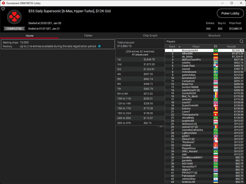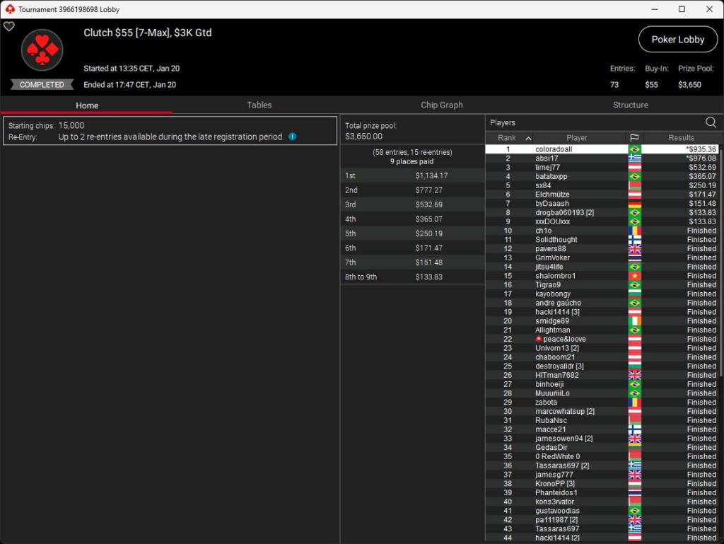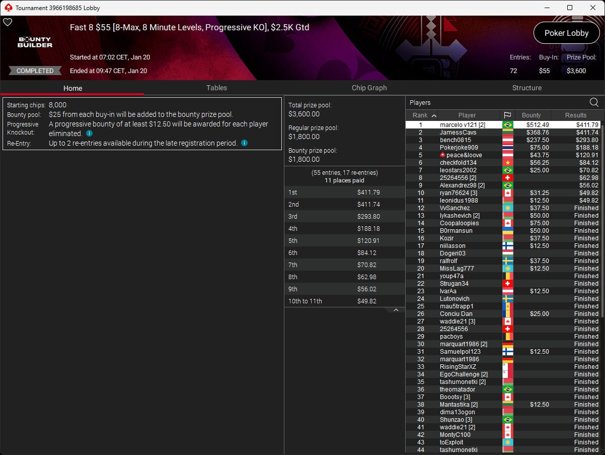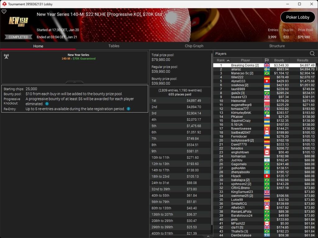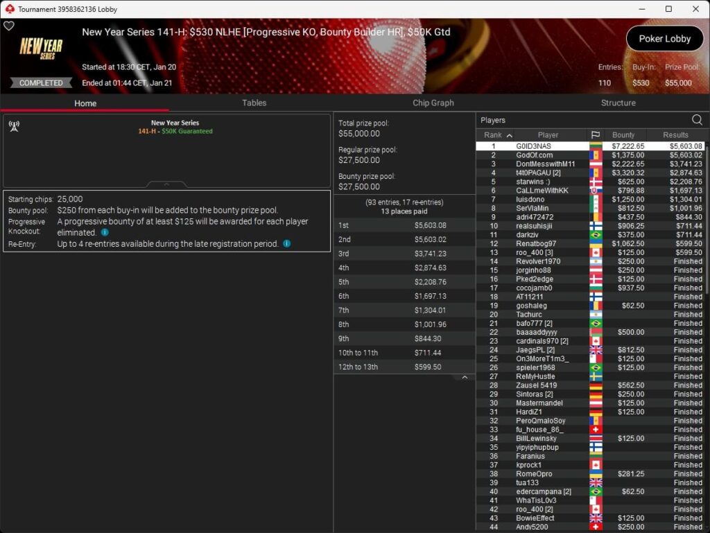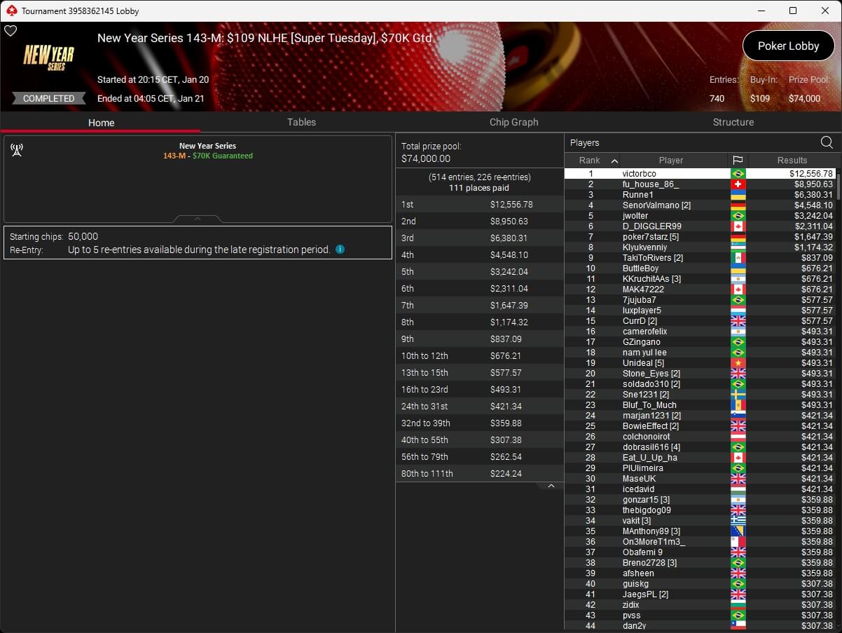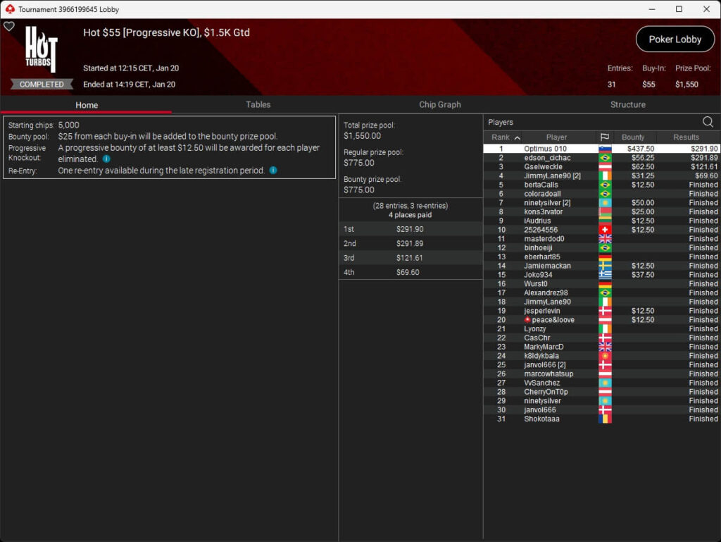 Zum Abschluss der Series trugen sich Dragce85 ($3.702,15 + $3.102,76; $55 NLHE PKO Turbo) und MeistensNuts69 ($611,55 + $500,23; $3,30 NLHE 7-Max Hyper PKO) in die Liste der Gewinner ein. fu_house_86_ (2./$8.950,63; $109 Super Tuesday) schrammte knapp an einem Titel vorbei.