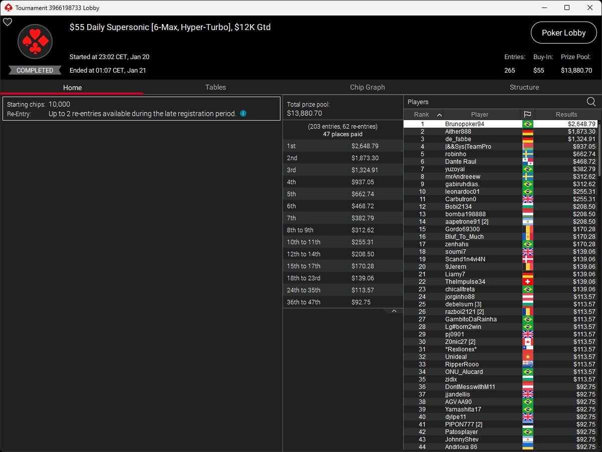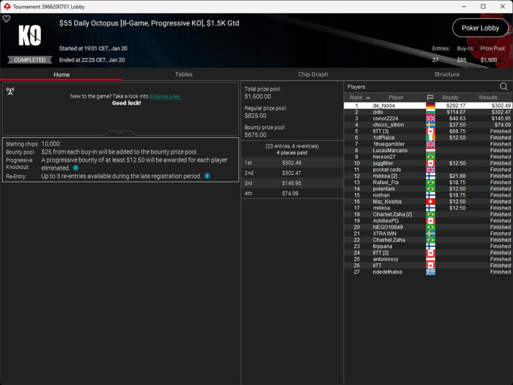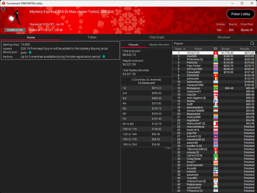 Bei den regulären MTTs auf PokerStars waren die Spieler aus unseren Breitengraden ebenfalls erfolgreich. So gehörten 161021 ($874,22 + $1.778,40; $55 Mystery Express) und de_fabbe ($302,49 + $292,17; $55 Daily Octopus) zu den Siegern.
