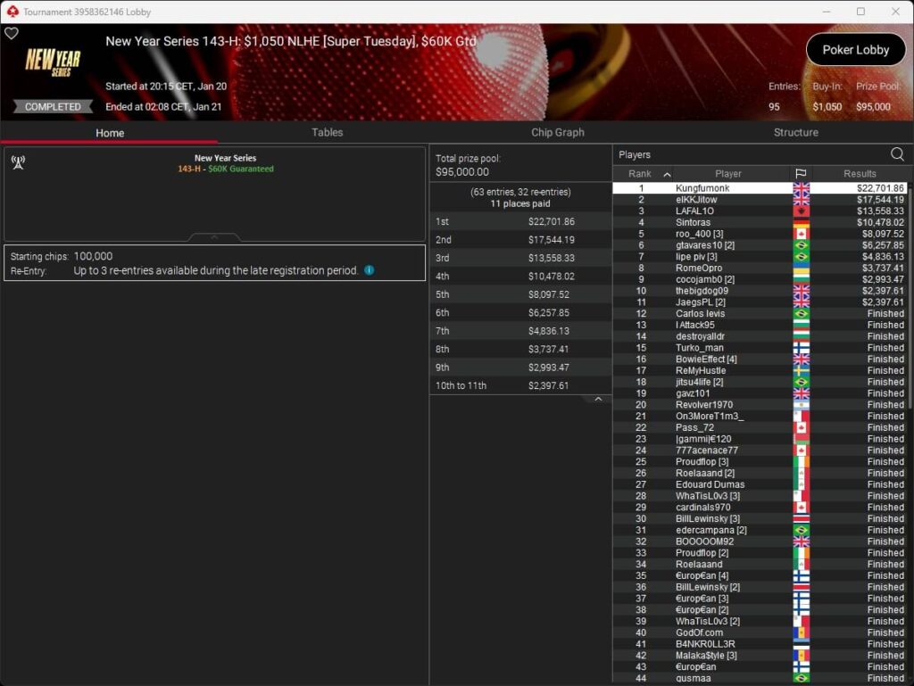 Die deutschsprachige Poker-Community spielte zum Ende der New Year Series auf PokerStars zwei Turniersiege ein. Im $1.050 Super Tuesday ging der Titel an den Briten Kungfumonk.