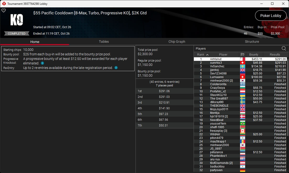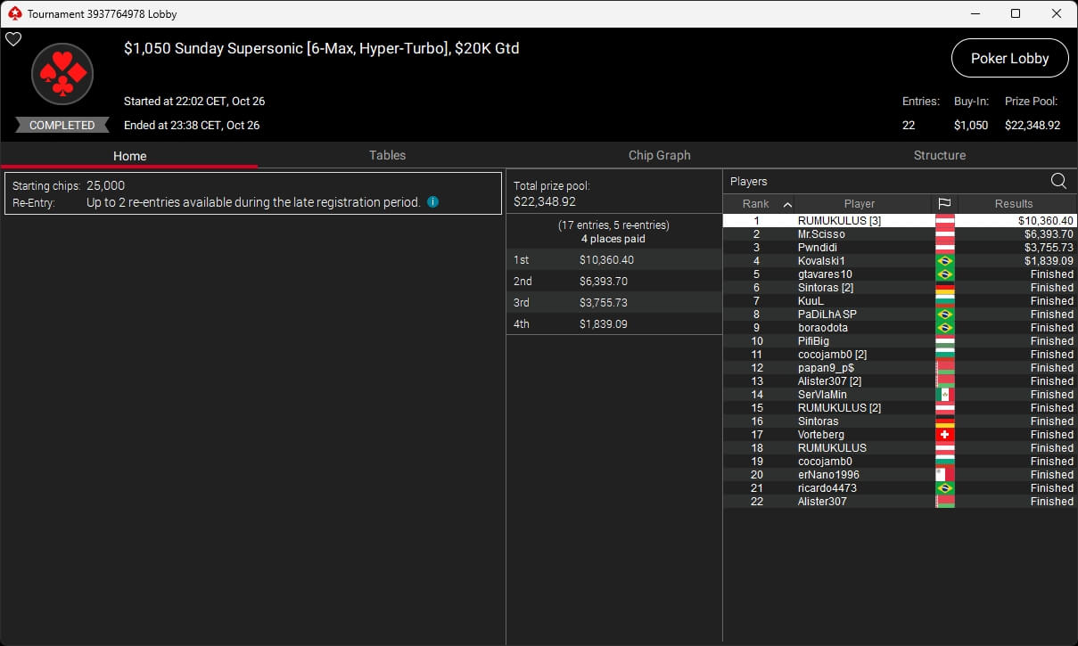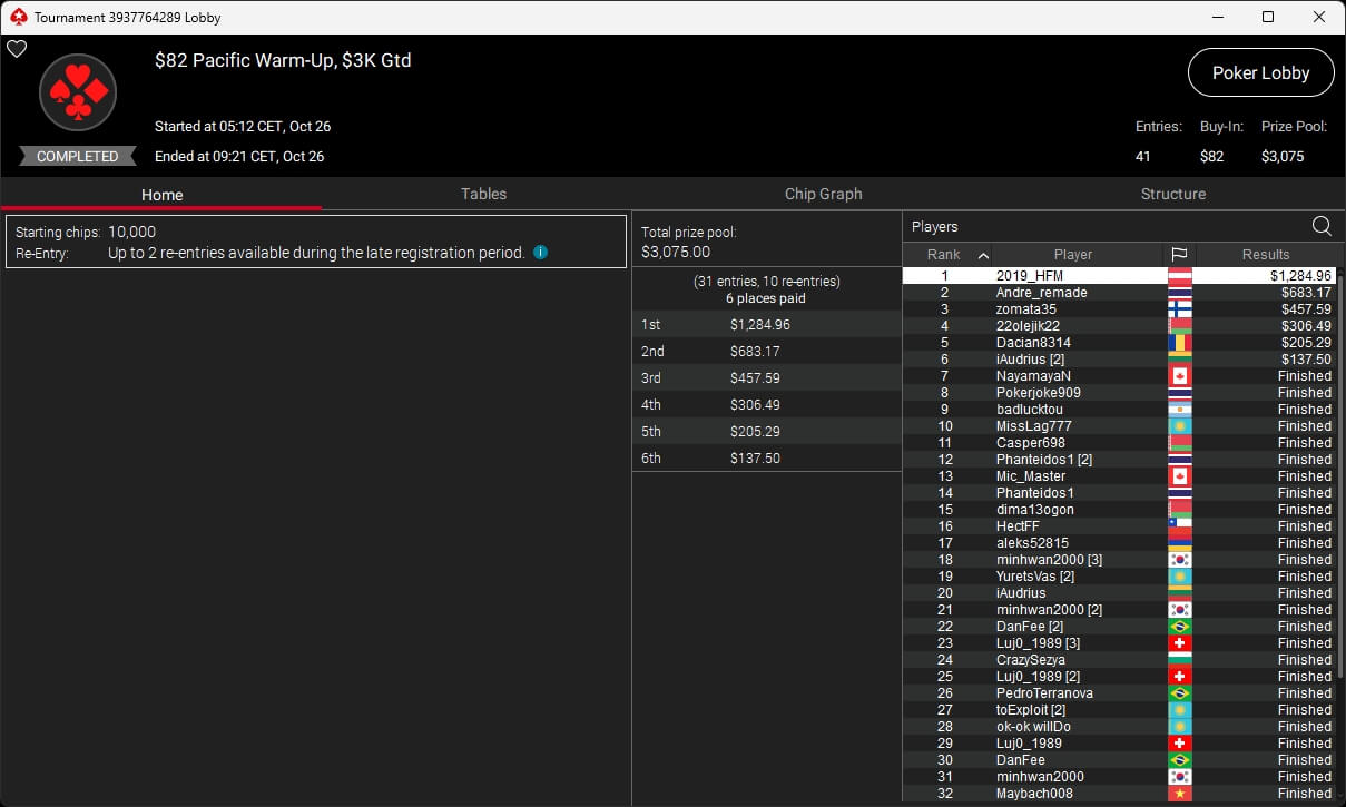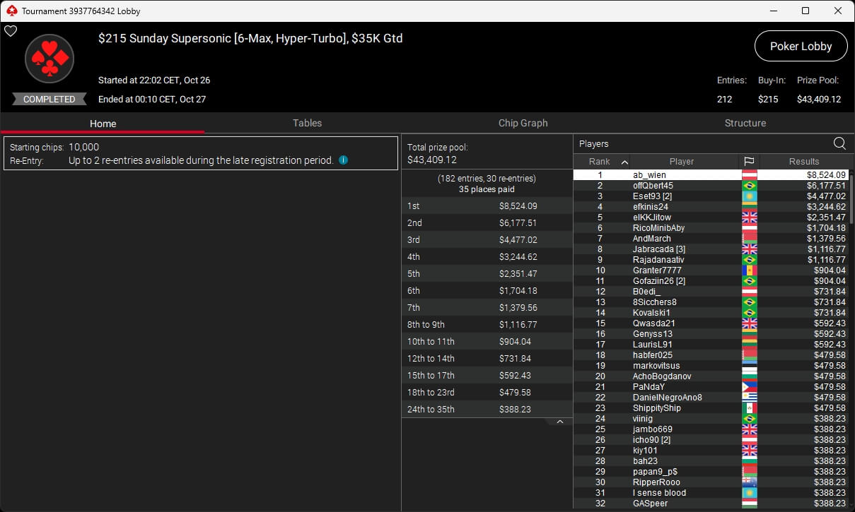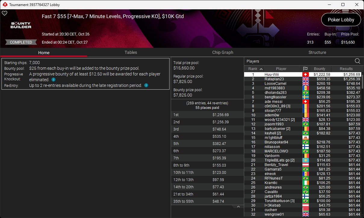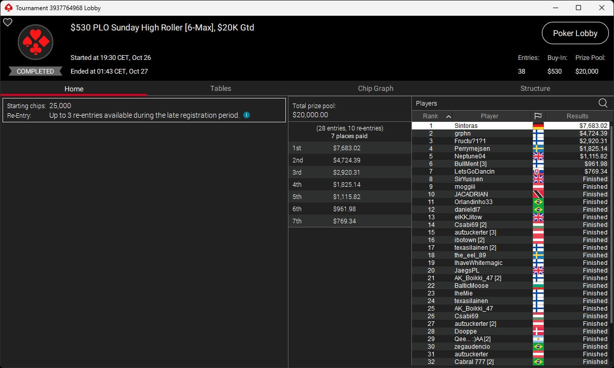 Titel gab es dann bei den regulären MTTs auf PokerStars. So gehörten Leon „RUMUKULUS“ Sturm ($10.360,40; $1.050 Sunday Supersonic), ab_wien ($8.524,09; $215 Sunday Supersonic), Sintoras ($7.683,02; $530 PLO Sunday High Roller), Huu-Wiii ($1.256,69 + $1.222,58; $55 Fast 7), 2019_HFM ($1.284,96; $82 Pacific Warm-Up), mats_lz ($273,04 + $498,43; $55 Hotter PKO) sowie kobyy ($1.427,40 + $1.556,23; $55 Mystery Express) zu den Siegern.