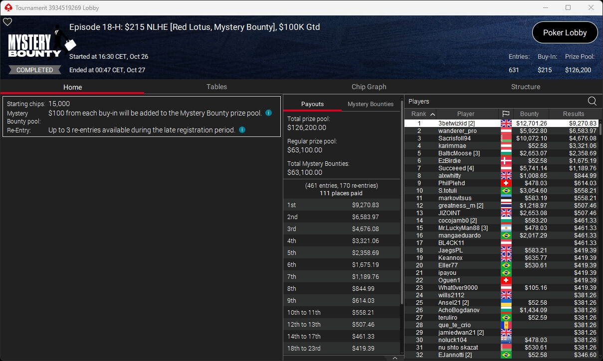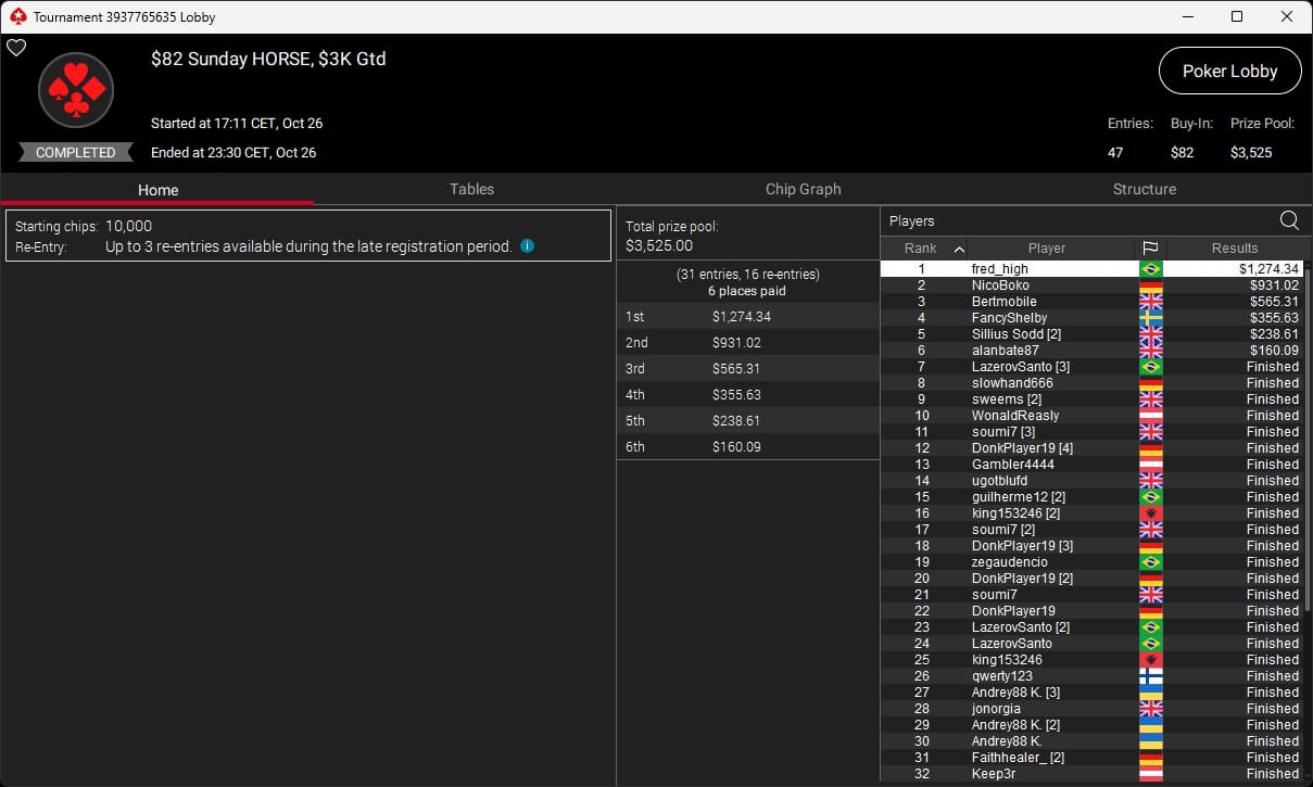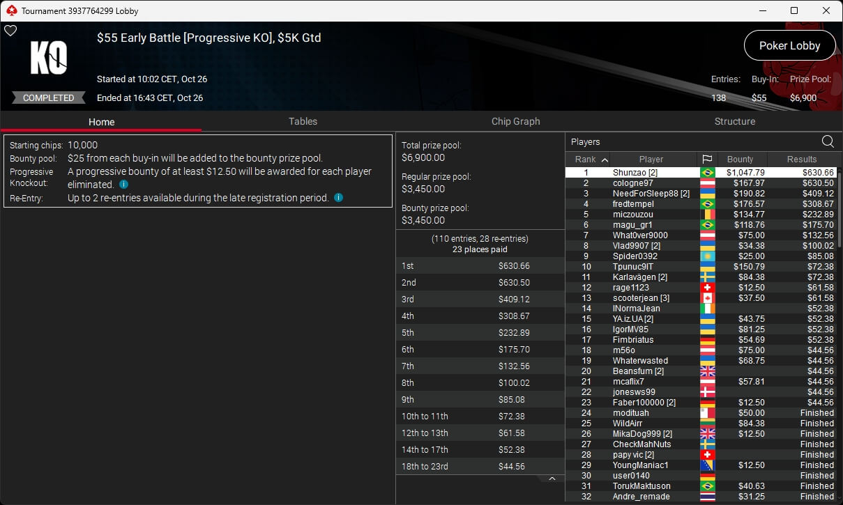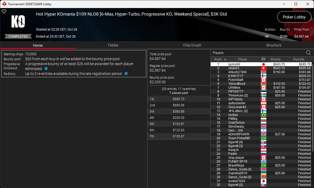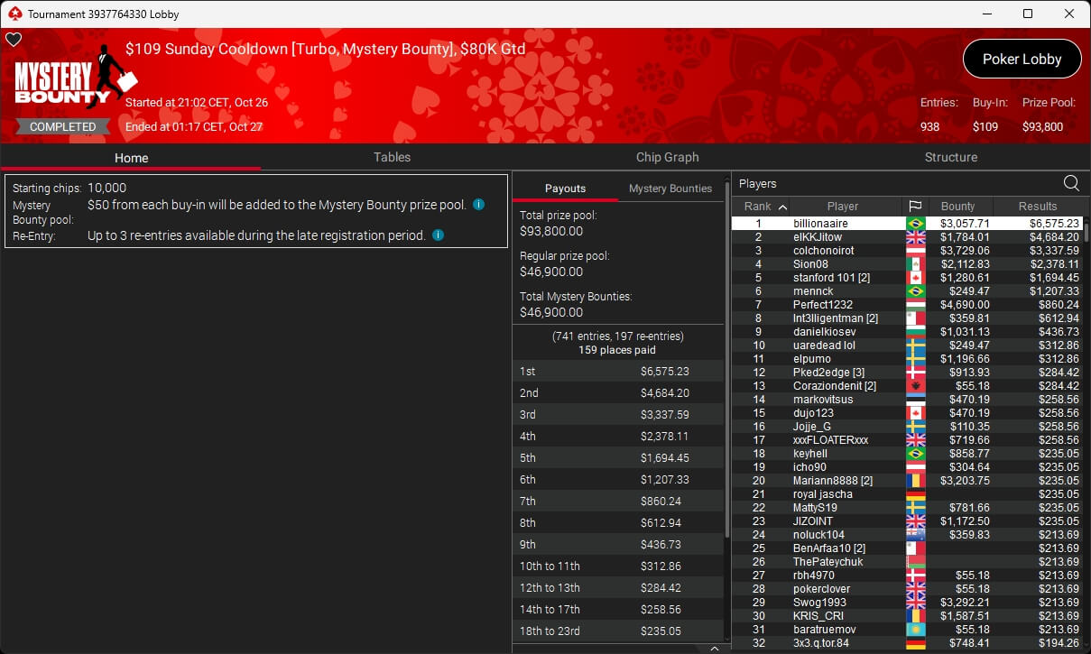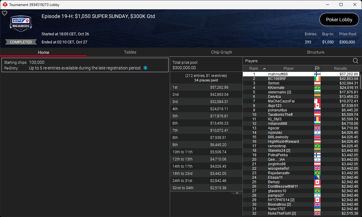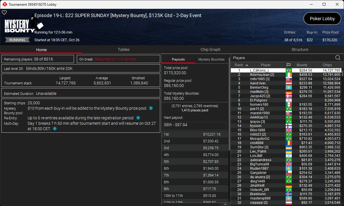 Titel gab es dann bei den regulären MTTs auf PokerStars. So gehörten Leon „RUMUKULUS“ Sturm ($10.360,40; $1.050 Sunday Supersonic), ab_wien ($8.524,09; $215 Sunday Supersonic), Sintoras ($7.683,02; $530 PLO Sunday High Roller), Huu-Wiii ($1.256,69 + $1.222,58; $55 Fast 7), 2019_HFM ($1.284,96; $82 Pacific Warm-Up), mats_lz ($273,04 + $498,43; $55 Hotter PKO) sowie kobyy ($1.427,40 + $1.556,23; $55 Mystery Express) zu den Siegern.