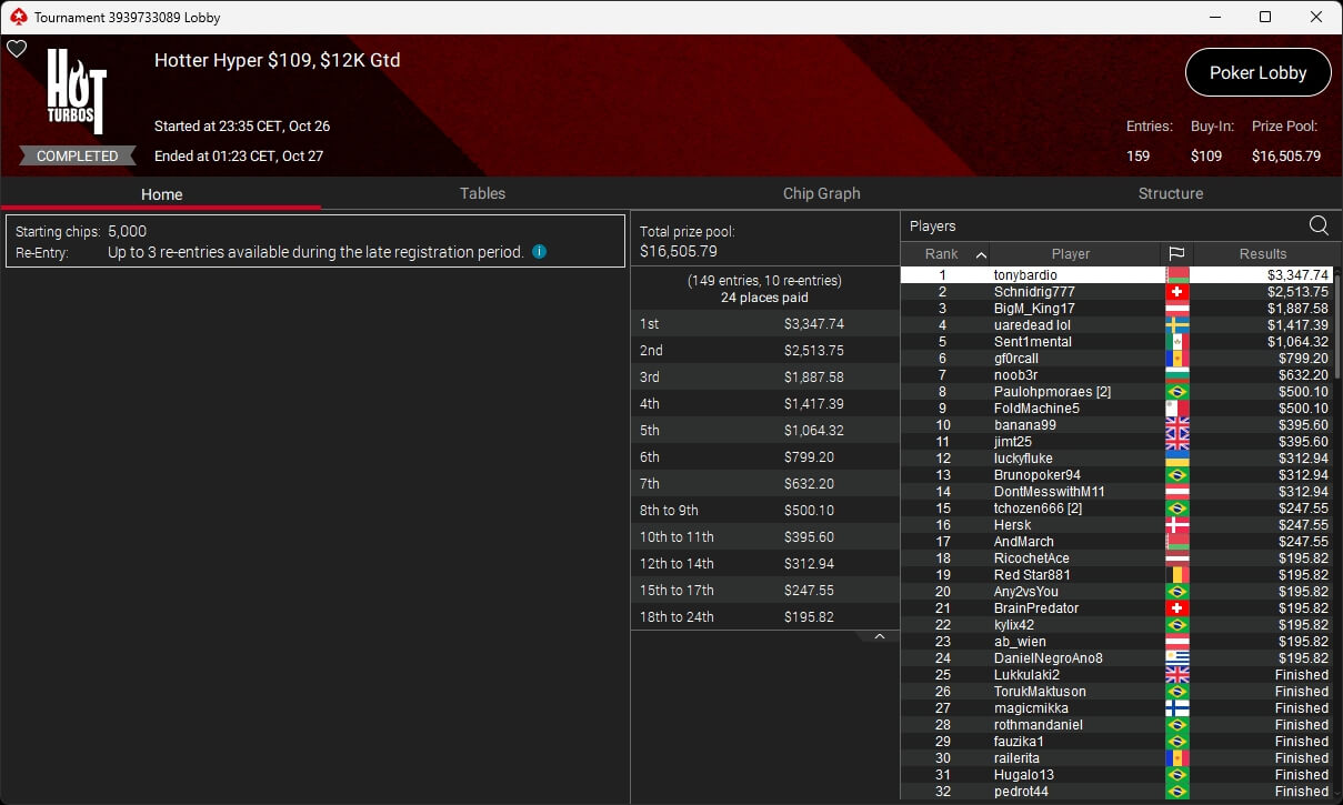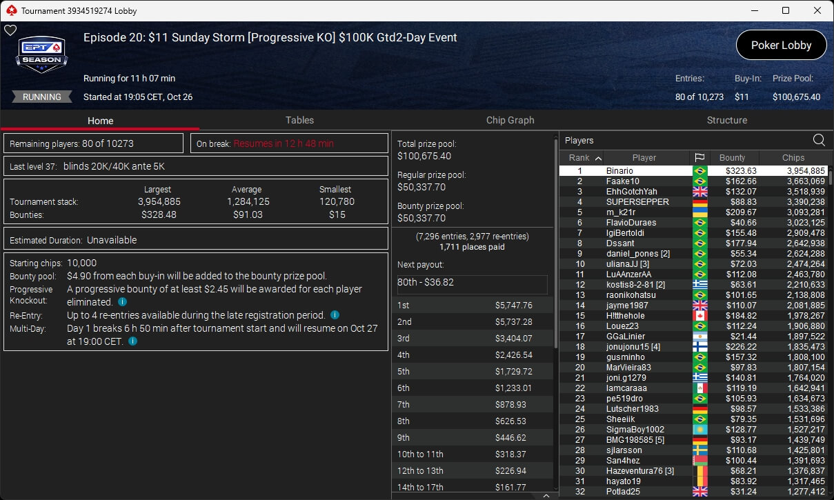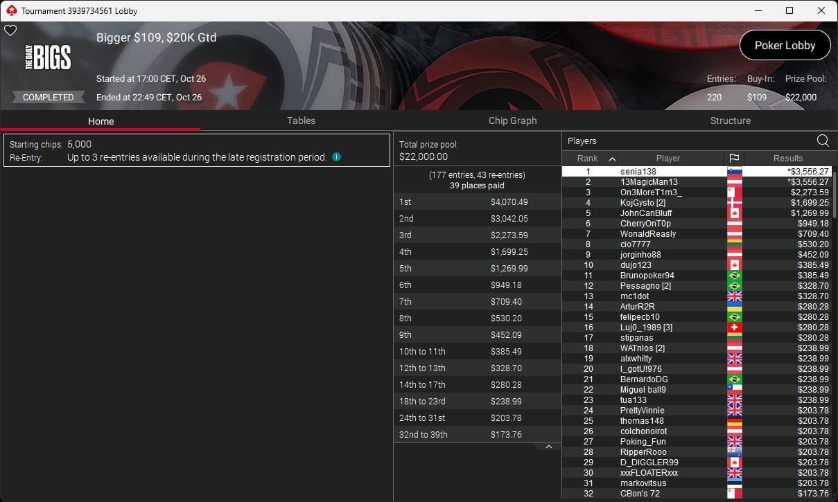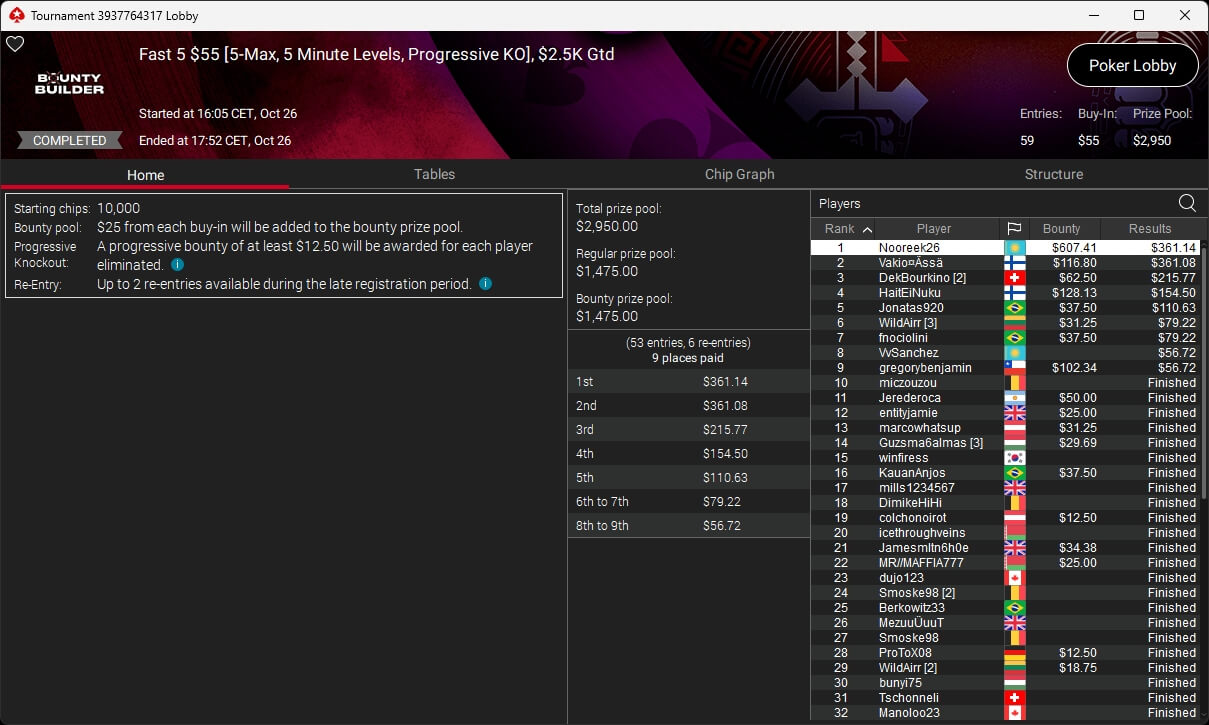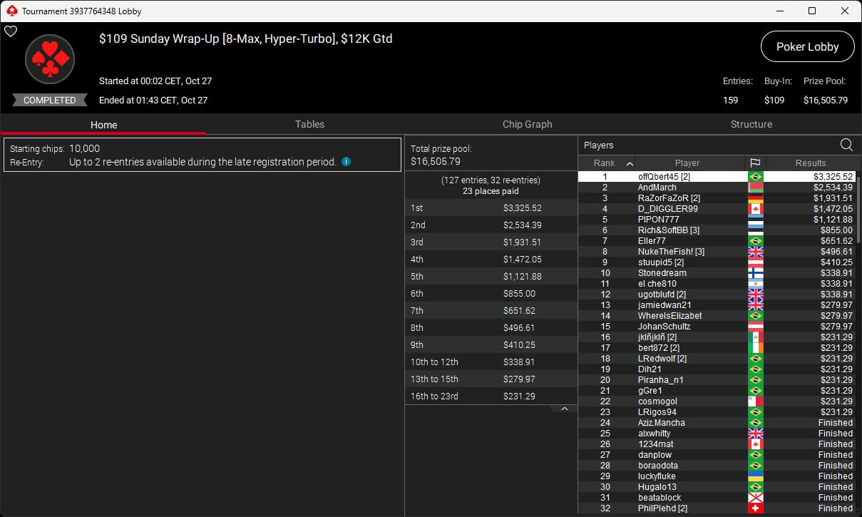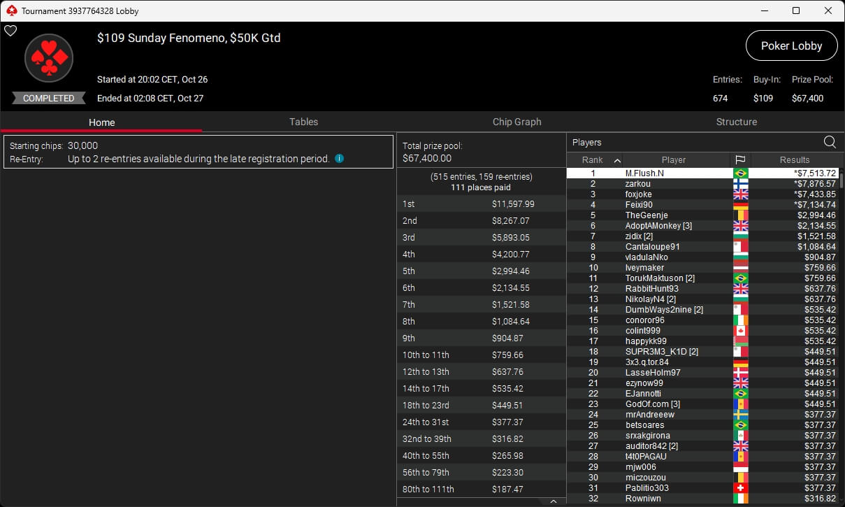 Titel gab es dann bei den regulären MTTs auf PokerStars. So gehörten Leon „RUMUKULUS“ Sturm ($10.360,40; $1.050 Sunday Supersonic), ab_wien ($8.524,09; $215 Sunday Supersonic), Sintoras ($7.683,02; $530 PLO Sunday High Roller), Huu-Wiii ($1.256,69 + $1.222,58; $55 Fast 7), 2019_HFM ($1.284,96; $82 Pacific Warm-Up), mats_lz ($273,04 + $498,43; $55 Hotter PKO) sowie kobyy ($1.427,40 + $1.556,23; $55 Mystery Express) zu den Siegern.