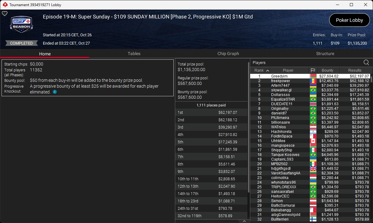 Bei der EPT Season 2025 schrammte die deutschsprachige Poker-Community zweimal knapp an Gold vorbei. Im $215 Red Lotus Mystery Bounty belegte wanderer_pro ($6.583,97 + $5.922,80) Rang 2. Im $1.050 Super Sunday musste sich Sxmon (3./$32.084,31) aus Österreich nur dem Finnen mahmuttt88 ($57.262,86) sowie Benjamin „BC1989RF“ Chalot (2./$42.863,04) geschlagen geben.