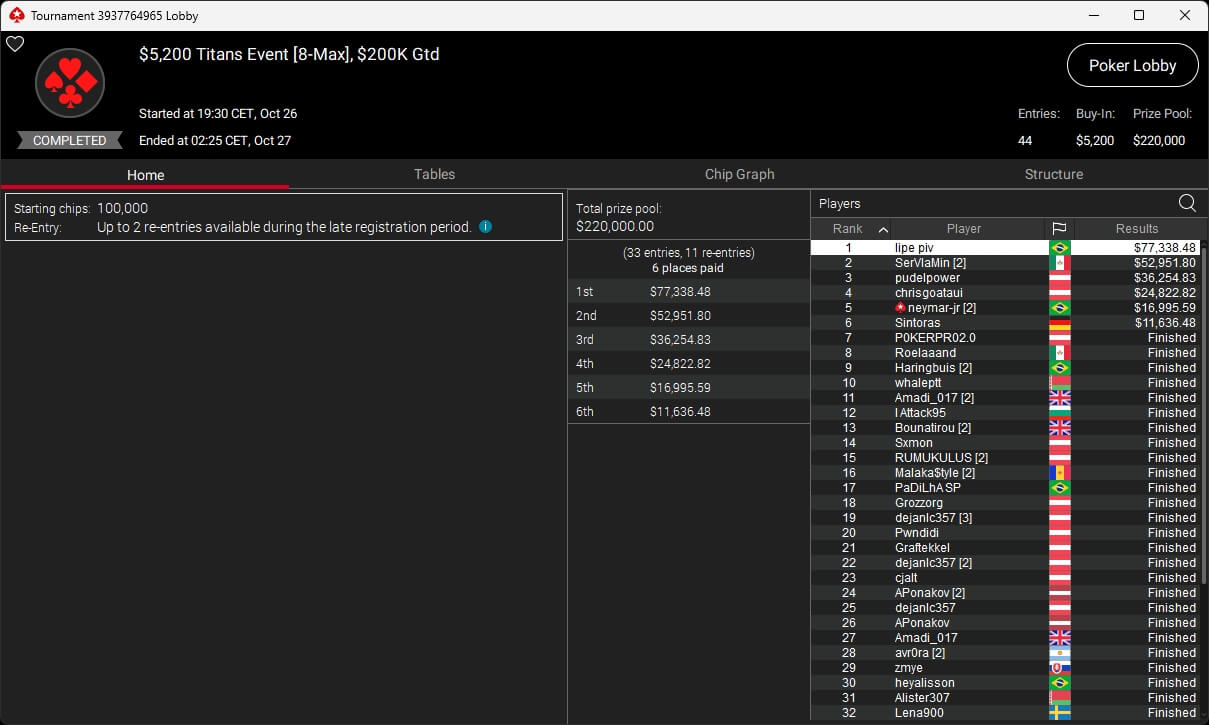 Im $5.200 Titans spielten 33 Teilnehmer um $220.000. Der Titel ging an den Brasilianer Felipe Boianovsky ($77.338,48). Vladimir „SerVlaMin“ Minko (2./$52.951,80) und Nils Pudel (3./$36.254,83) standen ebenfalls auf dem Treppchen. Zu den weiteren Finalisten gehörten chrisgoataui (4./$24.822,82), Neymar „neymar-jr“ Jr (5./$16.995,59) sowie Sintoras (6./$11.636,48). Bubble Boy wurde P0KERPR02.0.