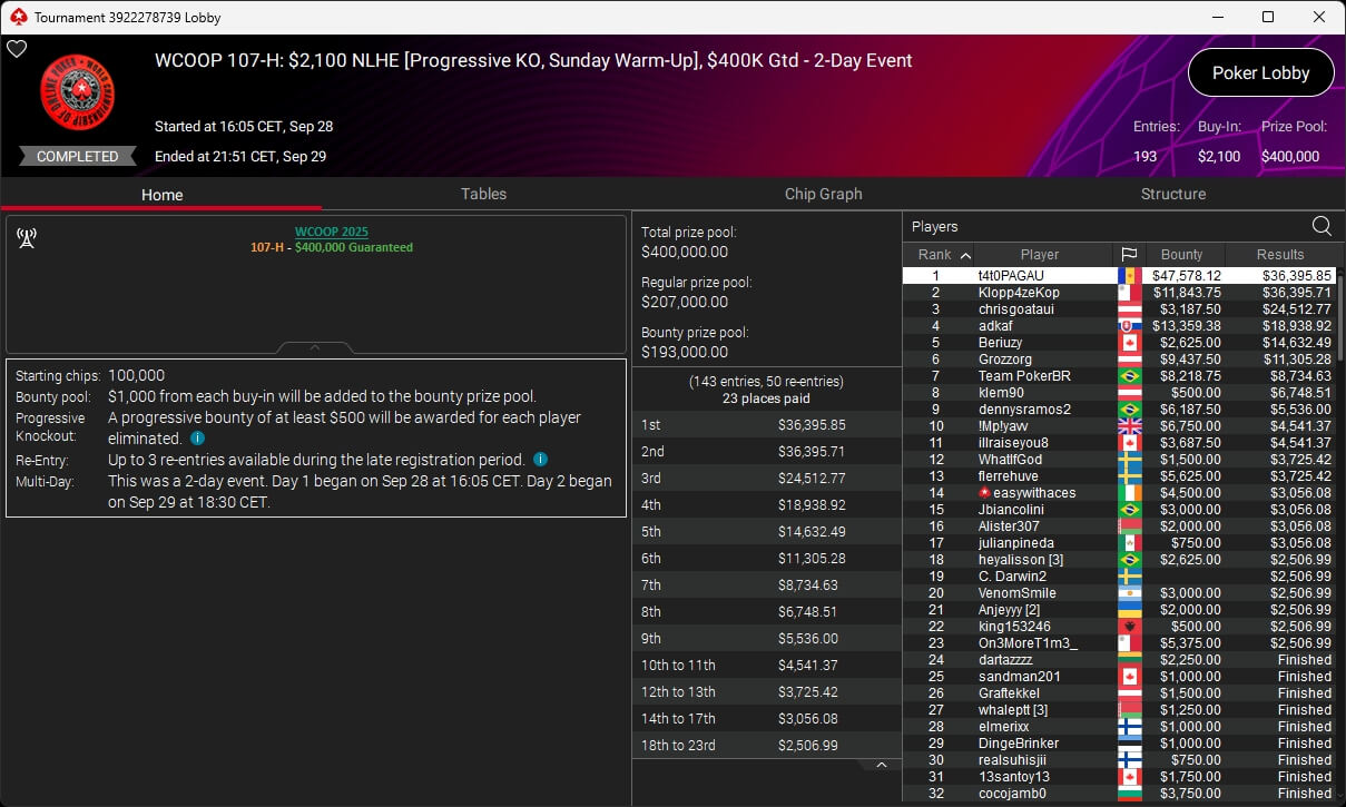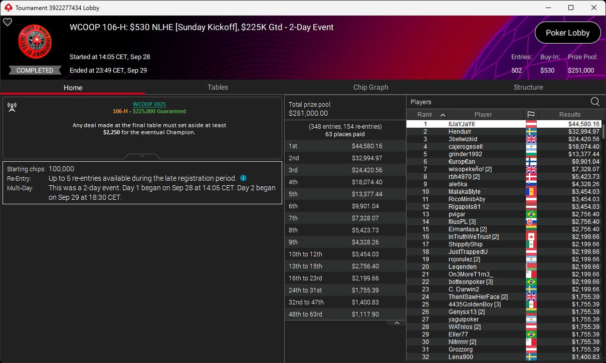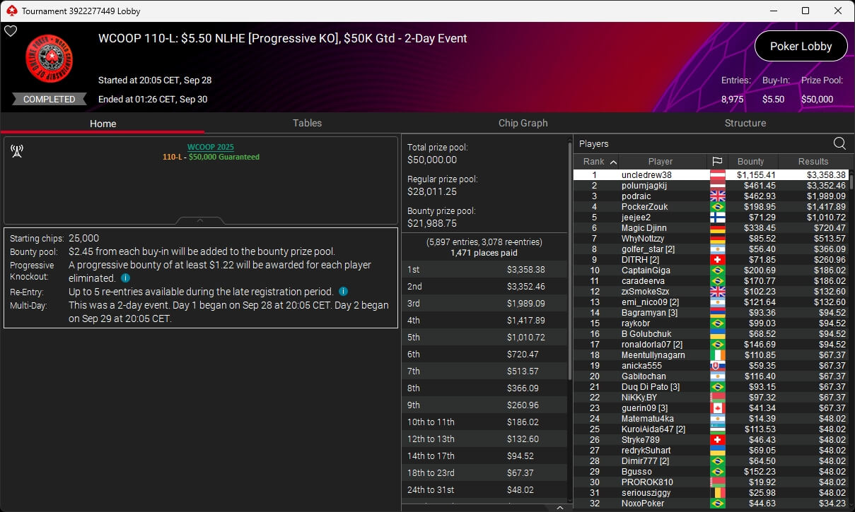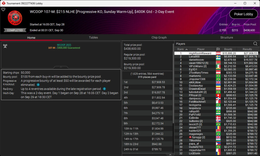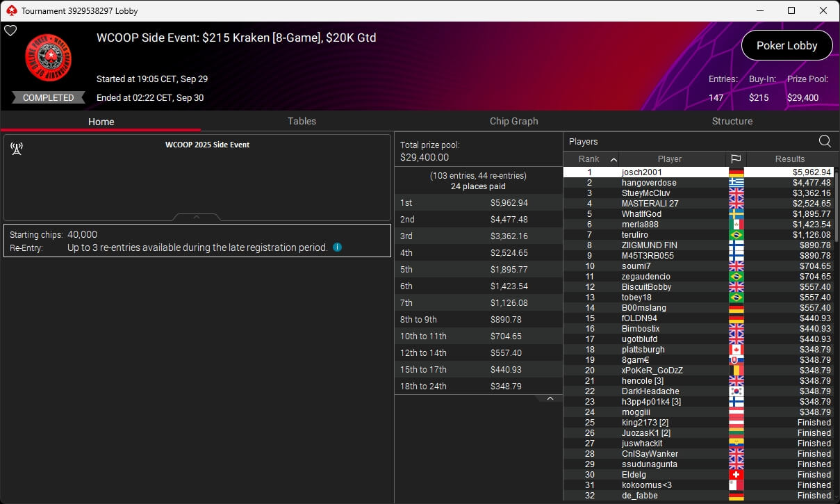 Jonas Lauck, HighRiskHReward und uncledrew38 haben bei der PokerStars World Championship of Online Poker 2025 Siege eingespielt. josch2001 siegte bei den WCOOP Side Events.