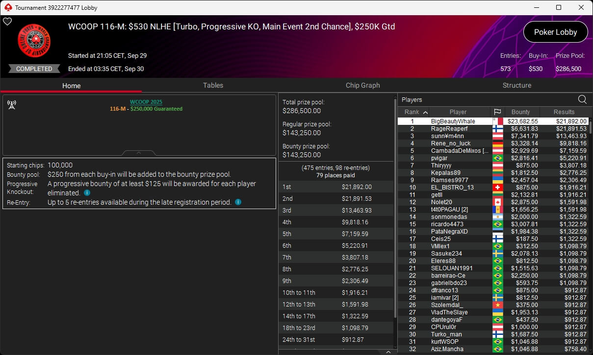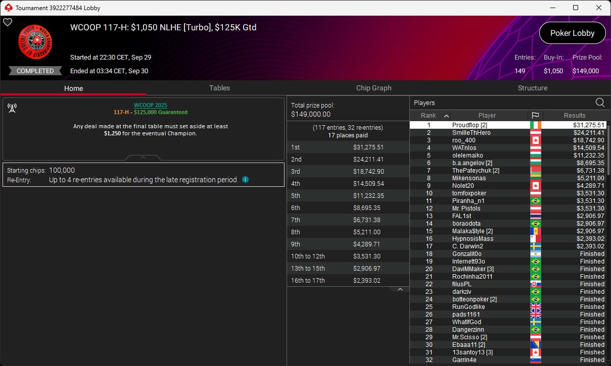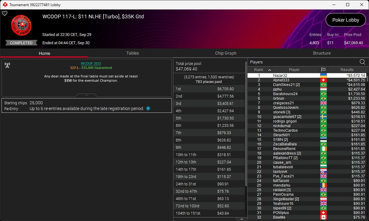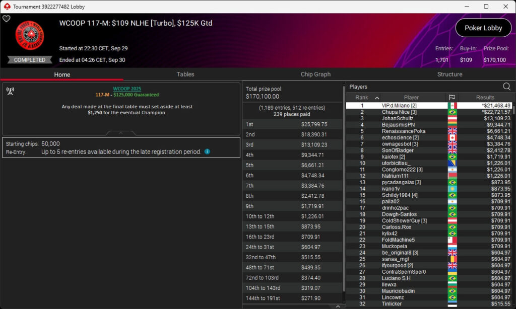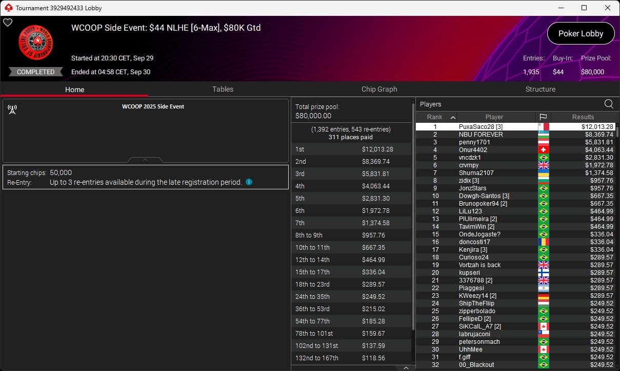 Jonas Lauck, HighRiskHReward und uncledrew38 haben bei der PokerStars World Championship of Online Poker 2025 Siege eingespielt. josch2001 siegte bei den WCOOP Side Events.