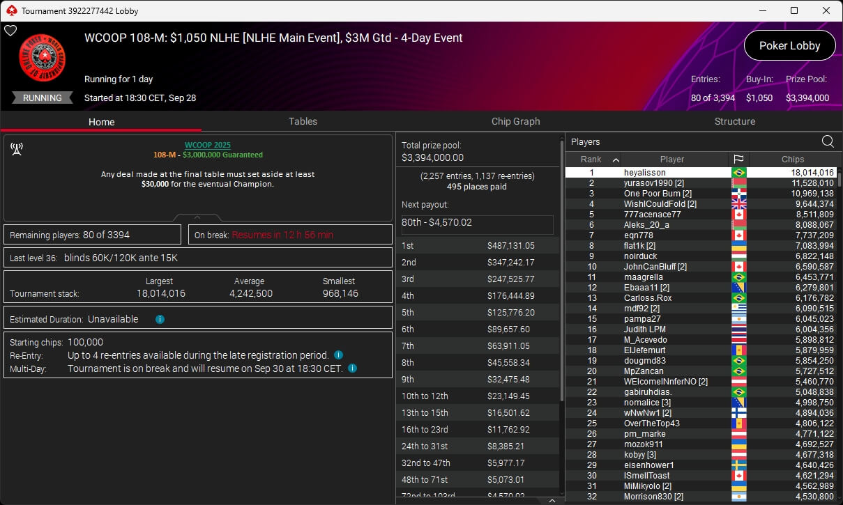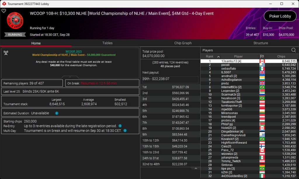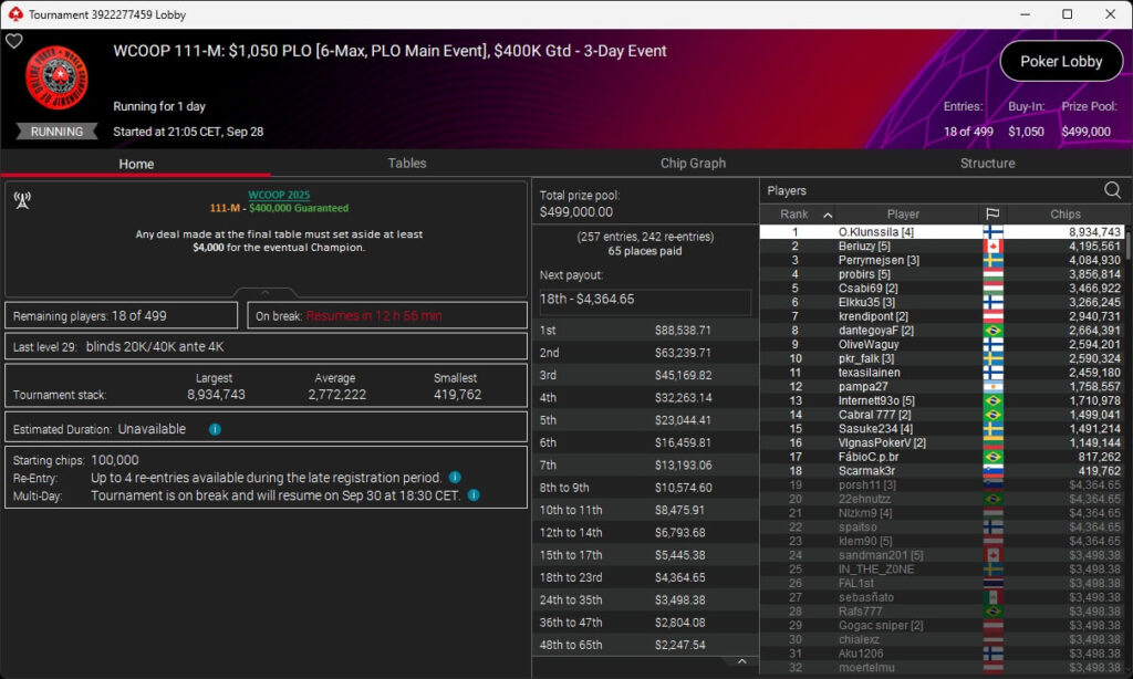 Ebenfalls geknackt wurden die $3 Millionen GTD im $1k Main Event. Dort stehen 80 Spieler in Day 3, darunter Ole „wizowizo“ Schemion (Rang 59), der es auch im $10k Main Event in die nächste Runde geschafft hat. Dort liegt der Deutsche auf Rang 26 von 39 verbliebenen Spielern.
