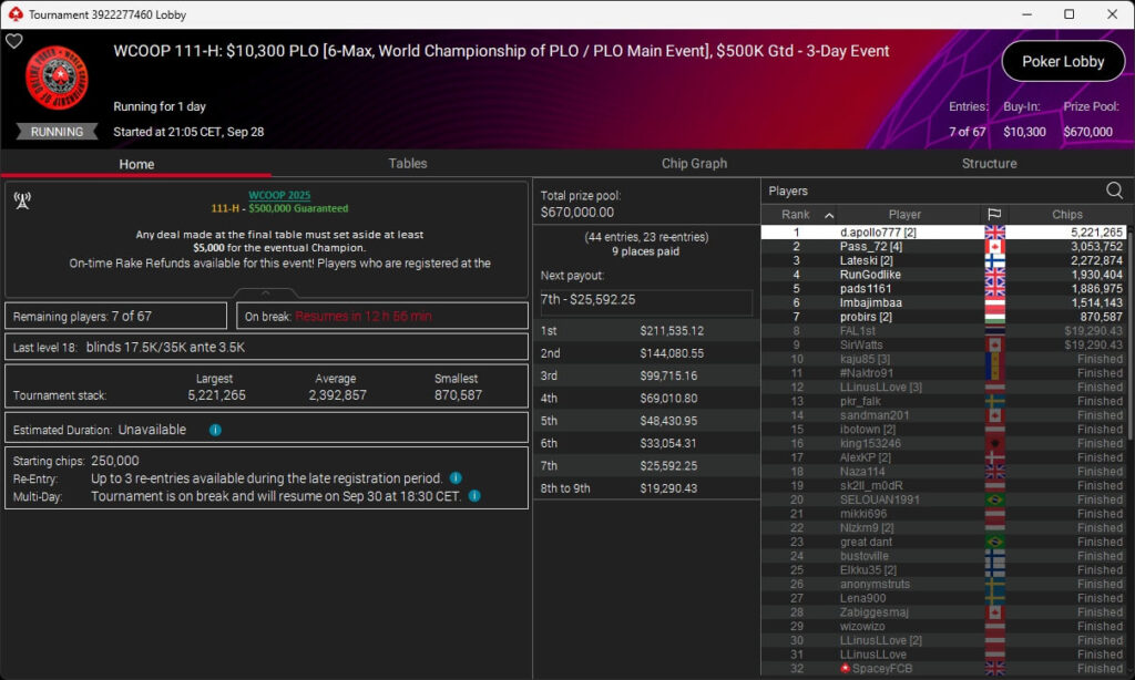 Beim PLO Main Event wird heute Abend der Final Table gespielt. Im $109 PLO Main Event gehen 18 Spieler in die Entscheidung, darunter OneH1tWonder (Rang 14) aus Österreich. Im $1k PLO Main Event gehört krendipont (Rang 7) zu den 18 Finalisten und im $10k PLO Main Event sitzt mit dem Dänen Martin „Imbajimbaa“ Dam zumindest ein Wahlösterreicher am Finaltisch.