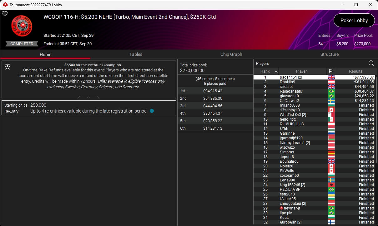 Im $5.200 Main Event 2nd Chance Turbo unterlag RhoNin9 (2./$81.911,35) nach Heads-Up-Deal gegen Patrick „pads1161“ Leonard ($77.990,37). Ebenfalls auf dem Treppchen standen chrisgoataui (3./$24.512,77 + $3.187,50; $2.100 Sunday Warm-Up PKO) und JohanSchultz (3./$13.109,23; $109 NLHE Turbo).