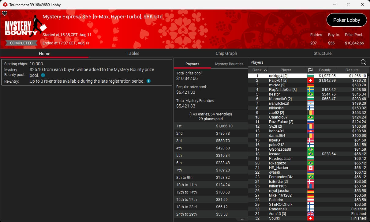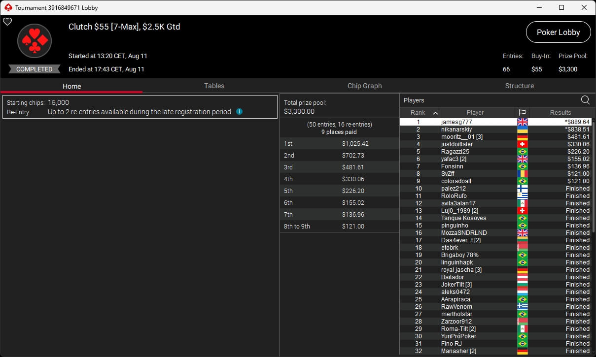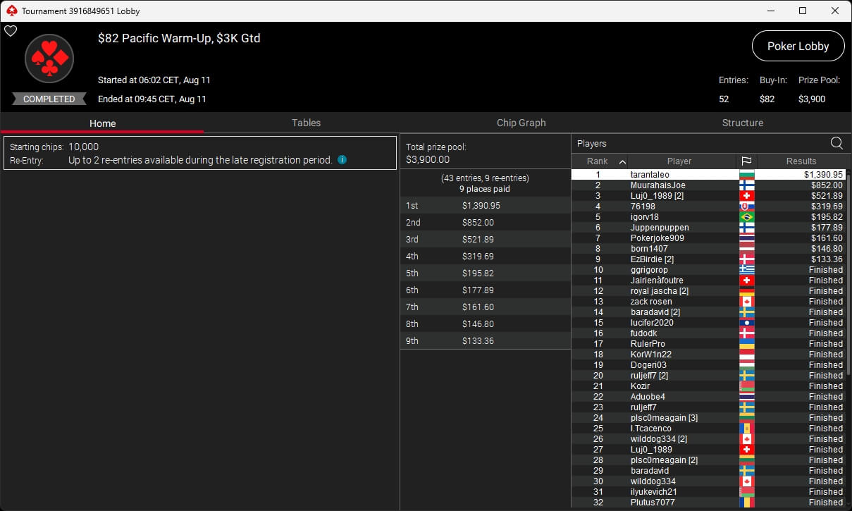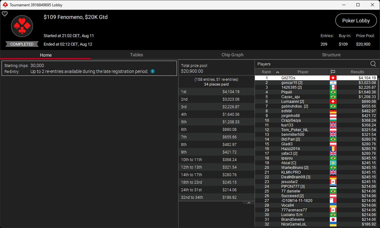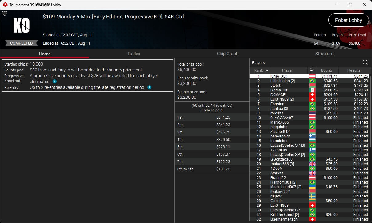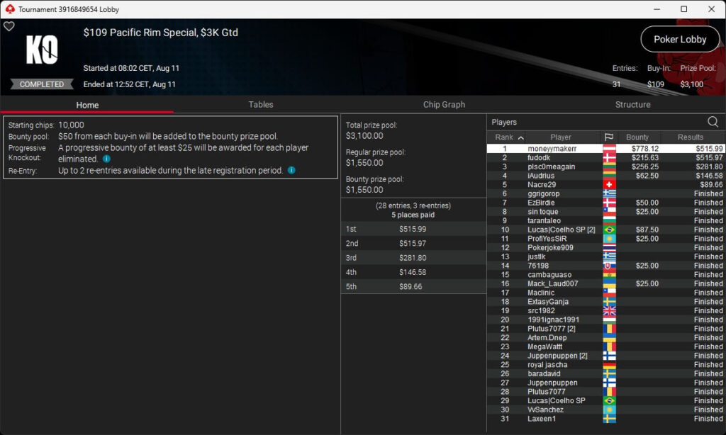 Auch bei den Side Events waren die Spieler aus unseren Breitengraden erfolgreich. Titel gingen an moneyymakerr ($515,99 + $778,12; $109 Pacific Rim Special), lumo_Aut ($841,25 + $1.111,71; $109 Monday 6-Max), Gil27Ds ($4.104,19; $109 Fenomeno) und Layback6 ($394,69 + $601,56; $55 NLO8 Hot Hyper KOmania).