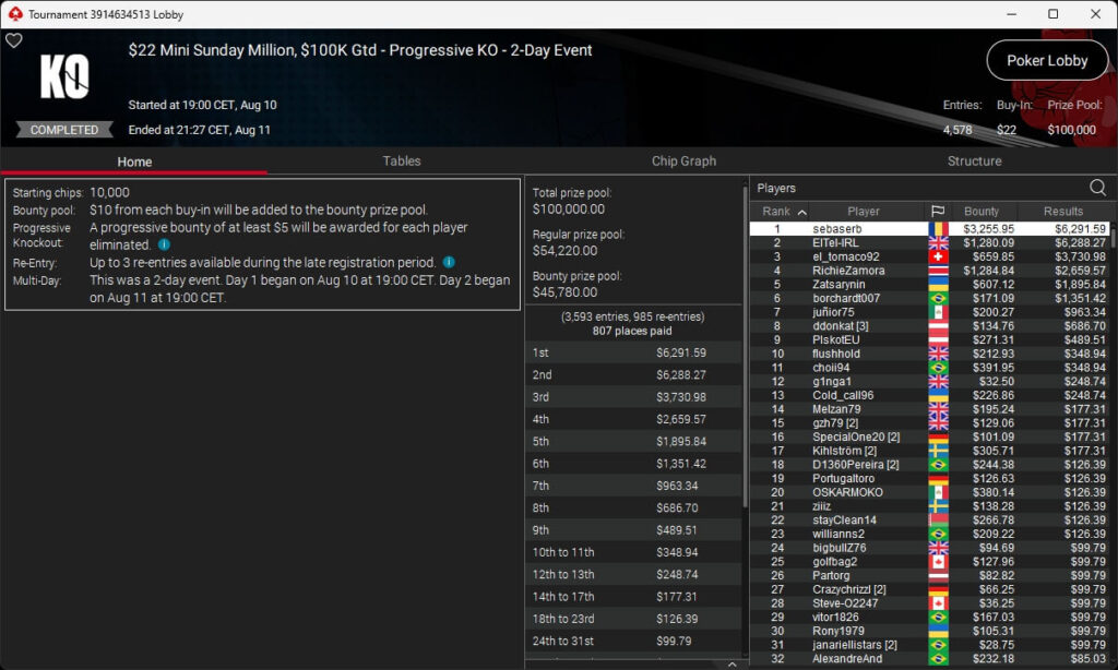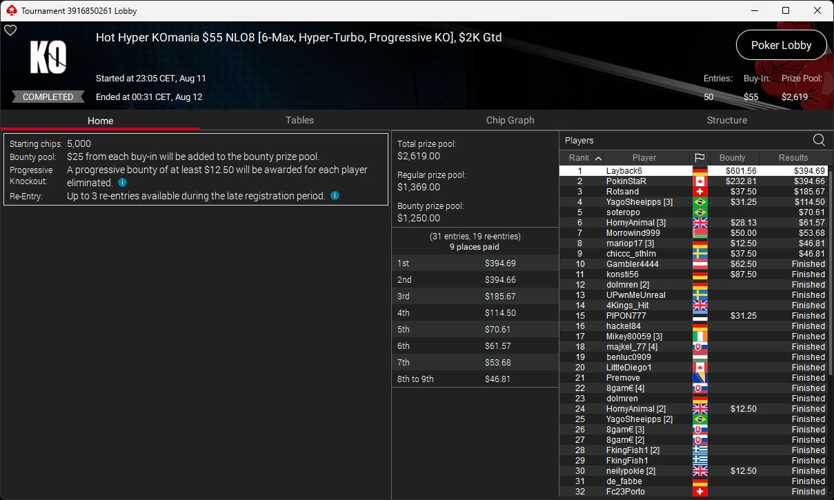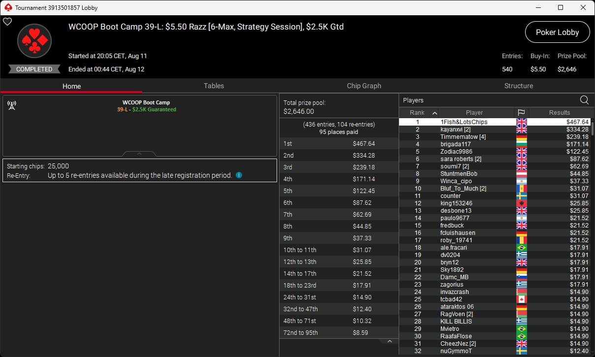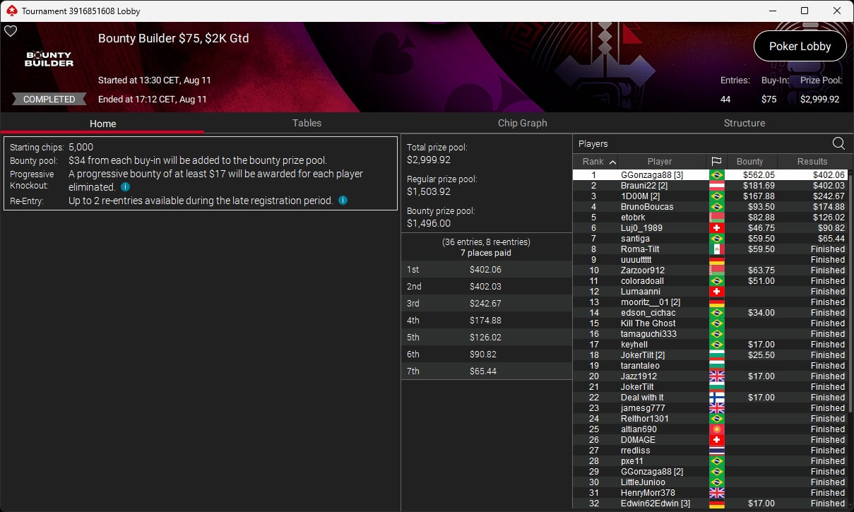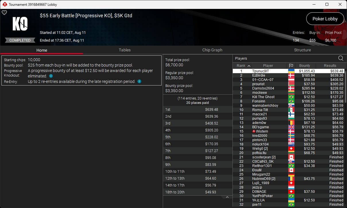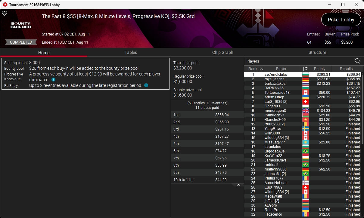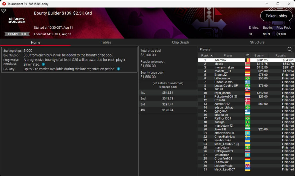 Auch bei den Side Events waren die Spieler aus unseren Breitengraden erfolgreich. Titel gingen an moneyymakerr ($515,99 + $778,12; $109 Pacific Rim Special), lumo_Aut ($841,25 + $1.111,71; $109 Monday 6-Max), Gil27Ds ($4.104,19; $109 Fenomeno) und Layback6 ($394,69 + $601,56; $55 NLO8 Hot Hyper KOmania).