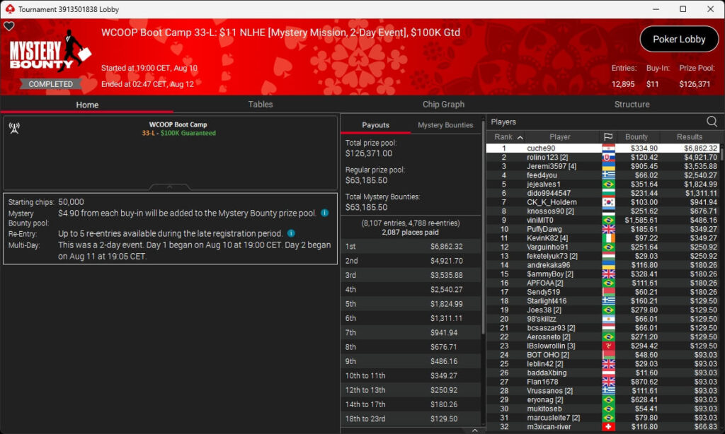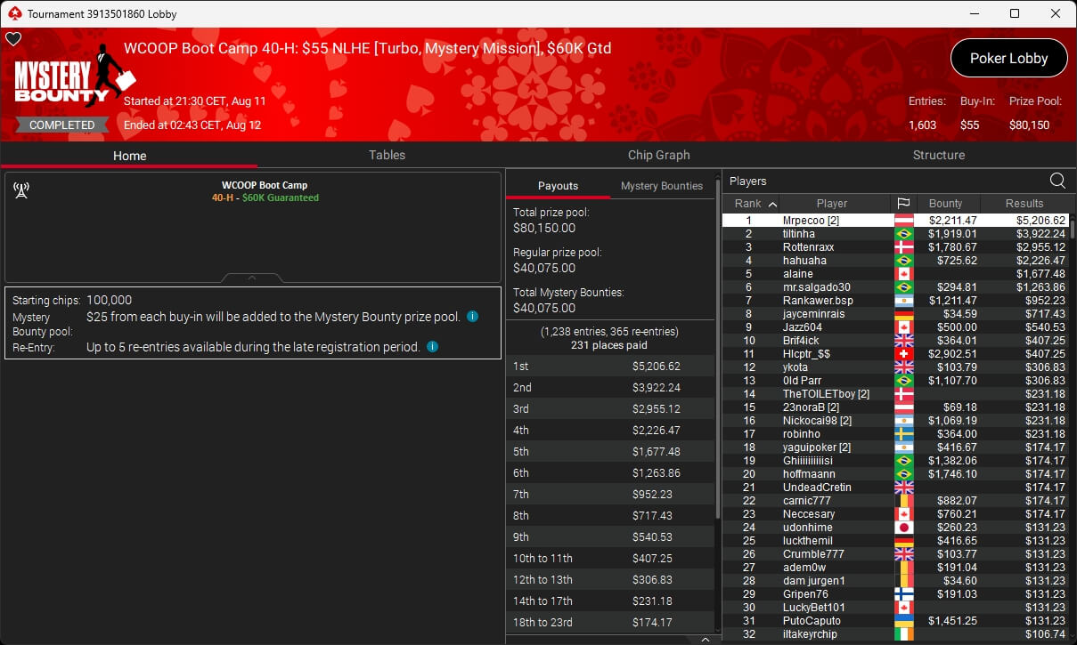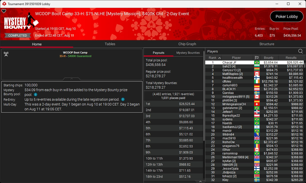 Ein weiterer erfolgreicher Tag für die deutschsprachige Poker-Community. Beim WCOOP Boot Camp auf PokerStars erspielten sich Mastermandel ($7.844,03 + $7.048,05; $55 Mini Bounty Builder HR) und Mrpecoo ($5.206,62 + $2.211,47; $55 Mystery Mission) Gold.